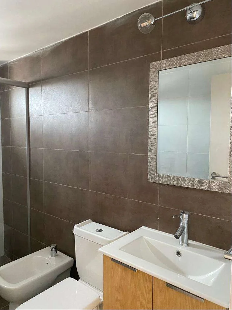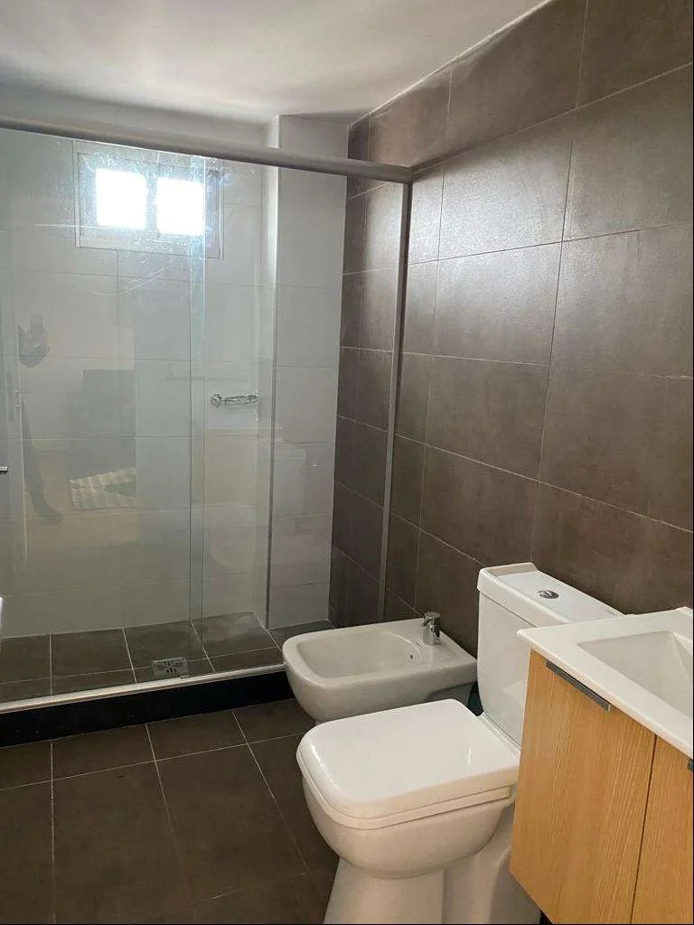 Baño completo con mampara. Dormitorio de buen tamaño con placard y sommier de 2 plazas. Terraza con excelente vista a la ciudad.