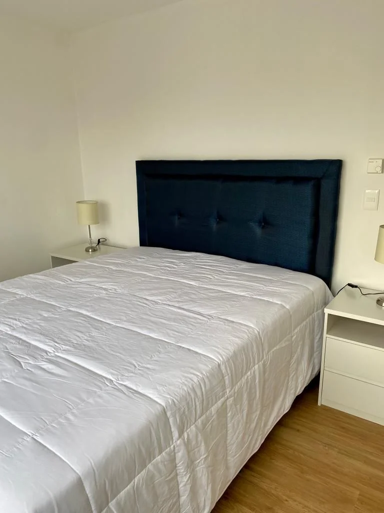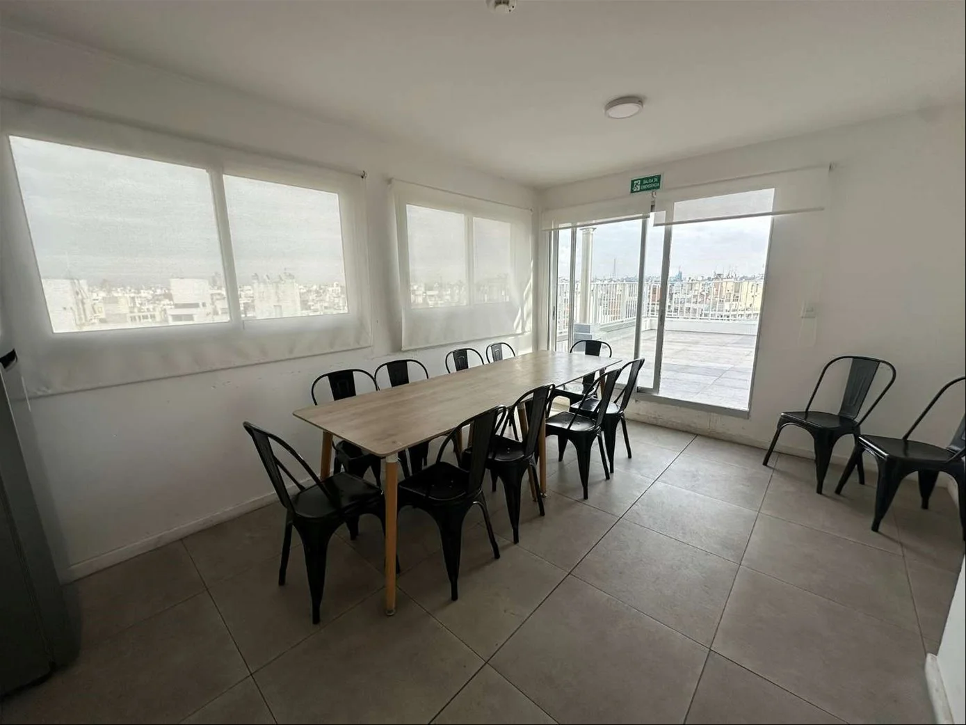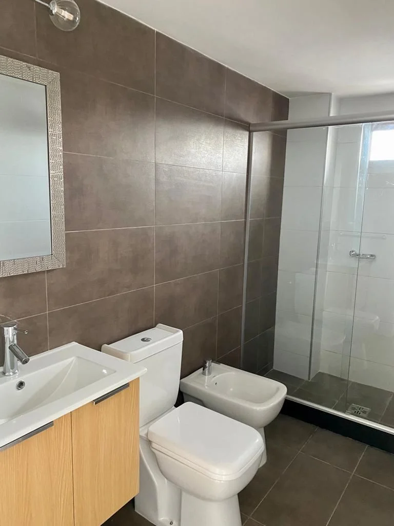 Baño completo con mampara. Dormitorio de buen tamaño con placard y sommier de 2 plazas. Terraza con excelente vista a la ciudad.