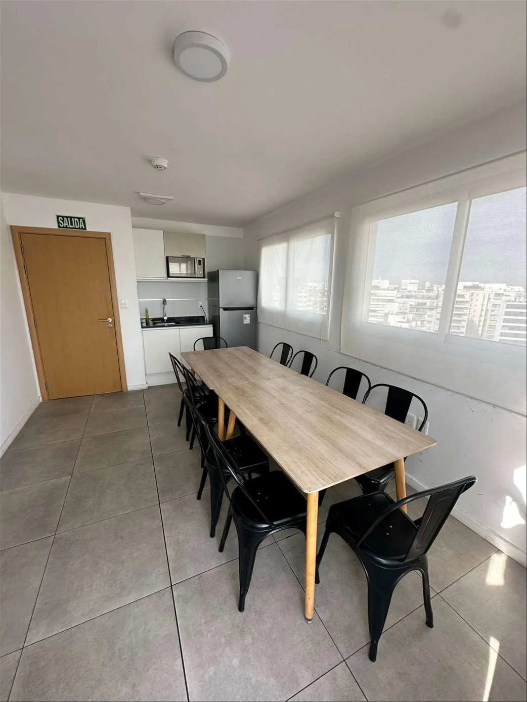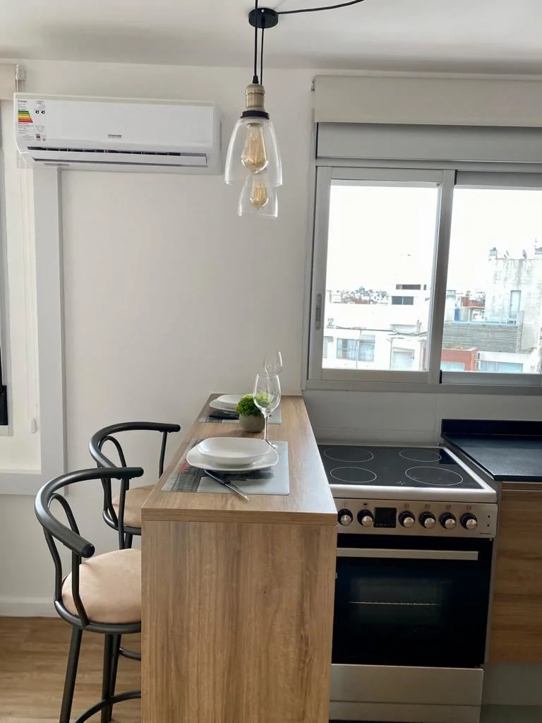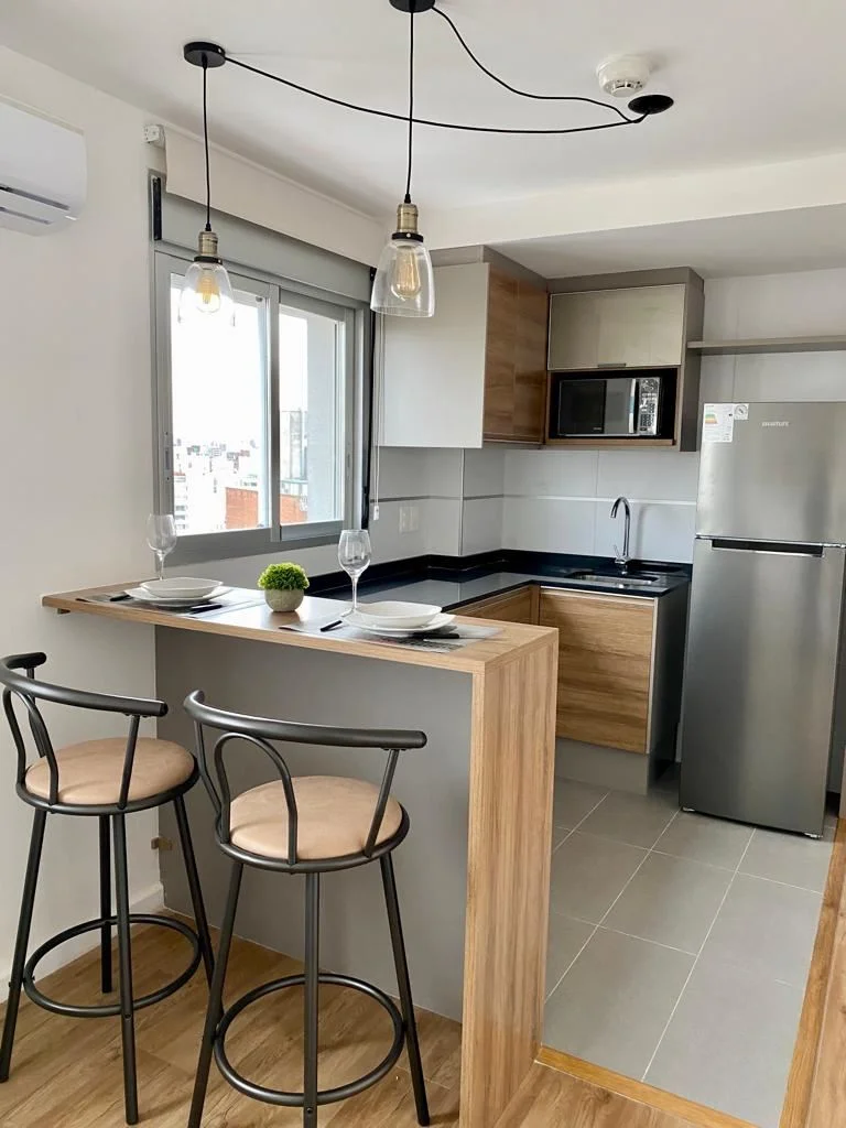 Amplio living comedor con cocina integrada con anafe, horno, campana, heladera y microondas. Barra con banquetas.