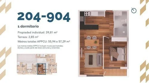 Unidad 904 - Se trata de un apartamento de 42,66 m2 compuesto por: 1 dormitorio, living-comedor con salida a terraza, cocina integrada y baño.