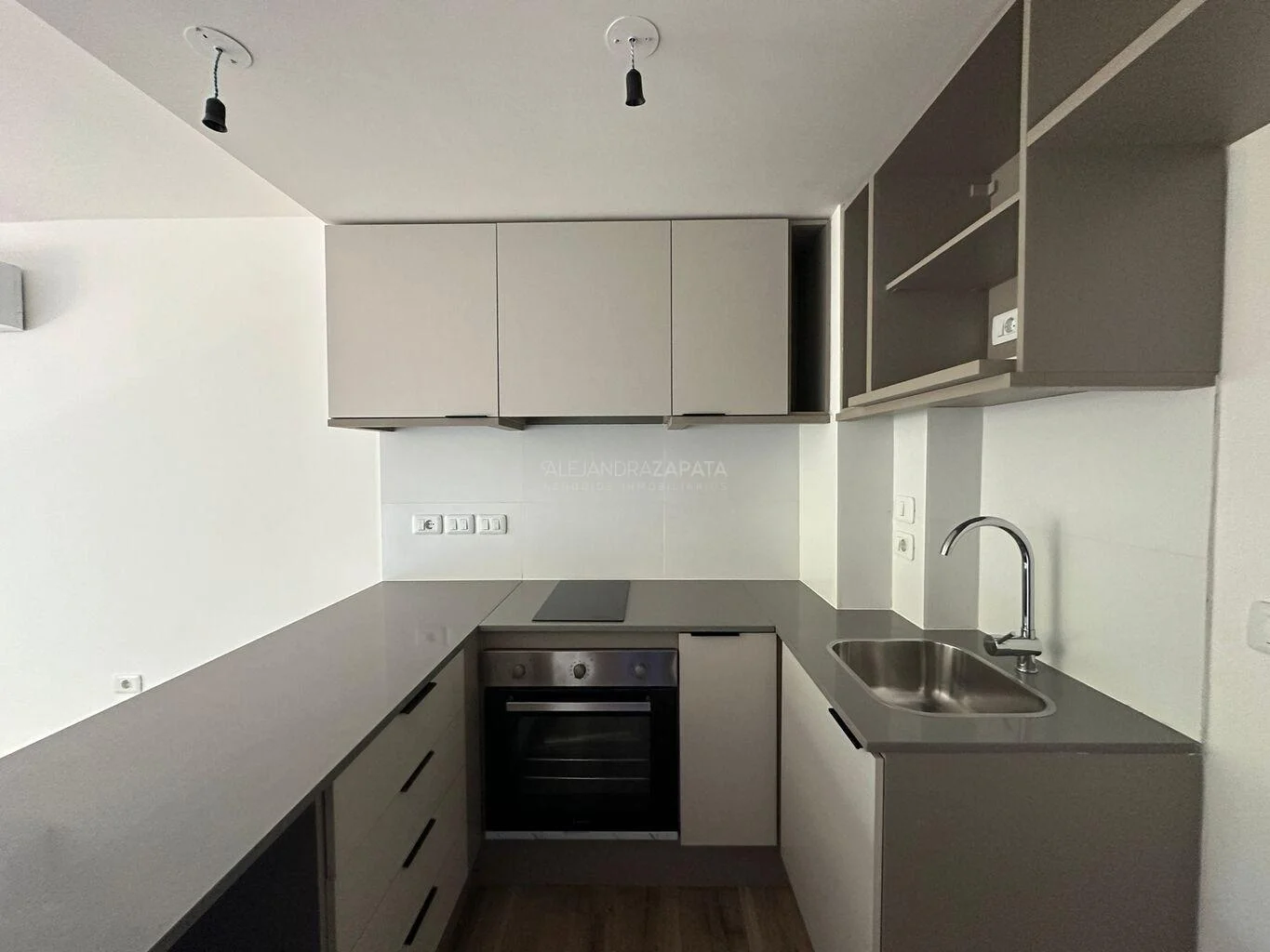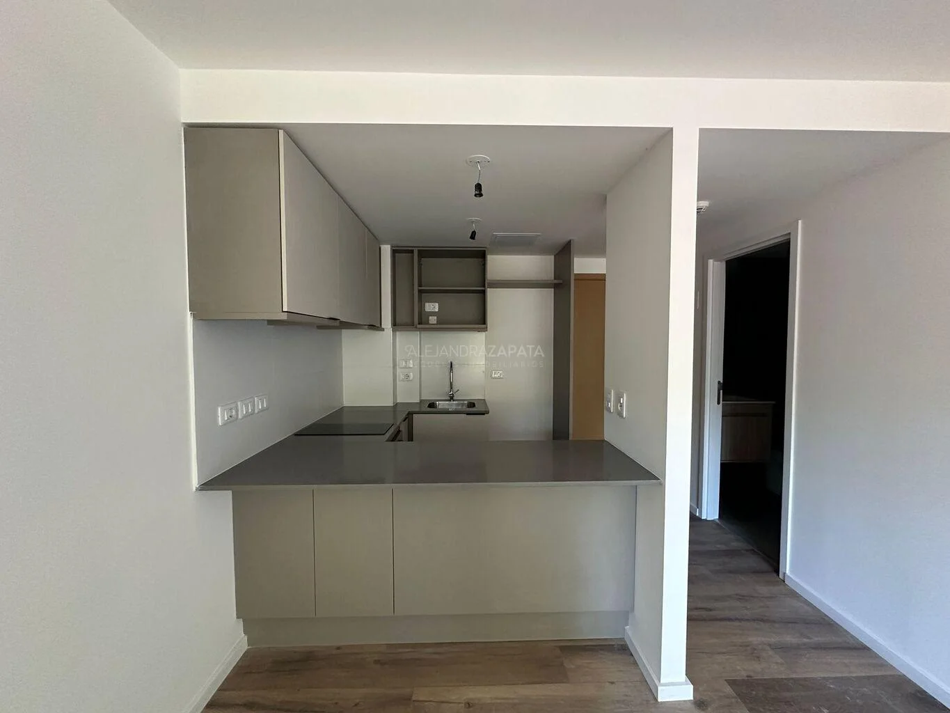 Amplio living comedor con cocina integrada, equipada con anafe de inducción, horno y campana extractora.