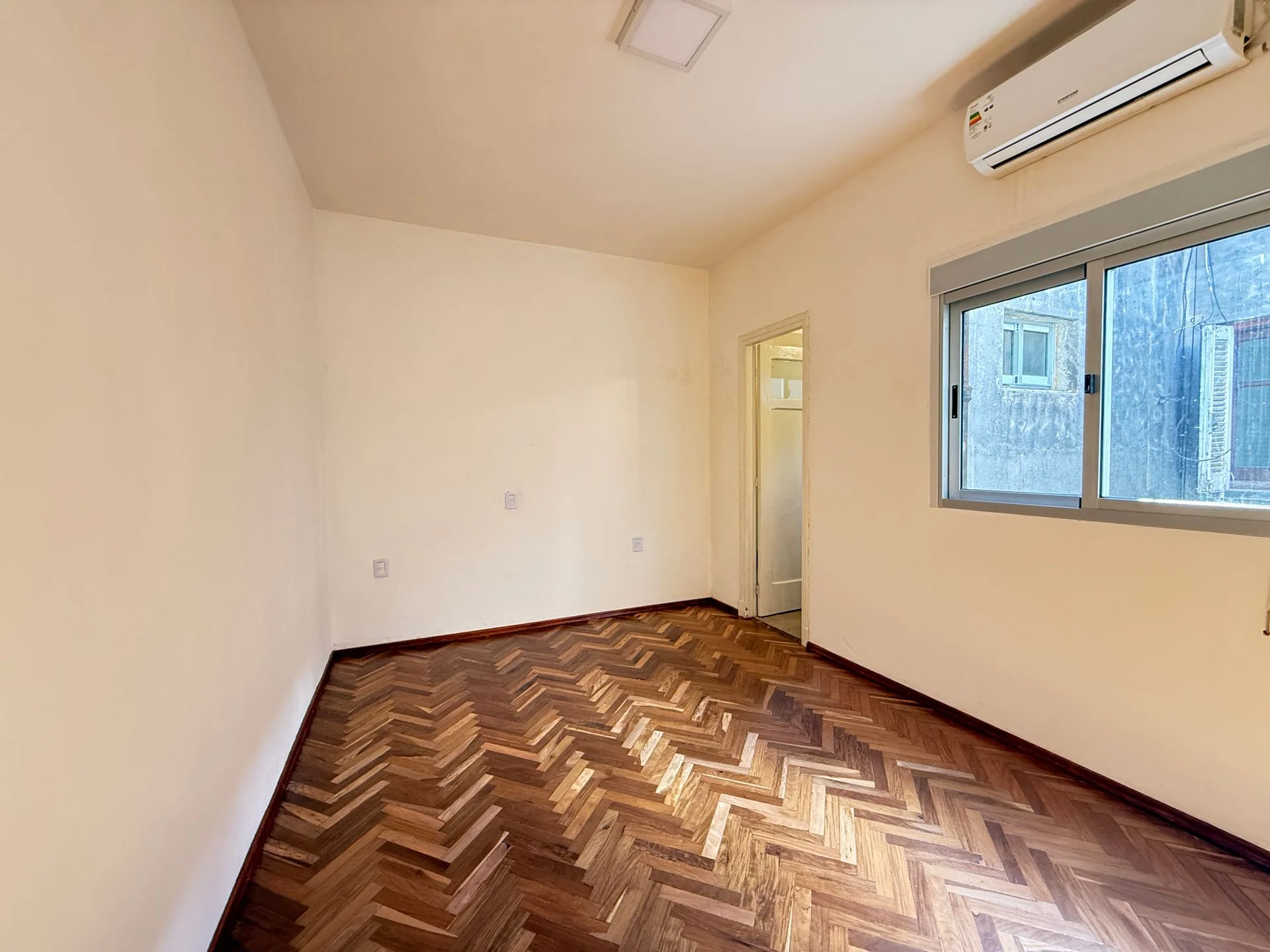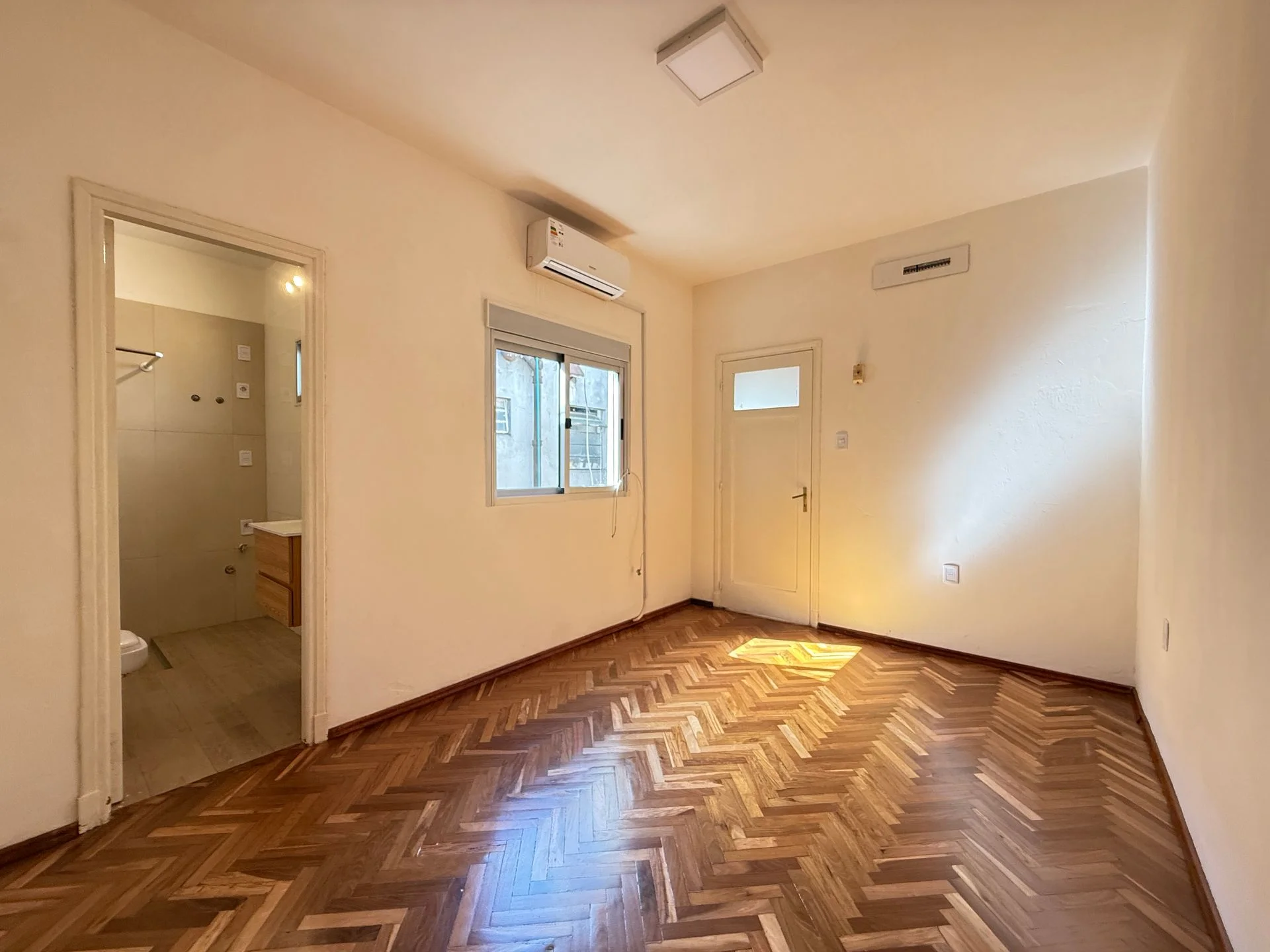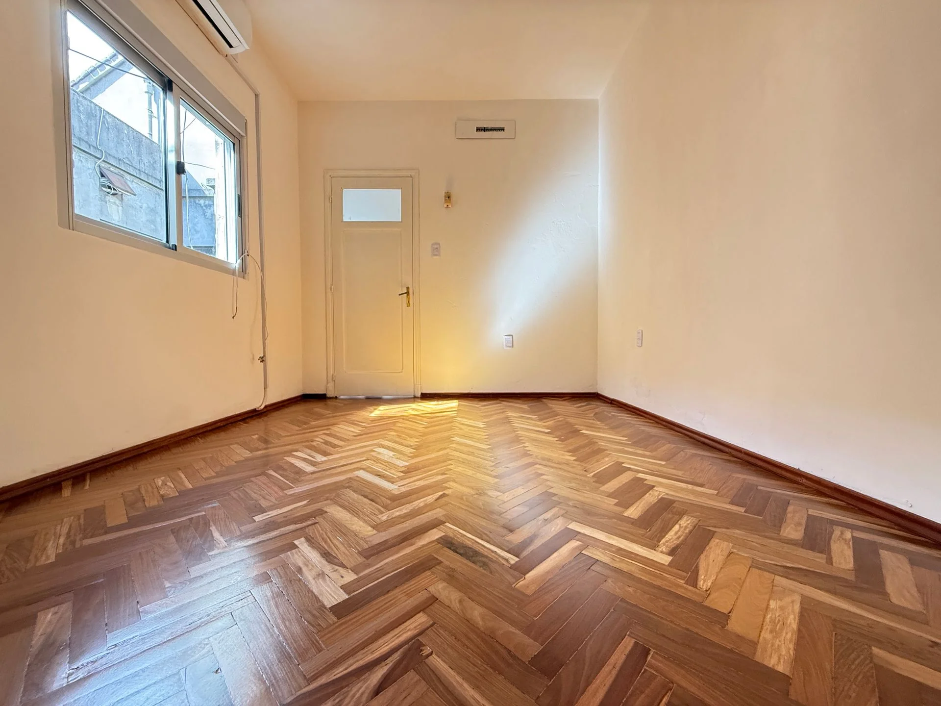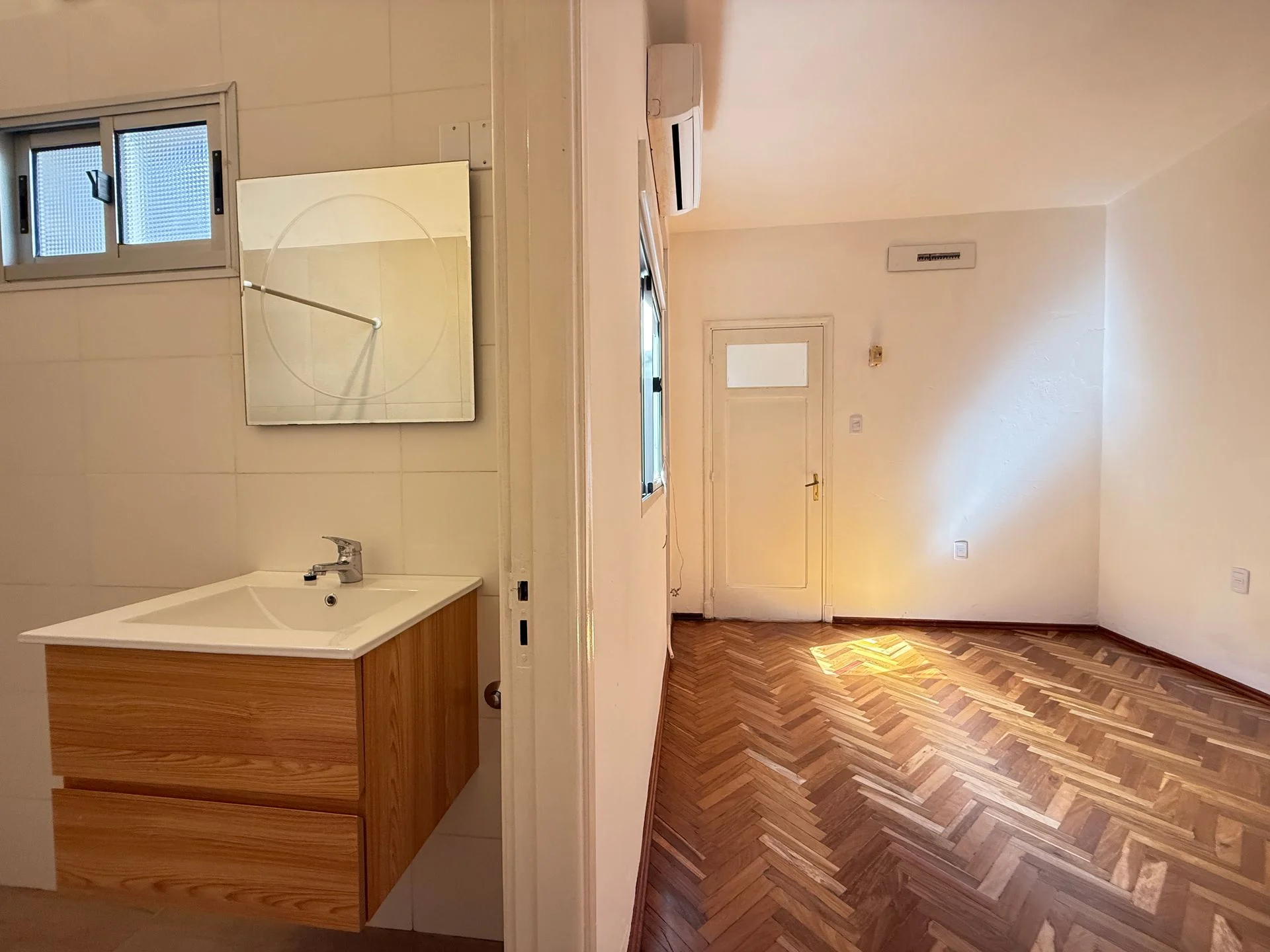 Dormitorio amplio, con piso de parquet y aire acondicionado. Baño reciclado a nuevo, completo, con instalación para lavarropas.