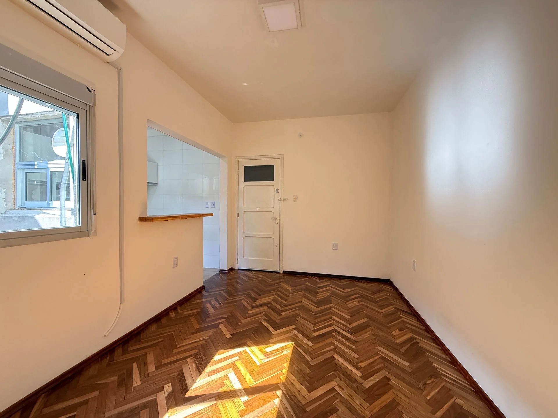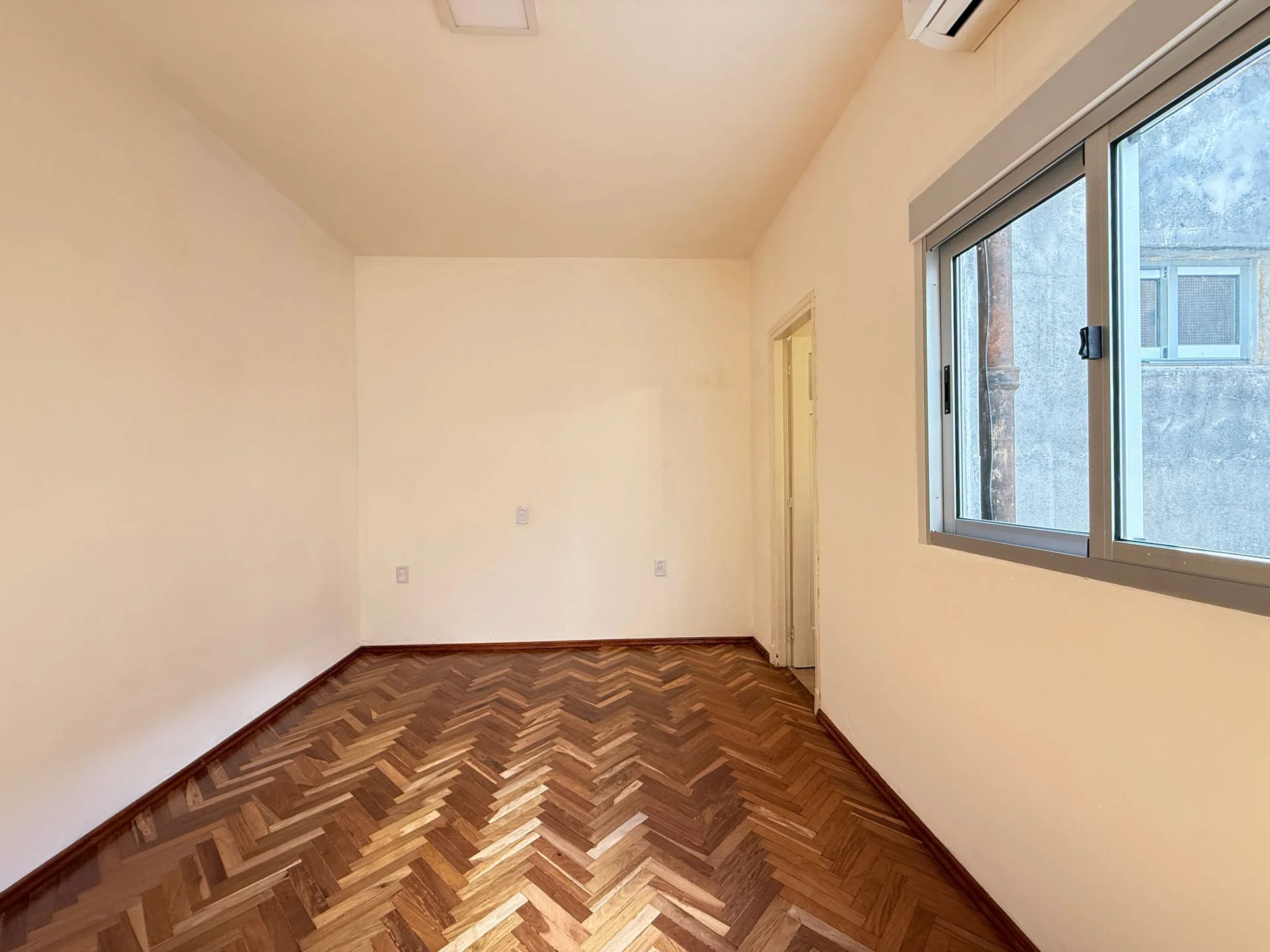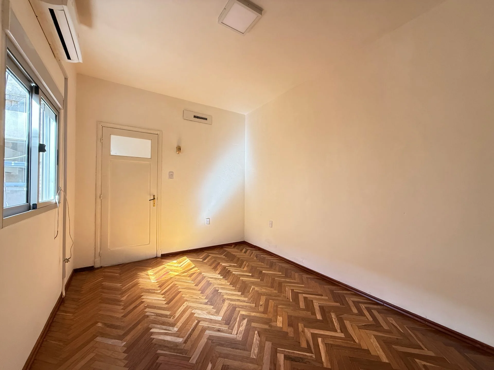 Dormitorio amplio, con piso de parquet y aire acondicionado. Baño reciclado a nuevo, completo, con instalación para lavarropas.