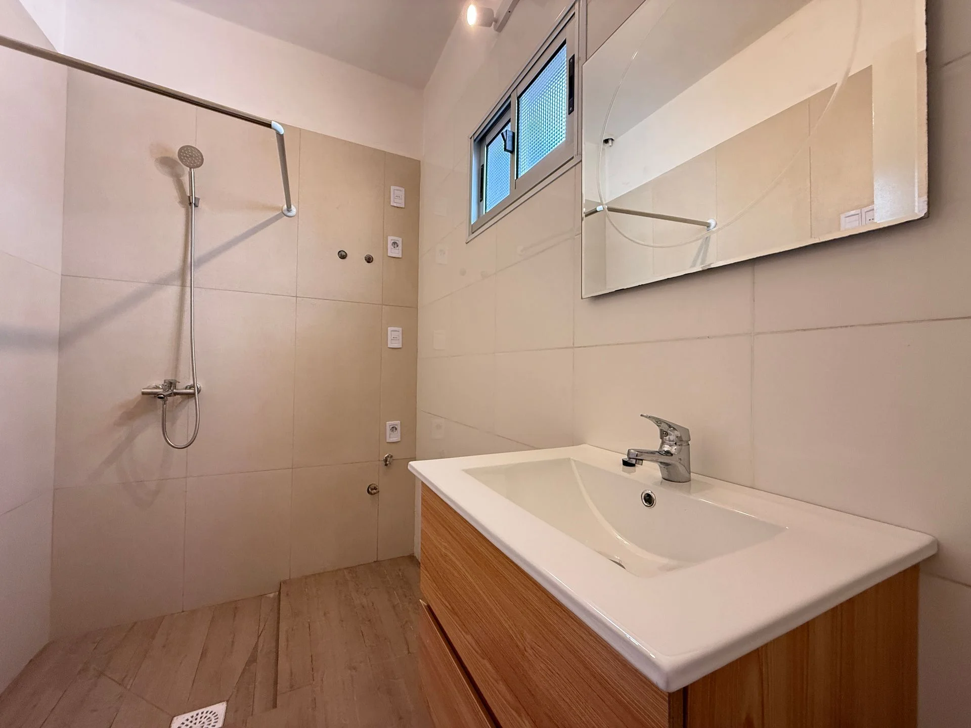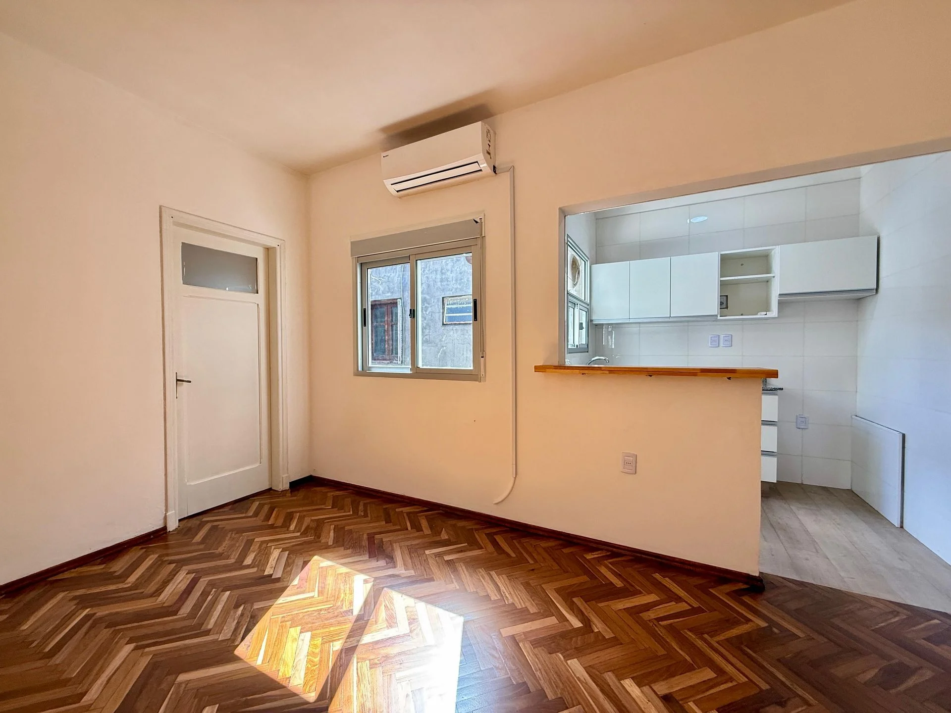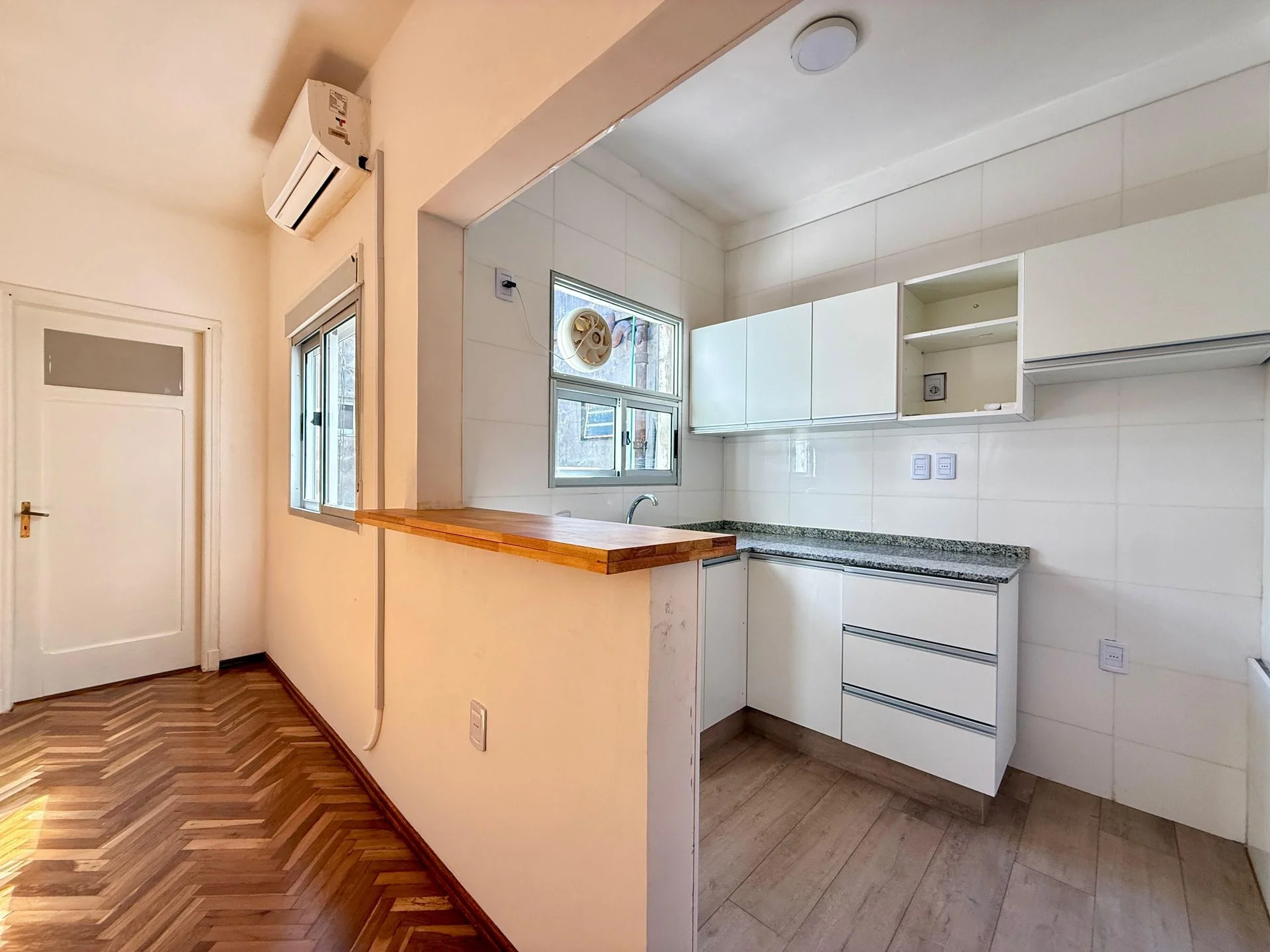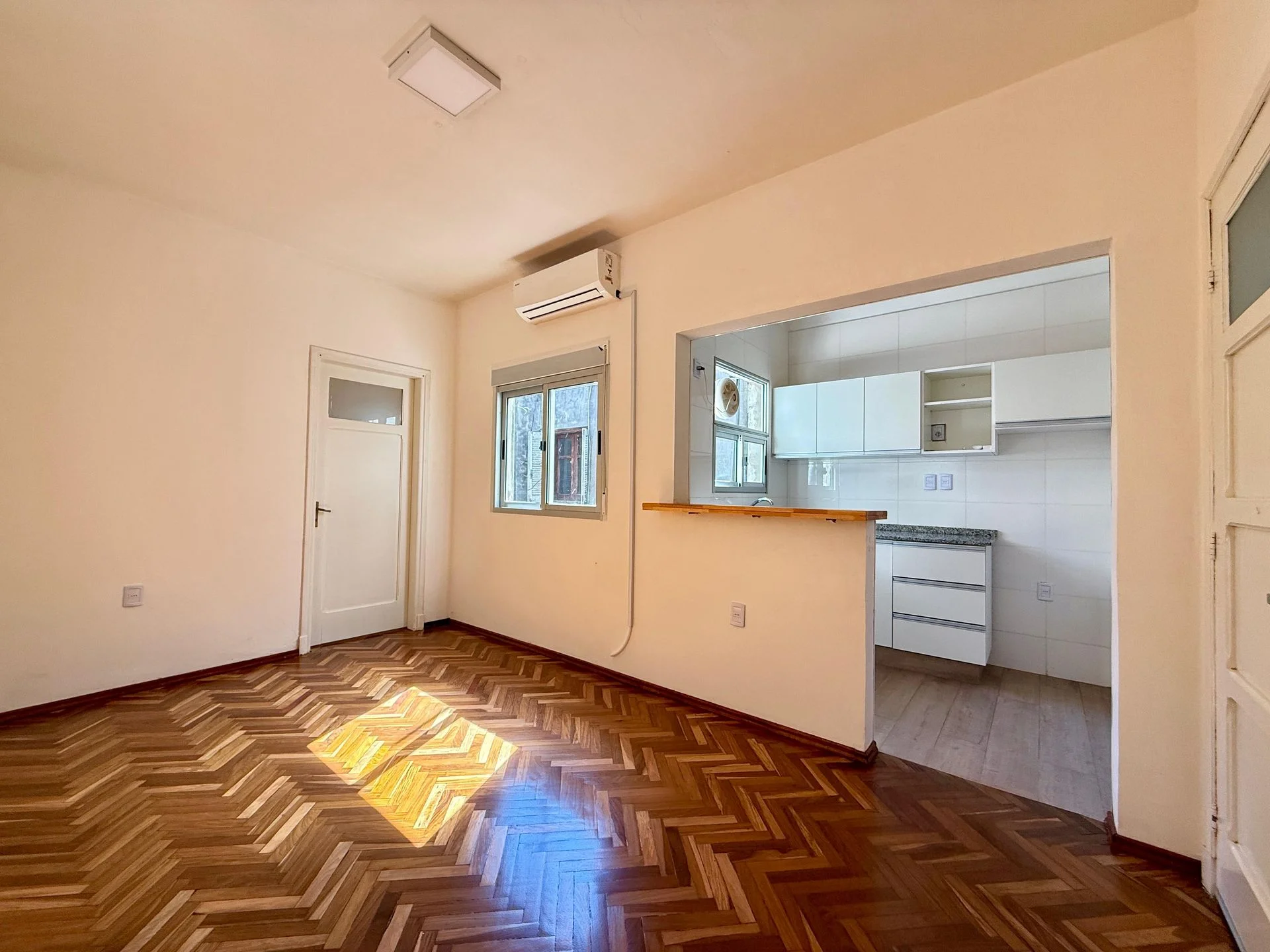 Dormitorio amplio, con piso de parquet y aire acondicionado. Baño reciclado a nuevo, completo, con instalación para lavarropas.