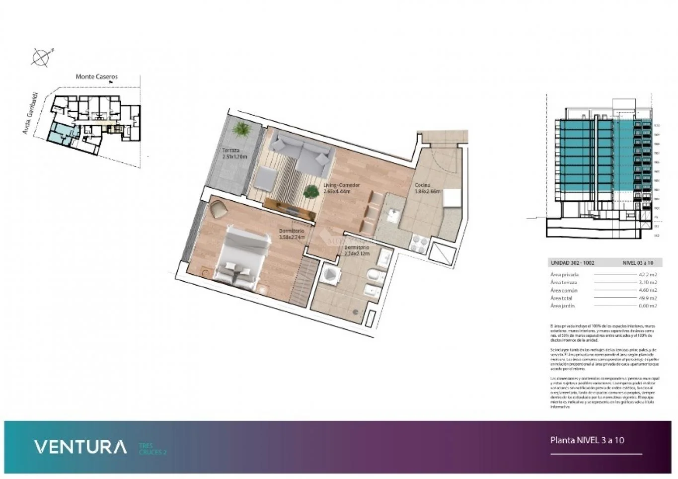 202 a 1002) 42,2m área propia + 3,10m terraza + 4,60m área común = 49,9m Total.