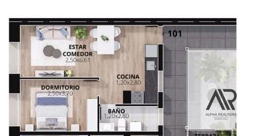 Cocina integrada y amplio living comedor, un baño completo y un dormitorio grande muy iluminado.
