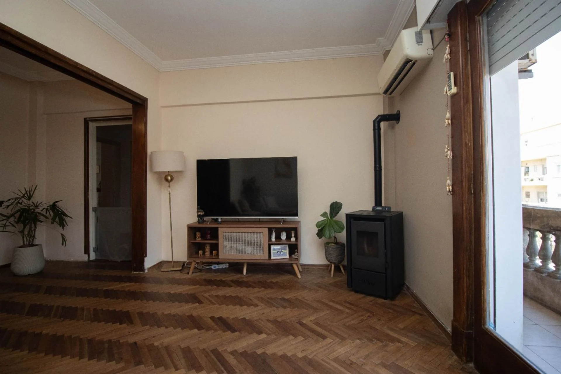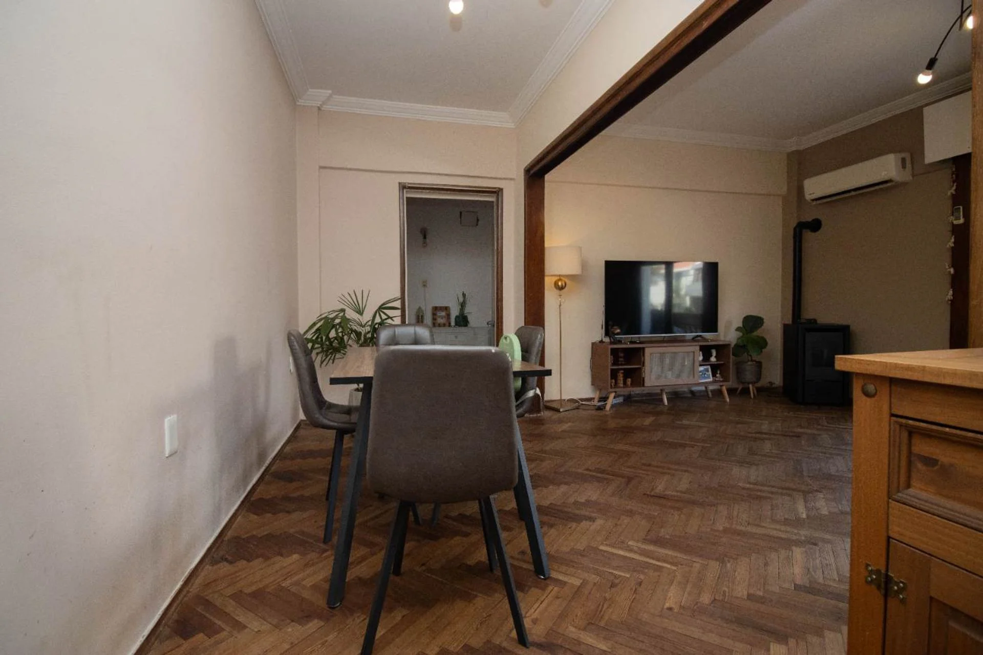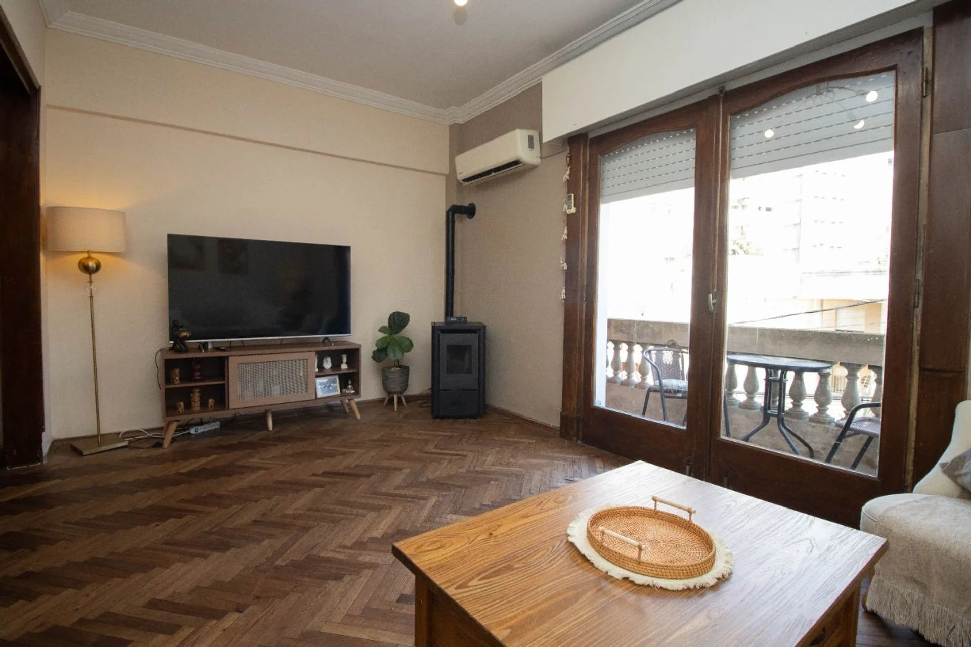 Cuenta con 2 baños, aires acondicionados en living y dormitorio principal, y pisos de madera en excelente estado.