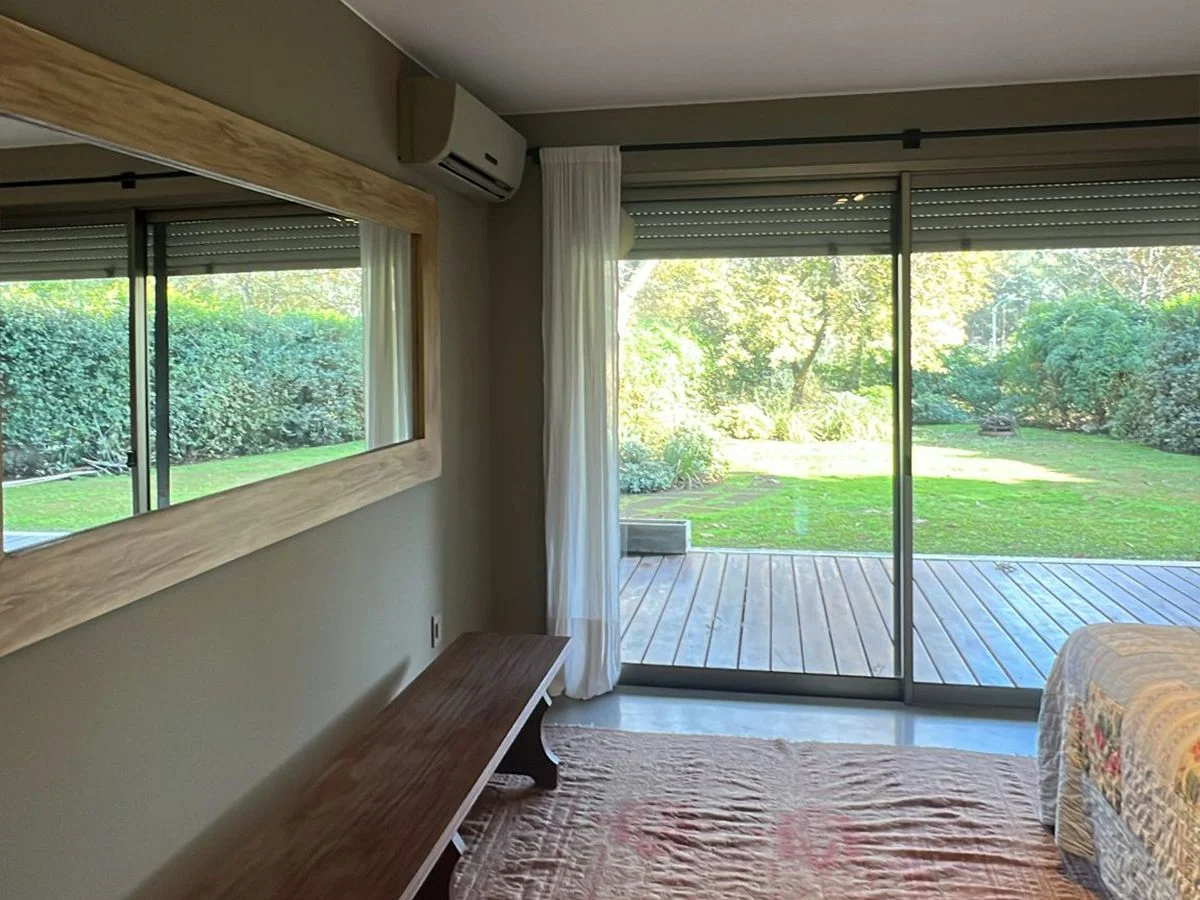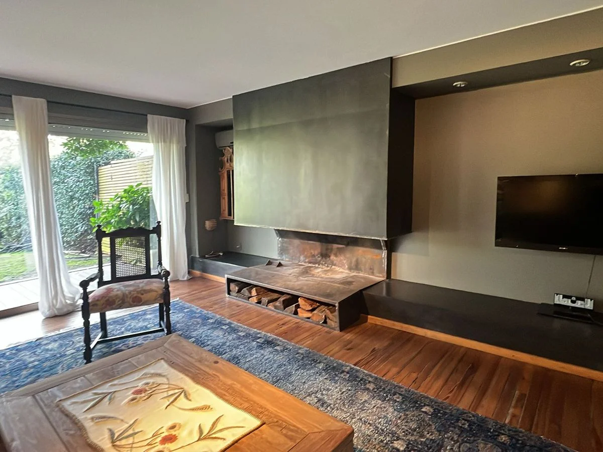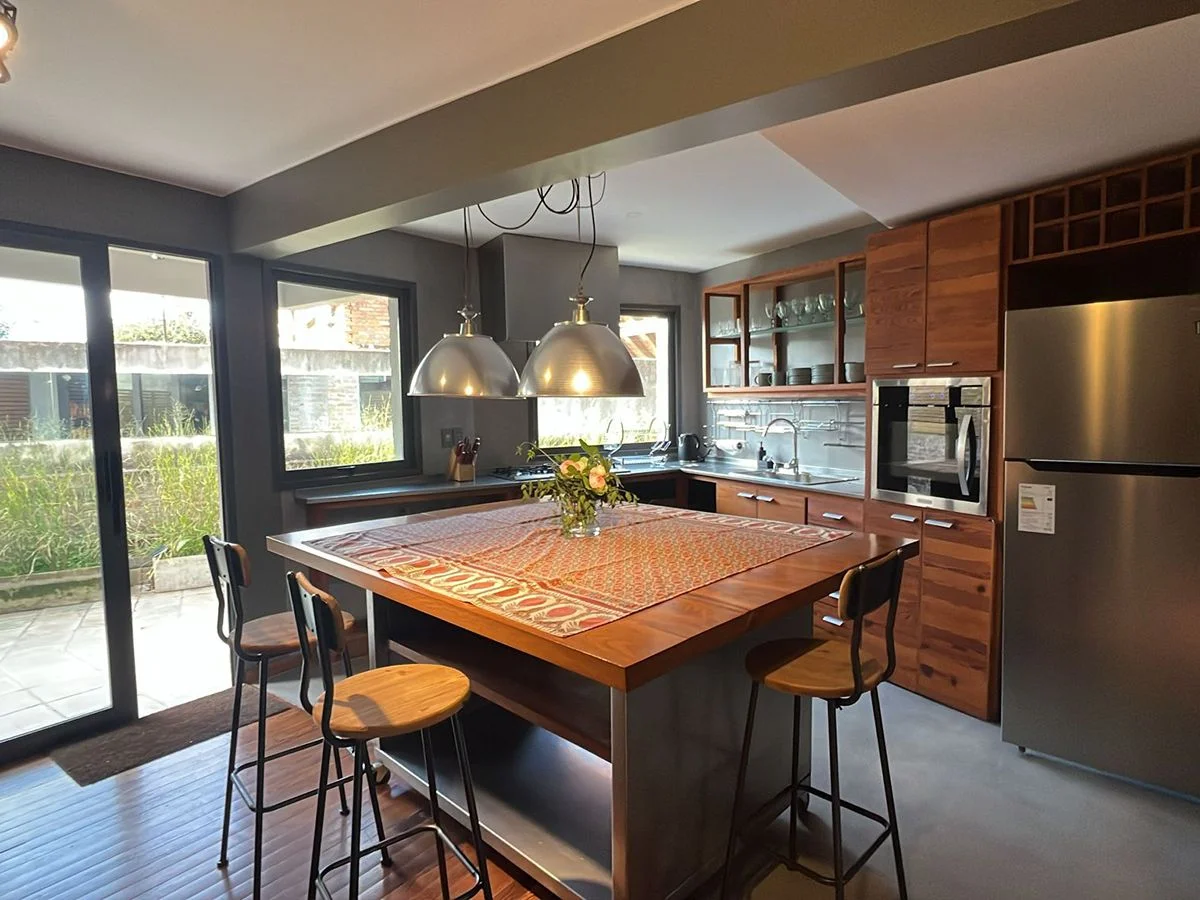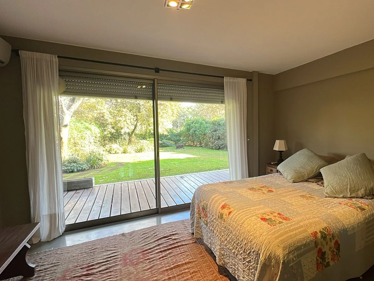 Amplio living comedor con estufa a leña y cocina con isla integrada, tres dormitorios con placares (principal en suite) y otros dos baños completos. Todos los ambientes integrados al jardín que rodea el apartmento. Deck. Garaje para dos autos.
