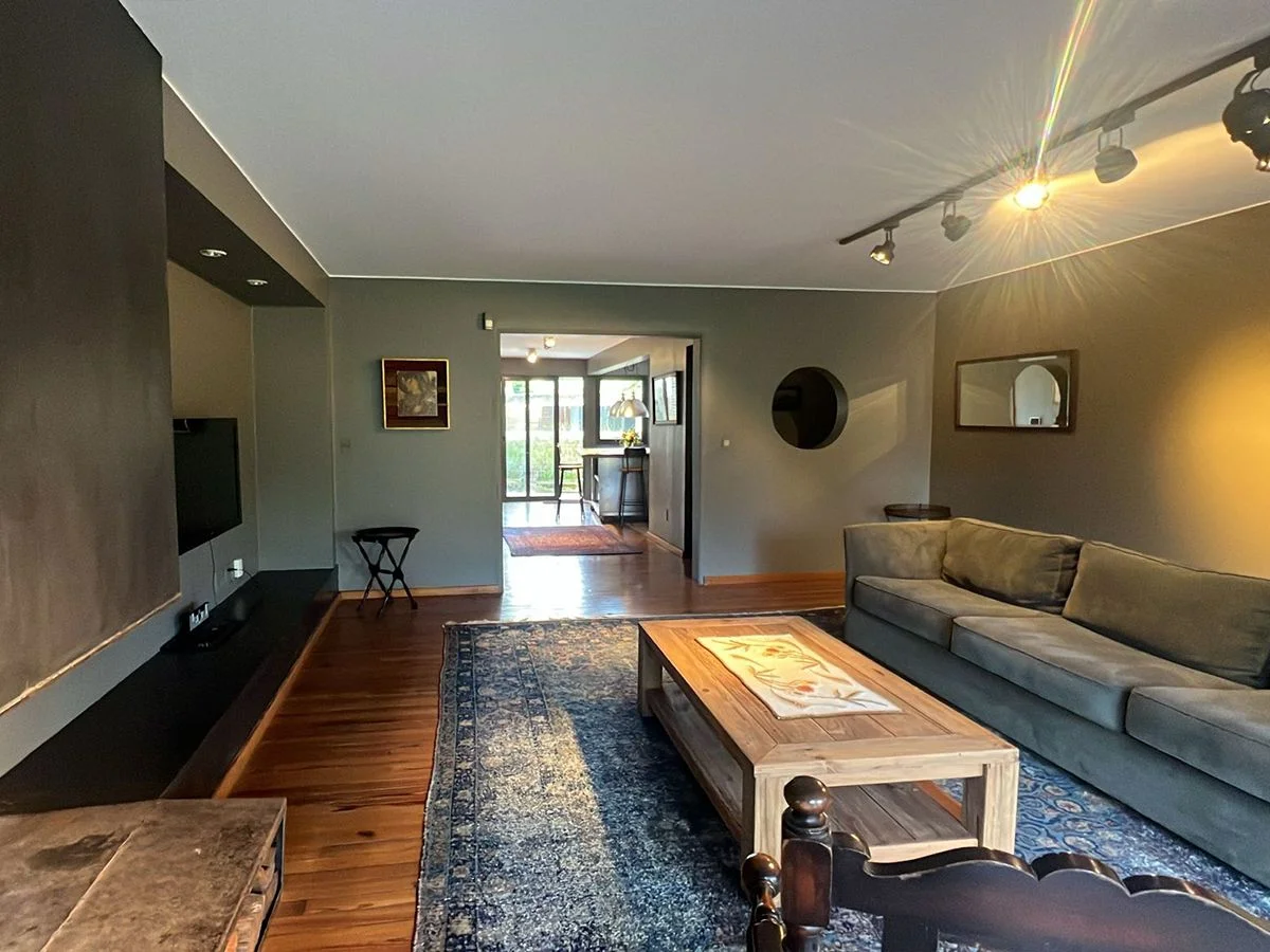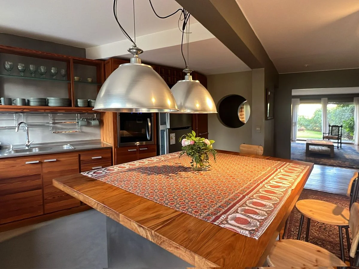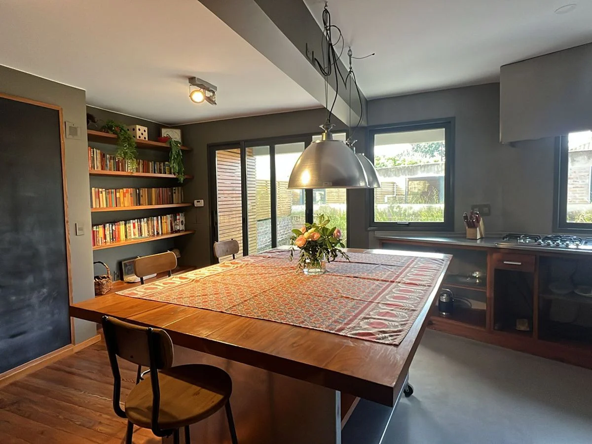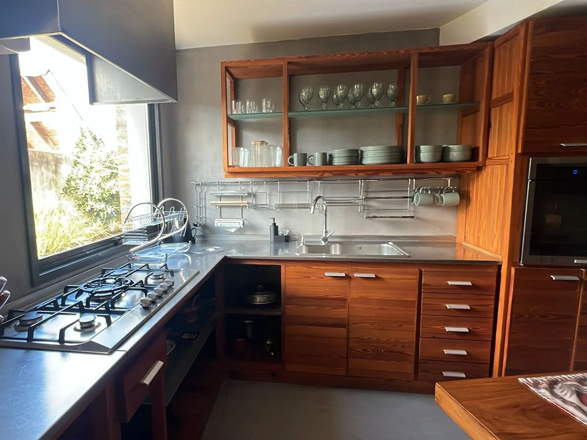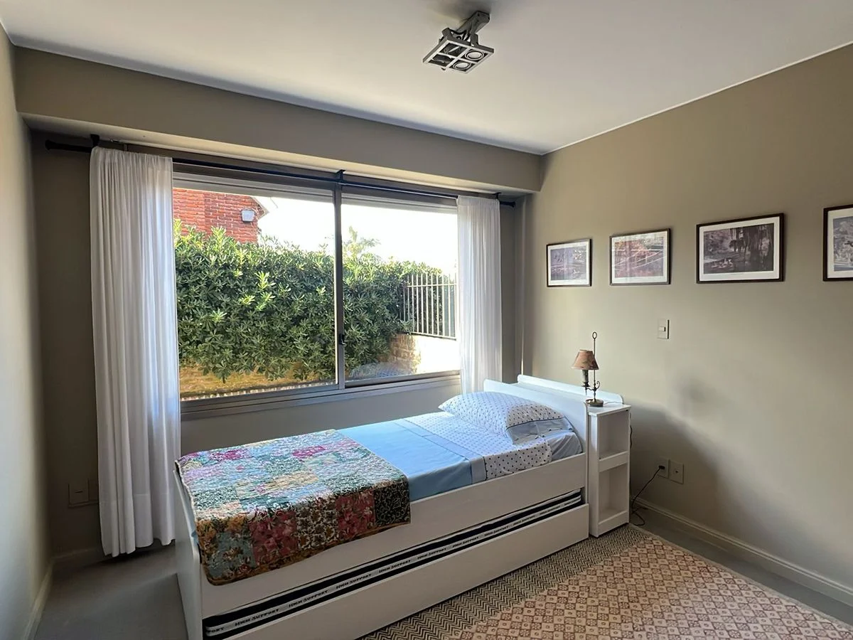 Amplio living comedor con estufa a leña y cocina con isla integrada, tres dormitorios con placares (principal en suite) y otros dos baños completos. Todos los ambientes integrados al jardín que rodea el apartmento. Deck. Garaje para dos autos.