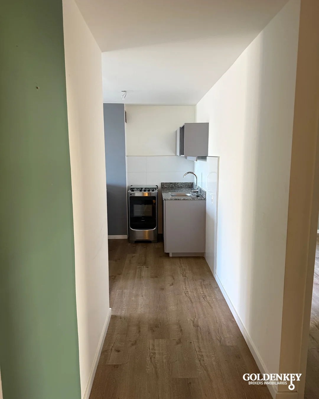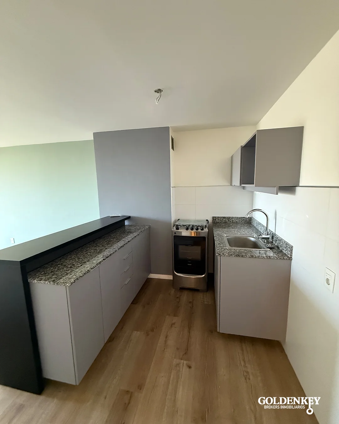Ingreso al Apartamento a amplio Living comedor con cocina integrada. Barra pasaplatos en granito. Muebles en MDF bajo mesada y aéreo. Piso vinílico.