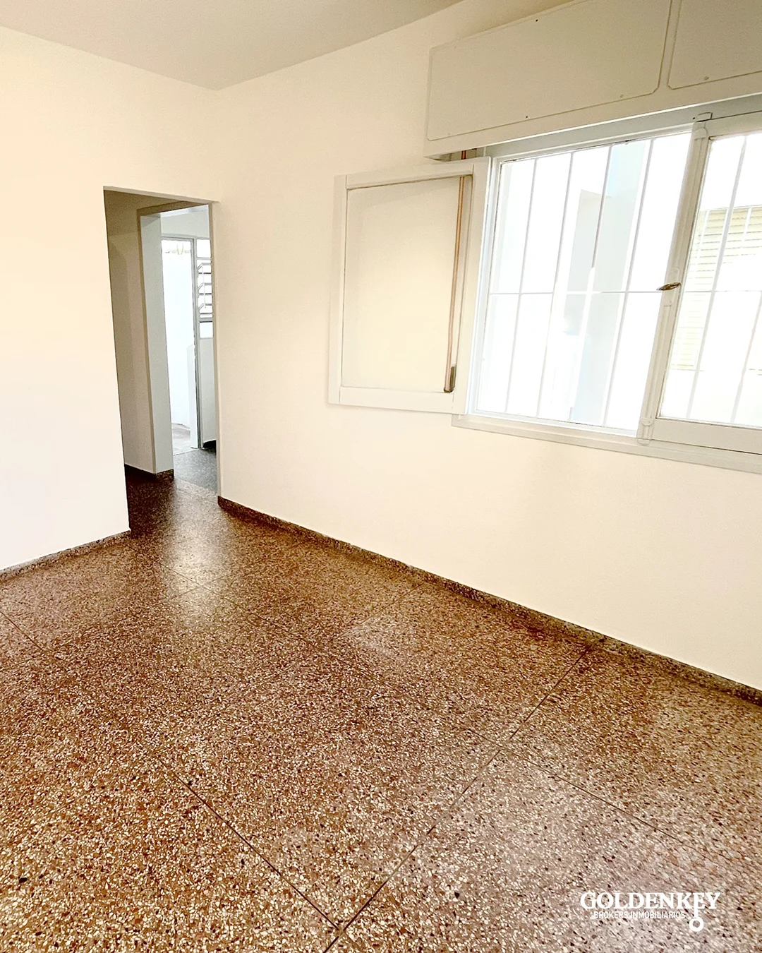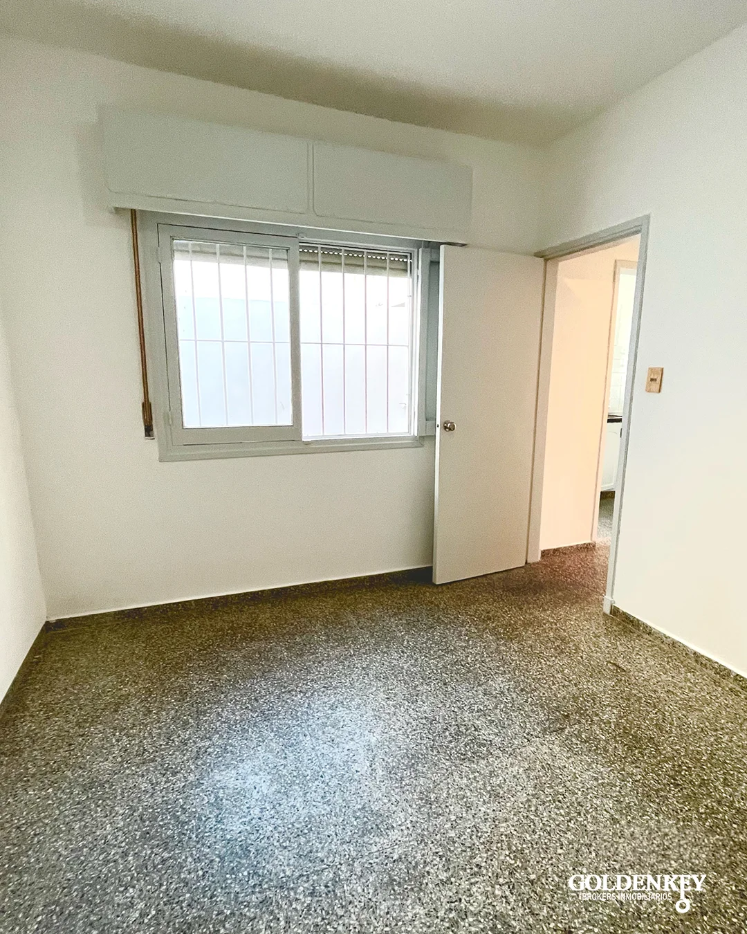 Dormitorio amplio de 11 m2 con ventana en aluminio hacia el patio y reja.