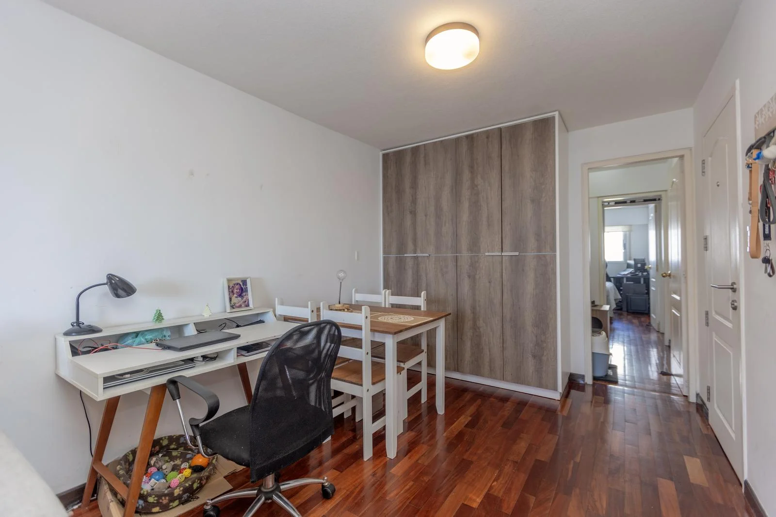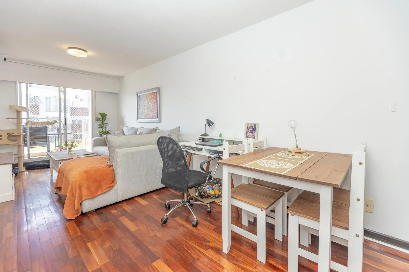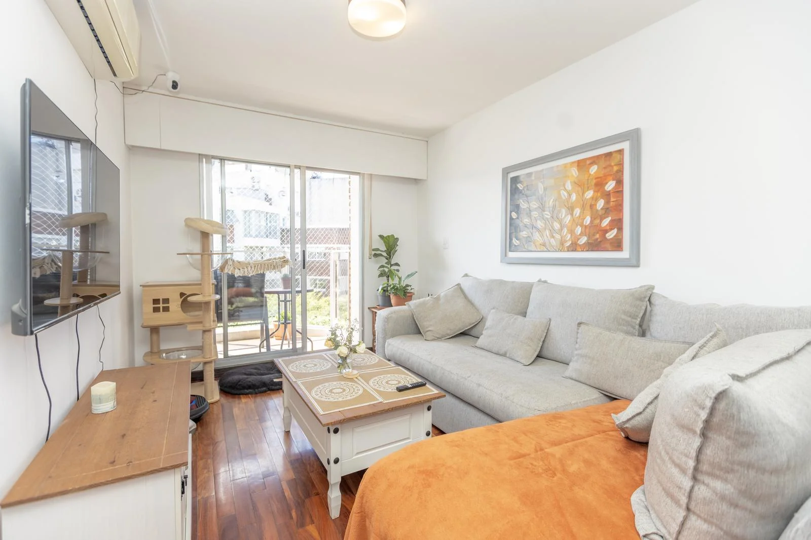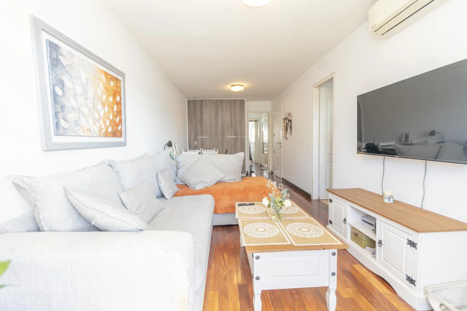 Amplio living comedor con pisos de lapacho y placares y aire acondicionado
