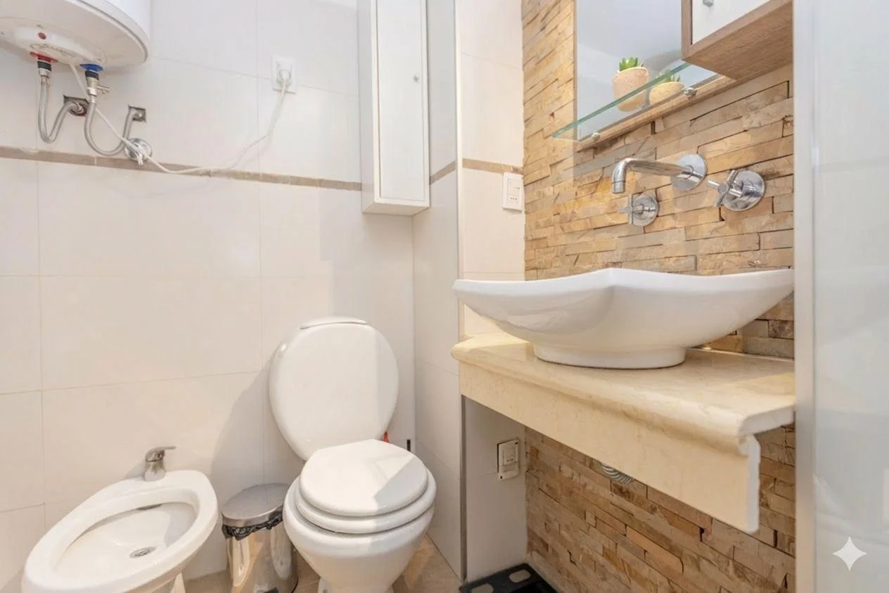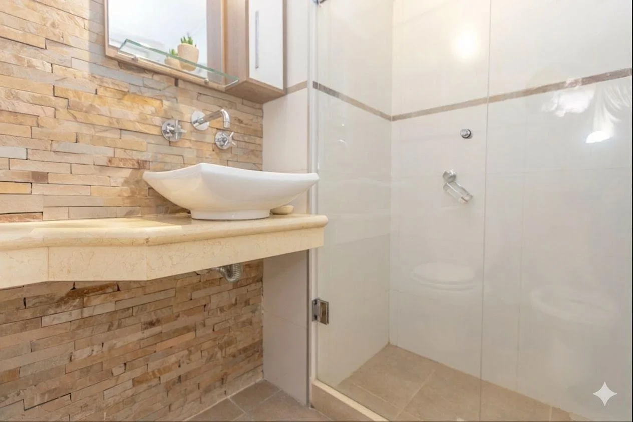 Baño completo con mampara de vidrio y calefon