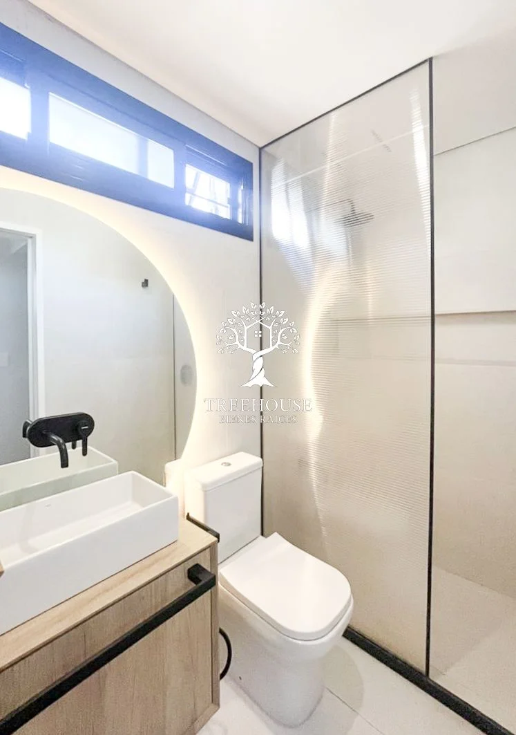 -1 baño moderno y equipado con espejo, mueble, ducha con mampara y iluminación integrada.