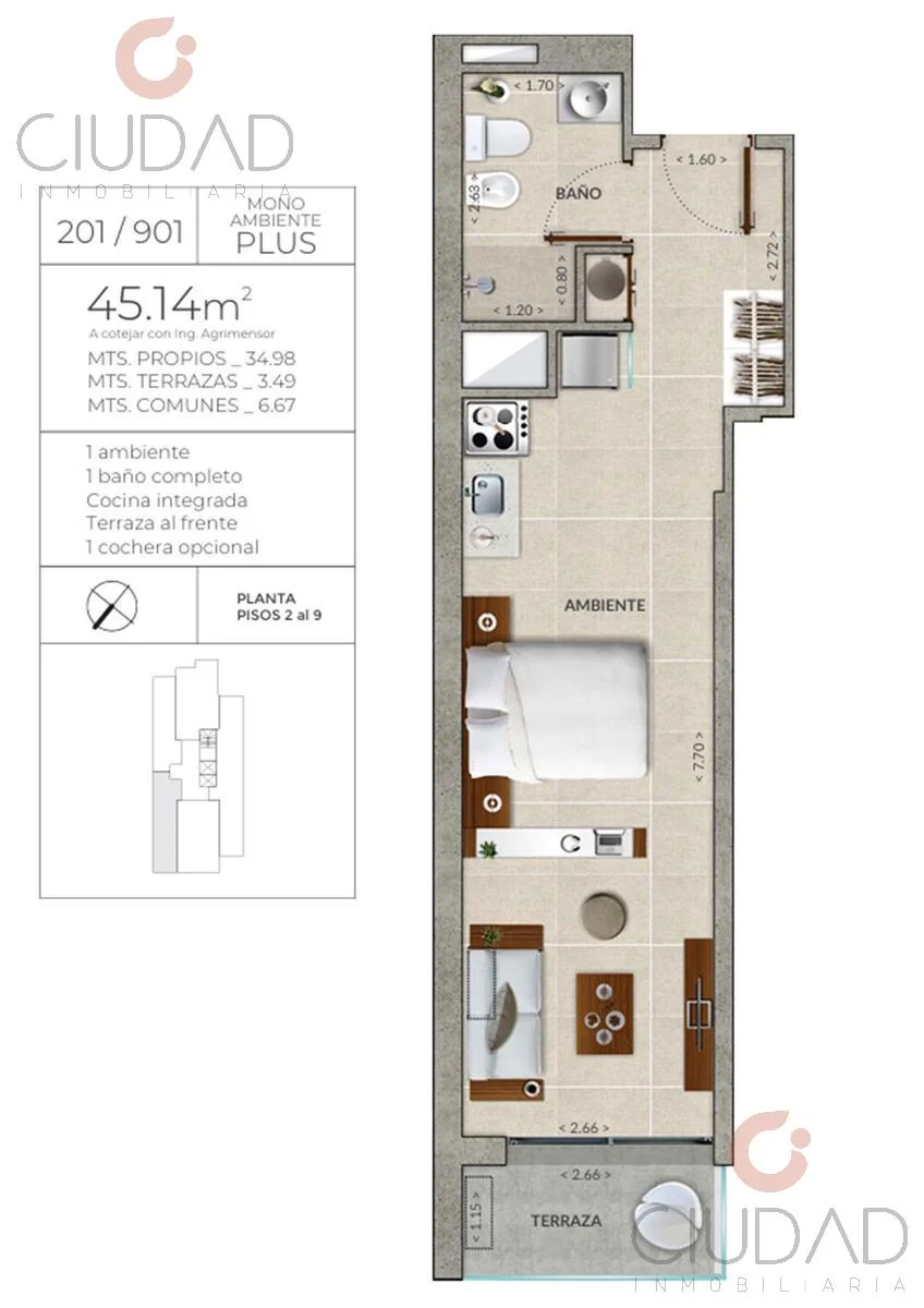 - Terraza - Cocina con placard aéreo y bajo mesada - Baño completo