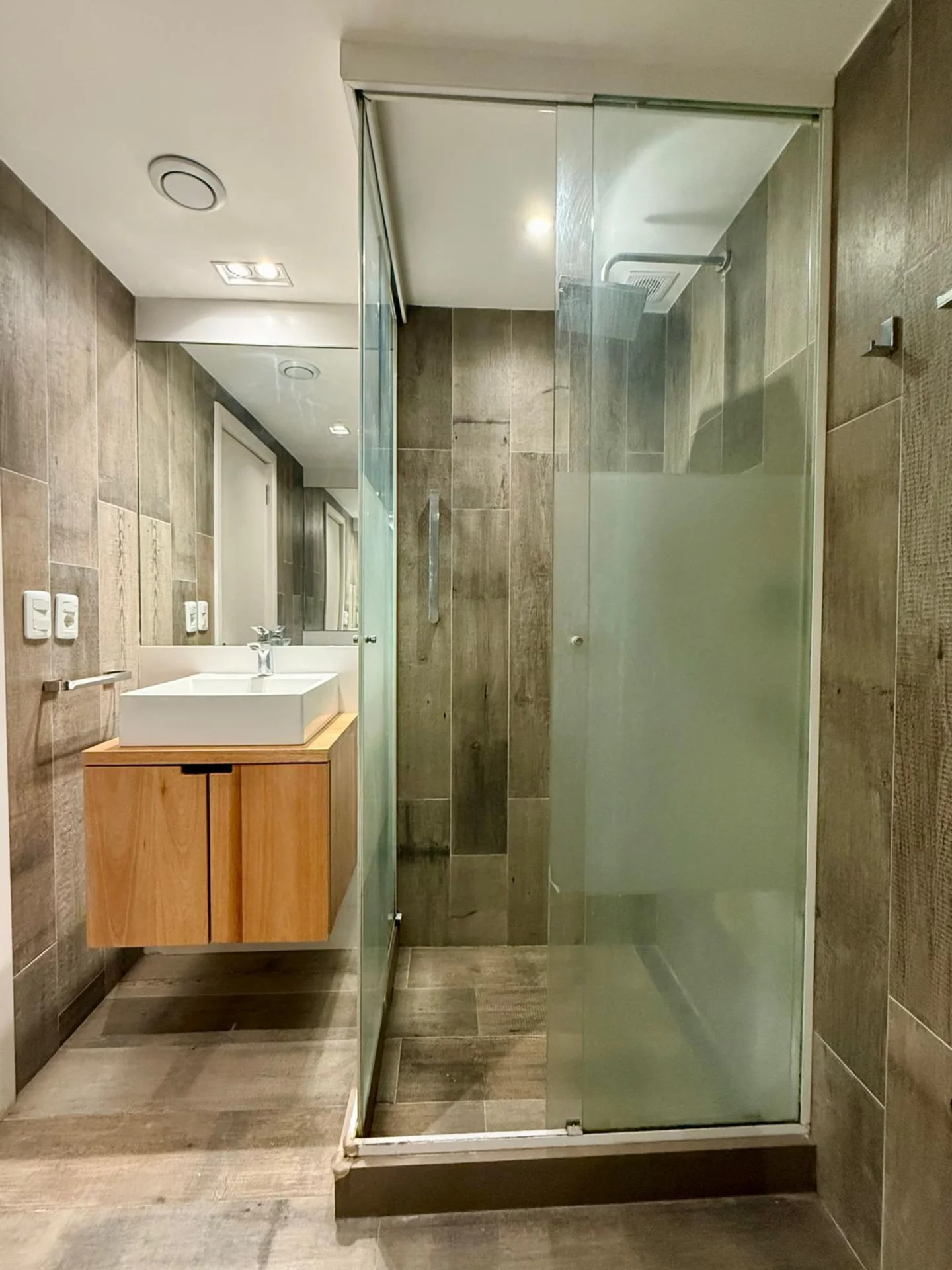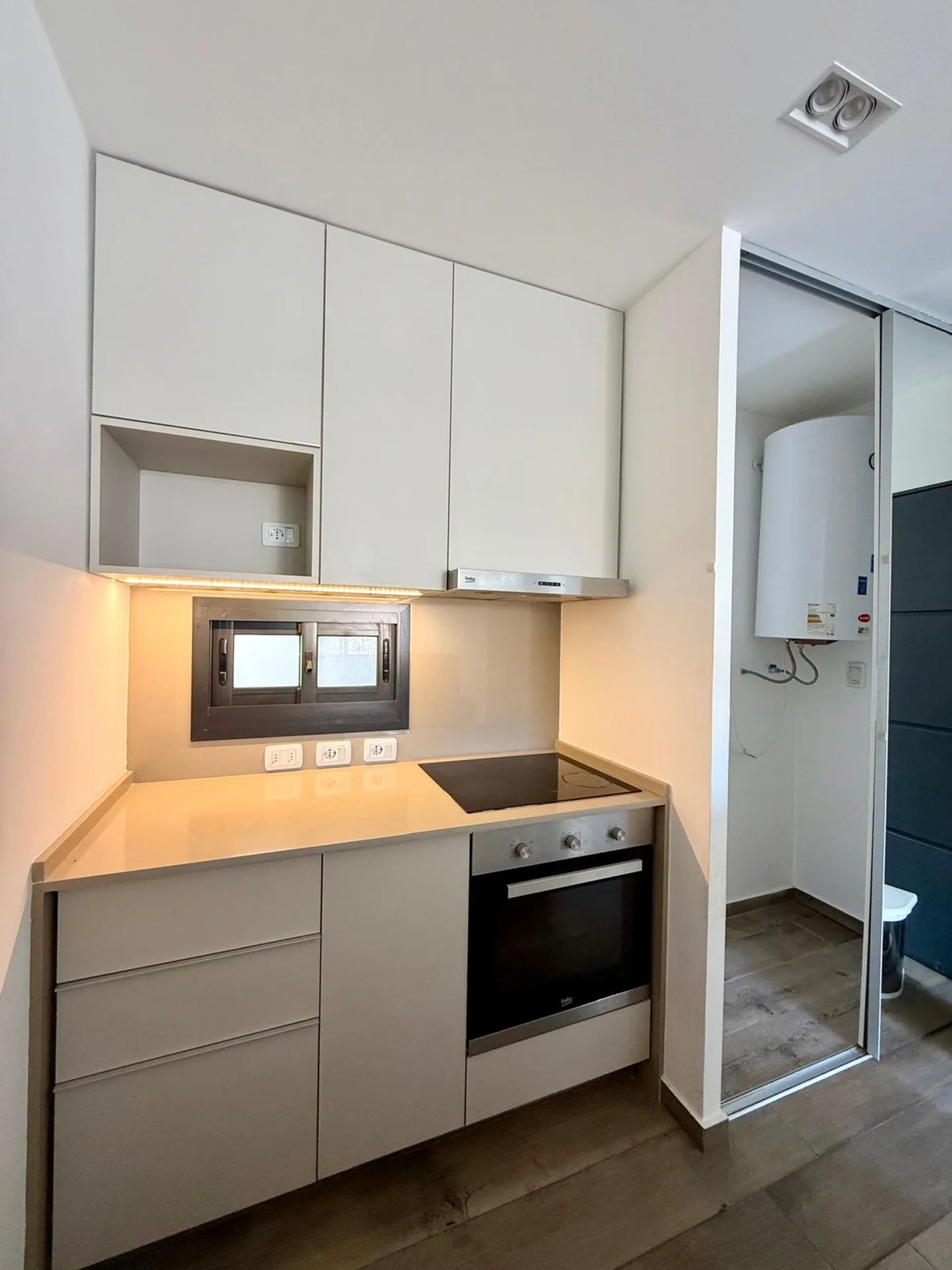 Amplio y luminoso living comedor con cocina integrada con barra separadora. Incluye lavavajillas en mueble bajo mesada, hornalla de vitrocerámica, horno empotrado, campana extractora y calefón.