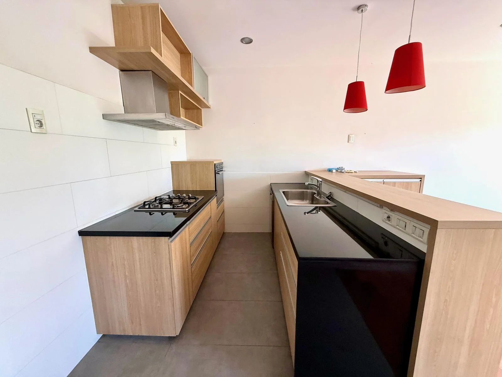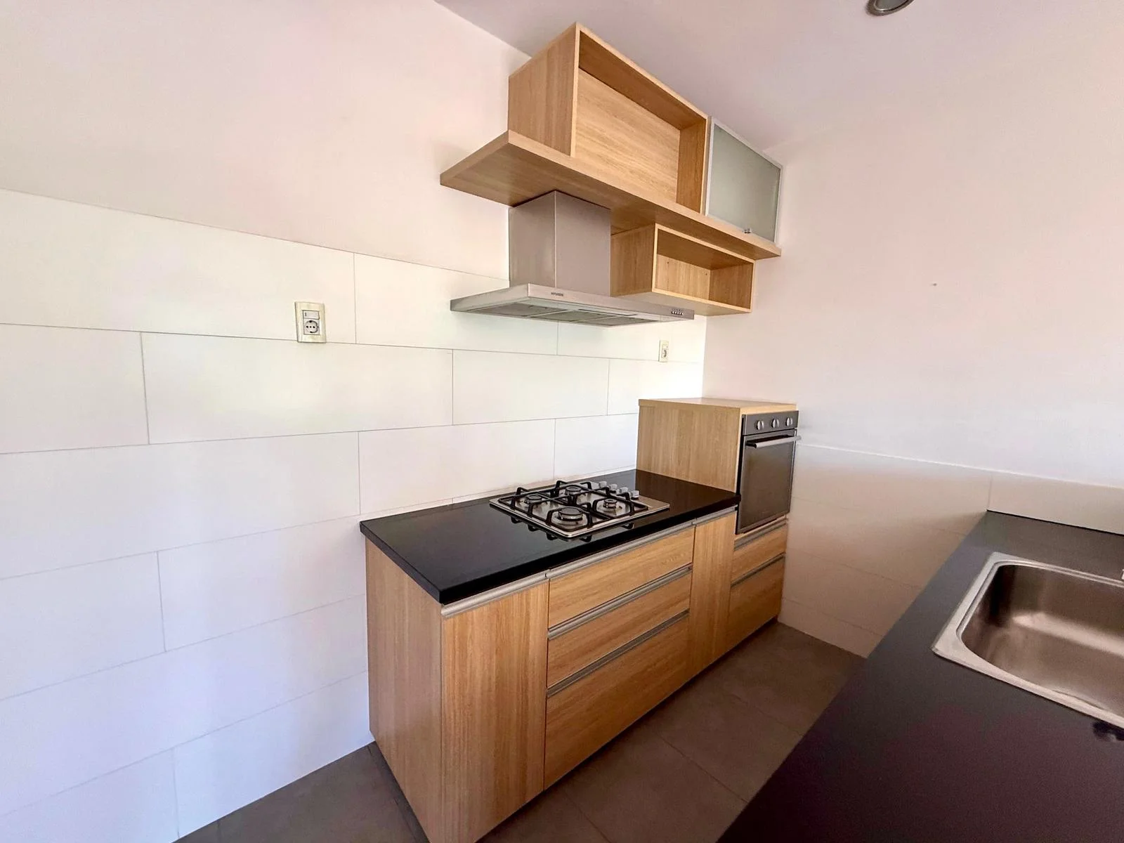 Cocina integrada por barra, con buena capacidad de almacenamiento, equipada con horno eléctrico, campana y anafe a gas Y mesada en granito negro.