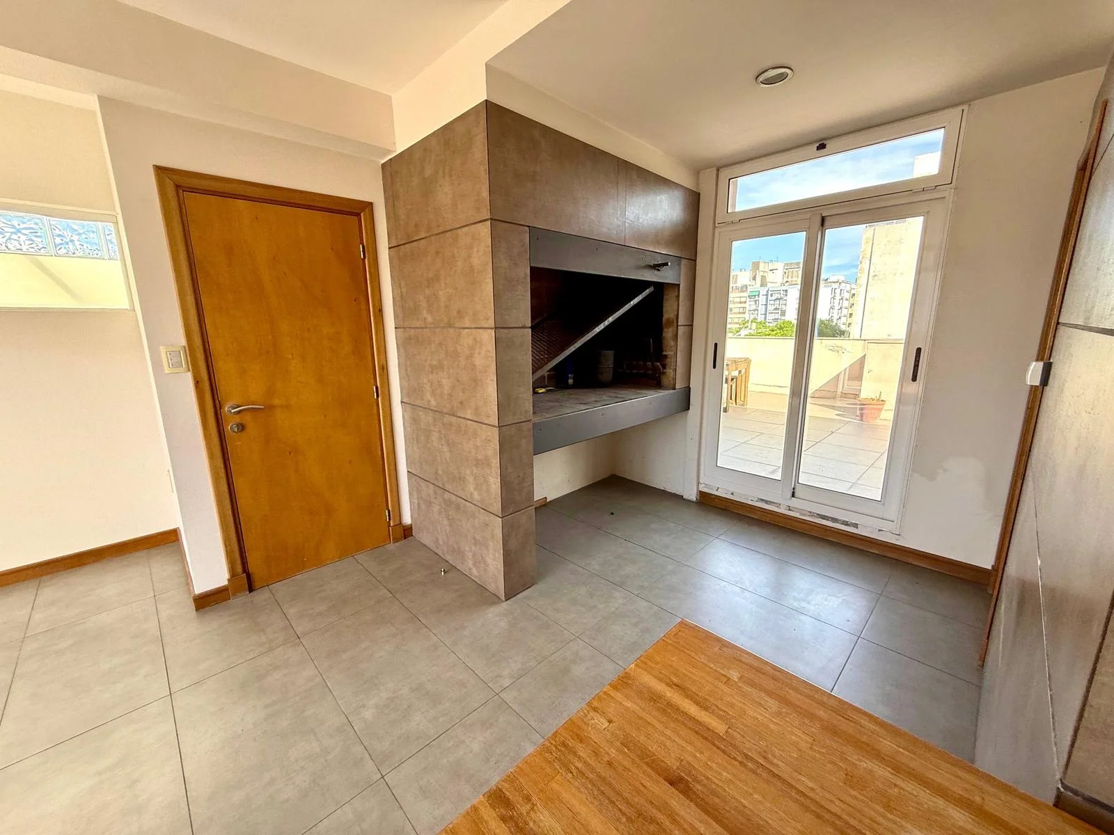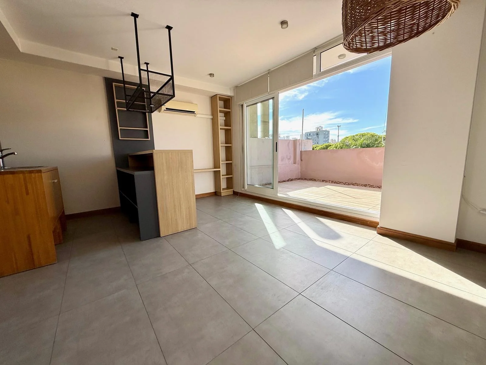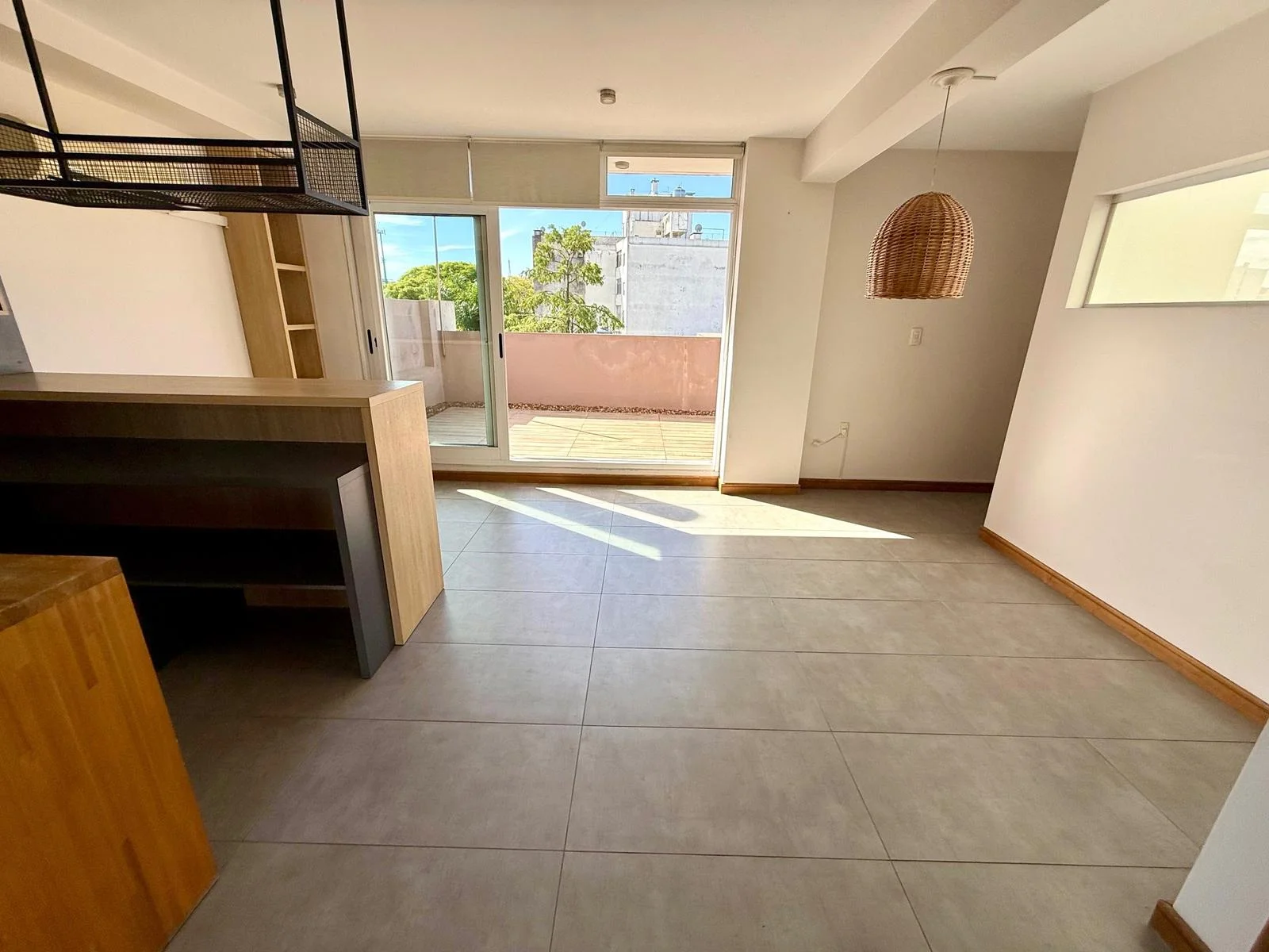 Por arcada fácil de cerrar se accede al otro gran ambiente que es un gran estar con cocina integrada com salida a muy lindo balcón con vista verde despejada .