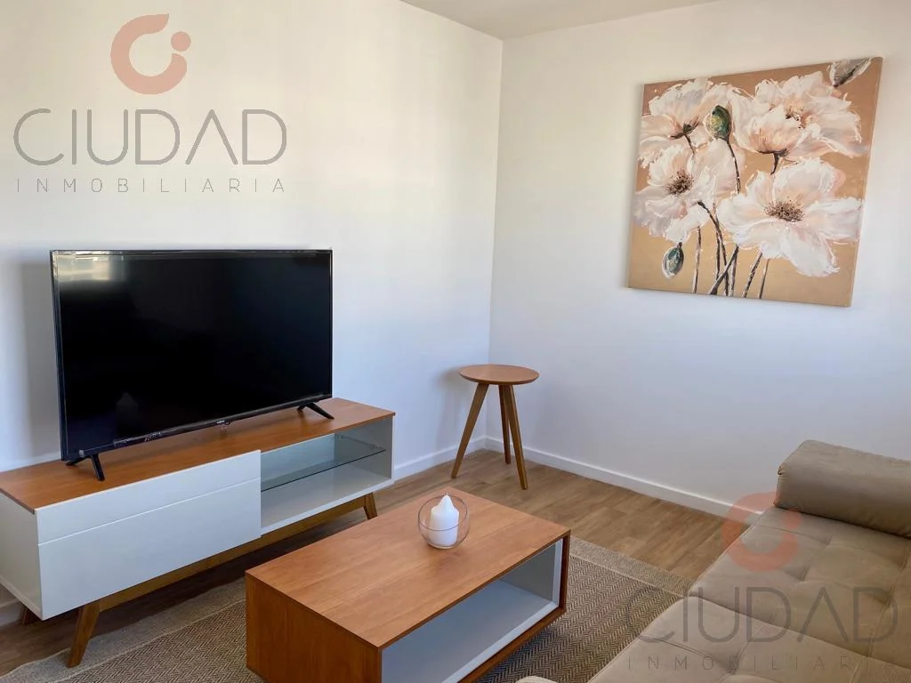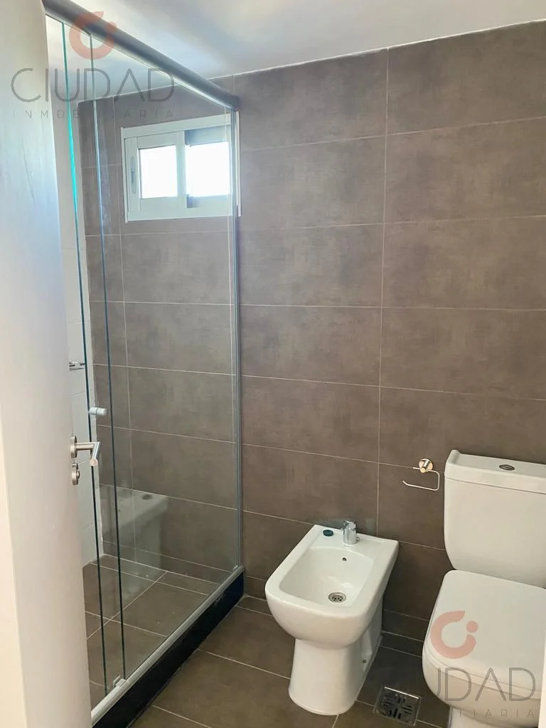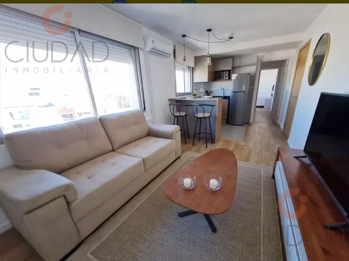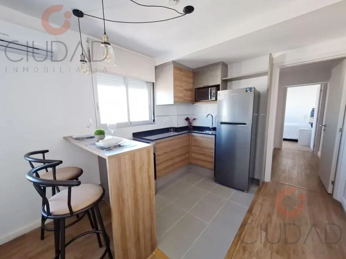 cocina integrada con barra, espacio de estar cómodo, dormitorio con placard y aire acondicionado, losa radiante y baño completo con mampara de vidrio.