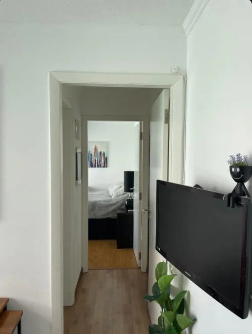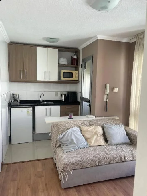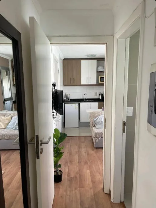 Calefacción por losa radiante individual y una distribución cómoda con dormitorio (cama, mesa de luz y ropero)
