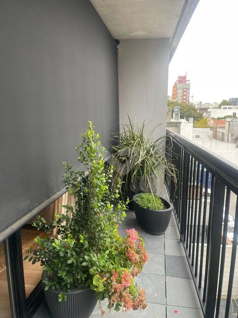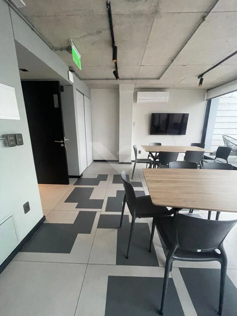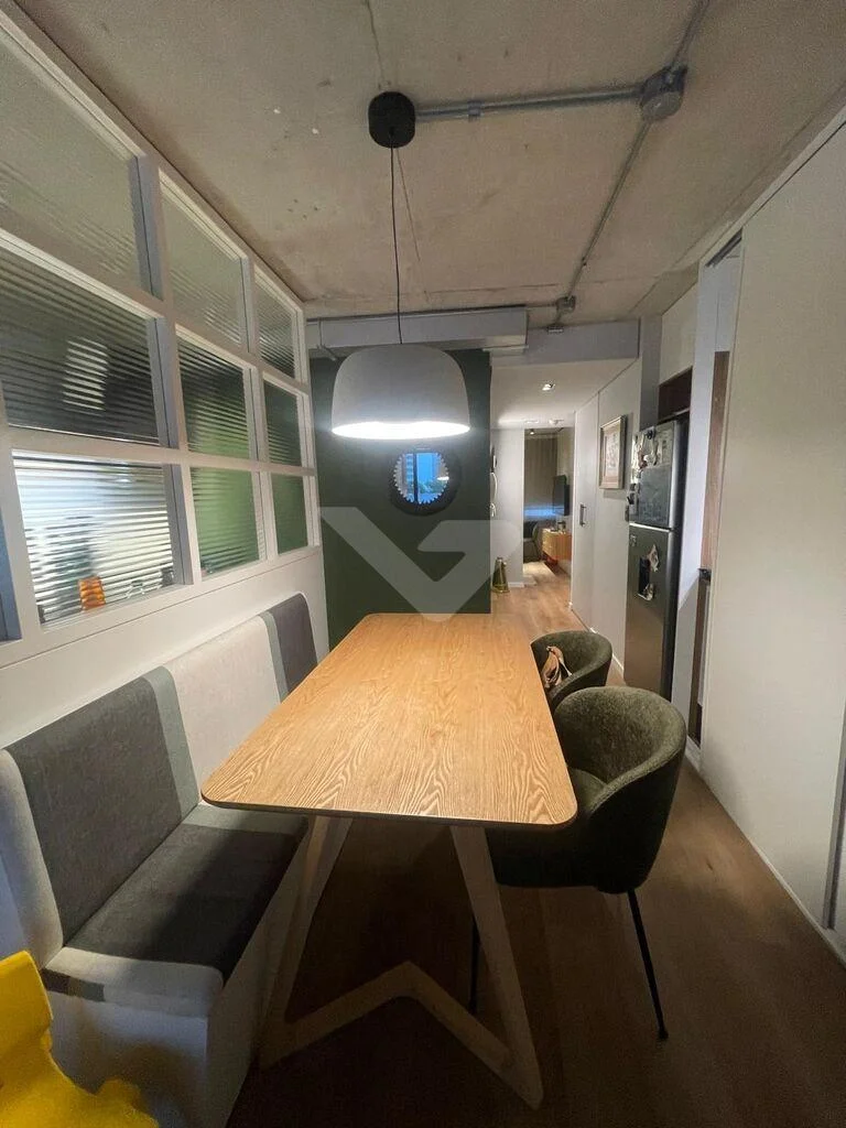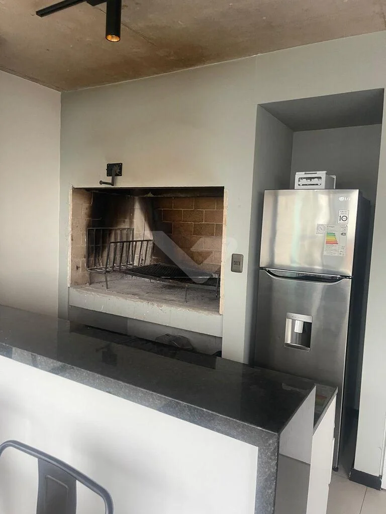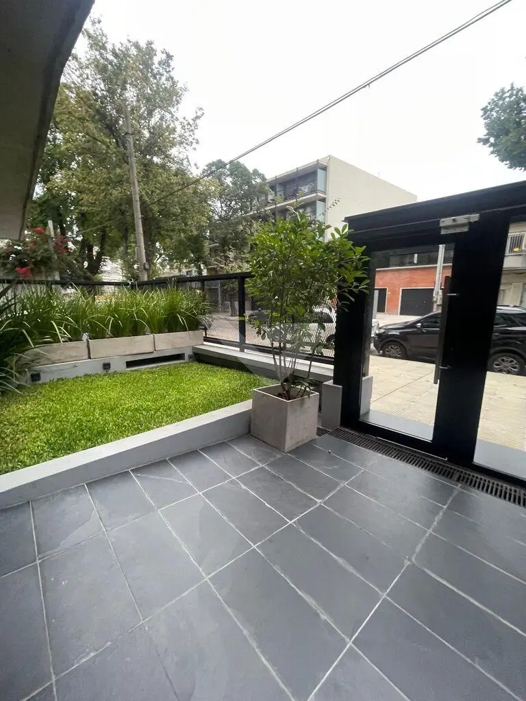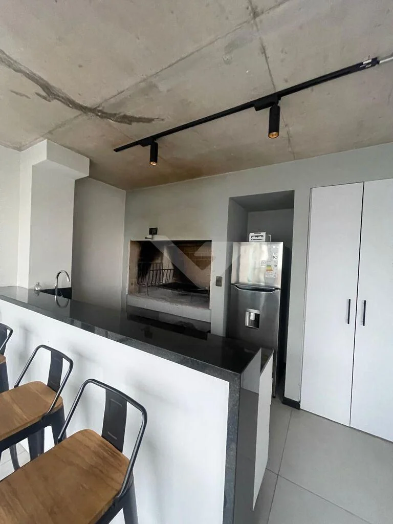 Al ingresar, cuenta con un recibidor que brinda privacidad al sector íntimo. Dispone de un amplio y luminoso living con ventanal de piso a techo y cocina integrada con barra, equipada con anafe, heladera, horno eléctrico y microondas.