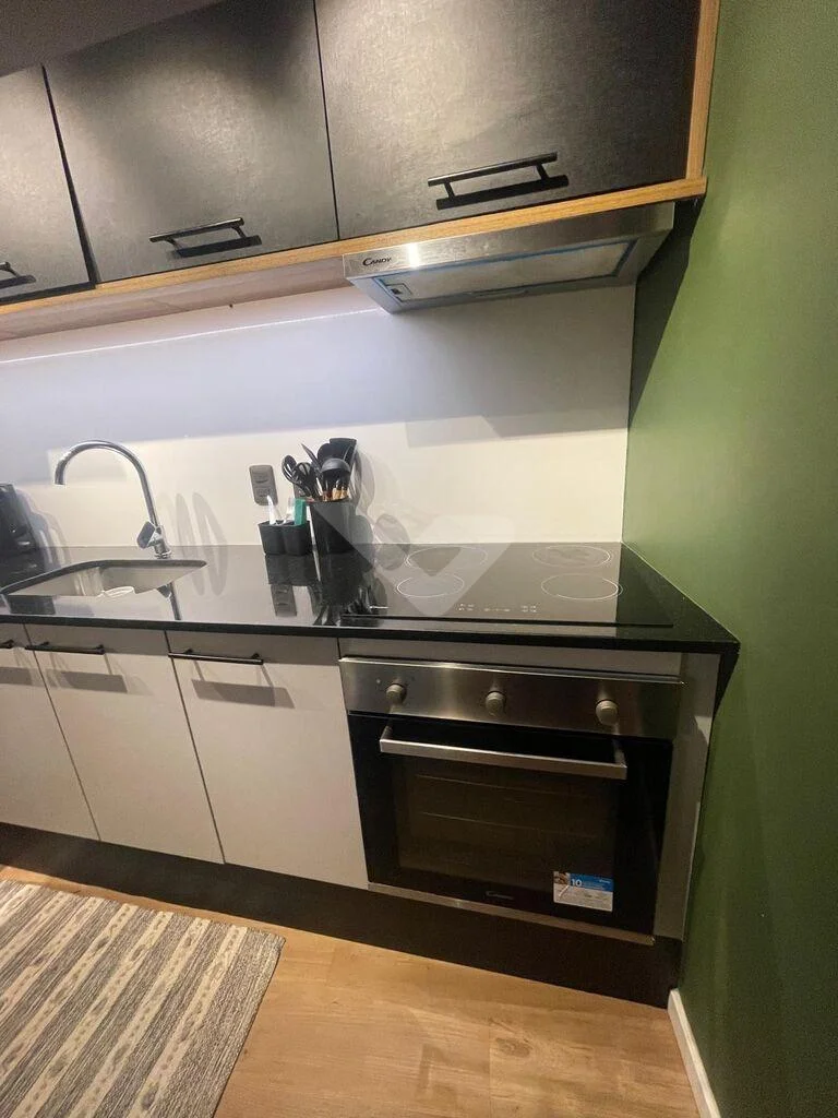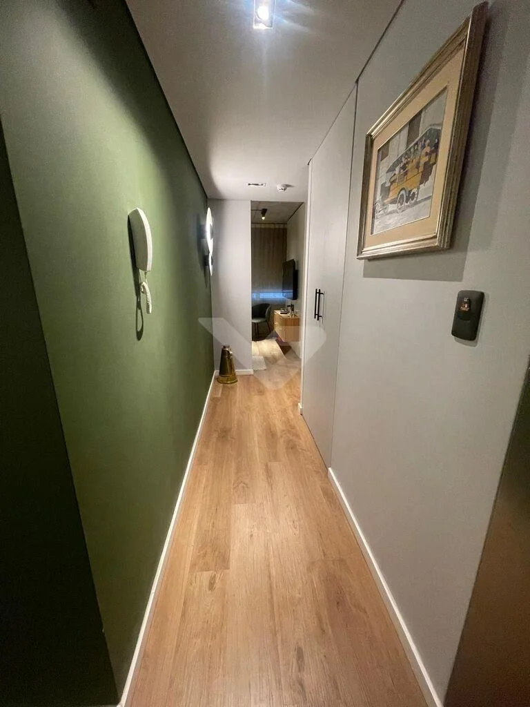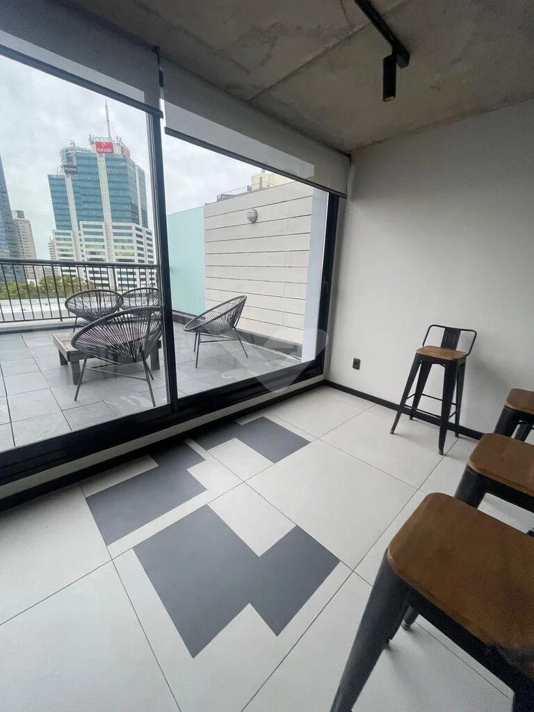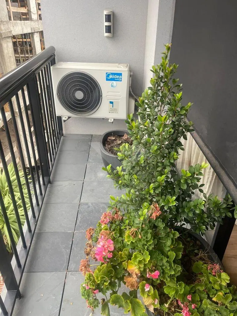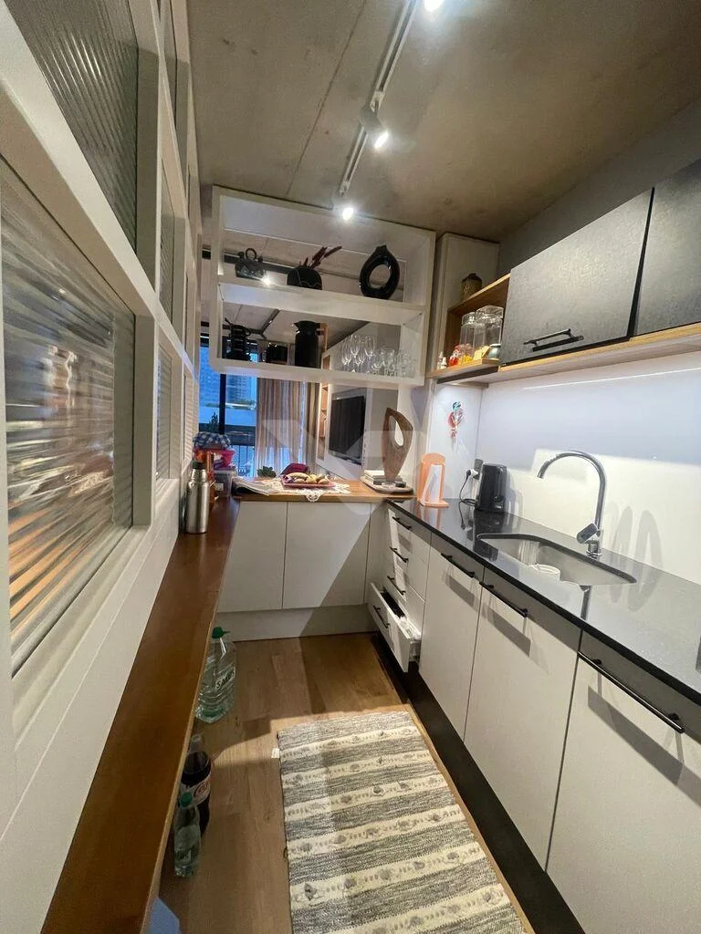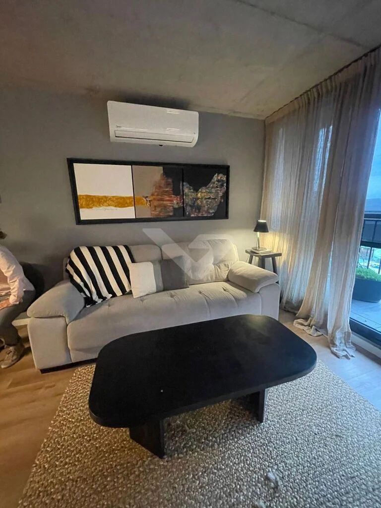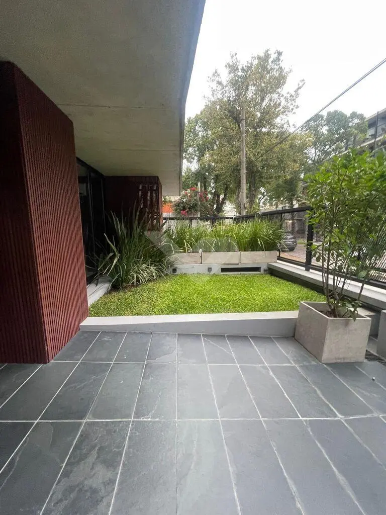 Al ingresar, cuenta con un recibidor que brinda privacidad al sector íntimo. Dispone de un amplio y luminoso living con ventanal de piso a techo y cocina integrada con barra, equipada con anafe, heladera, horno eléctrico y microondas.
