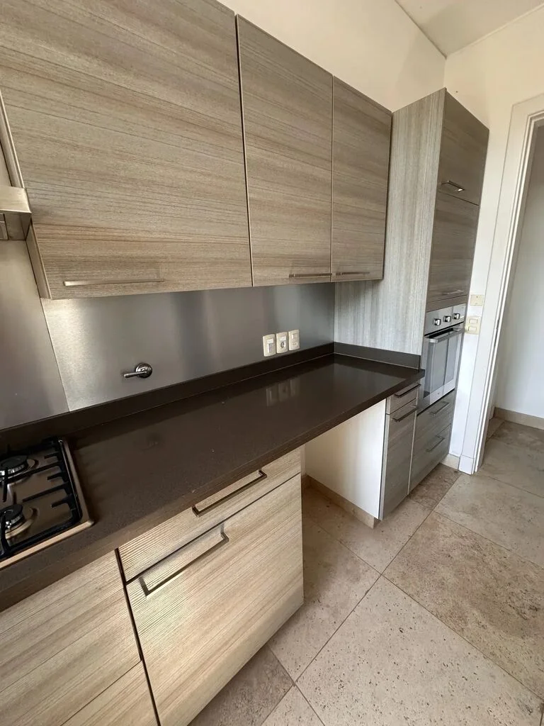 Cocina con horno y anafe empotrado, con barra y área de estar y comedor diario, que se puede separar o integrar al living comedor por puertas corredizas.
