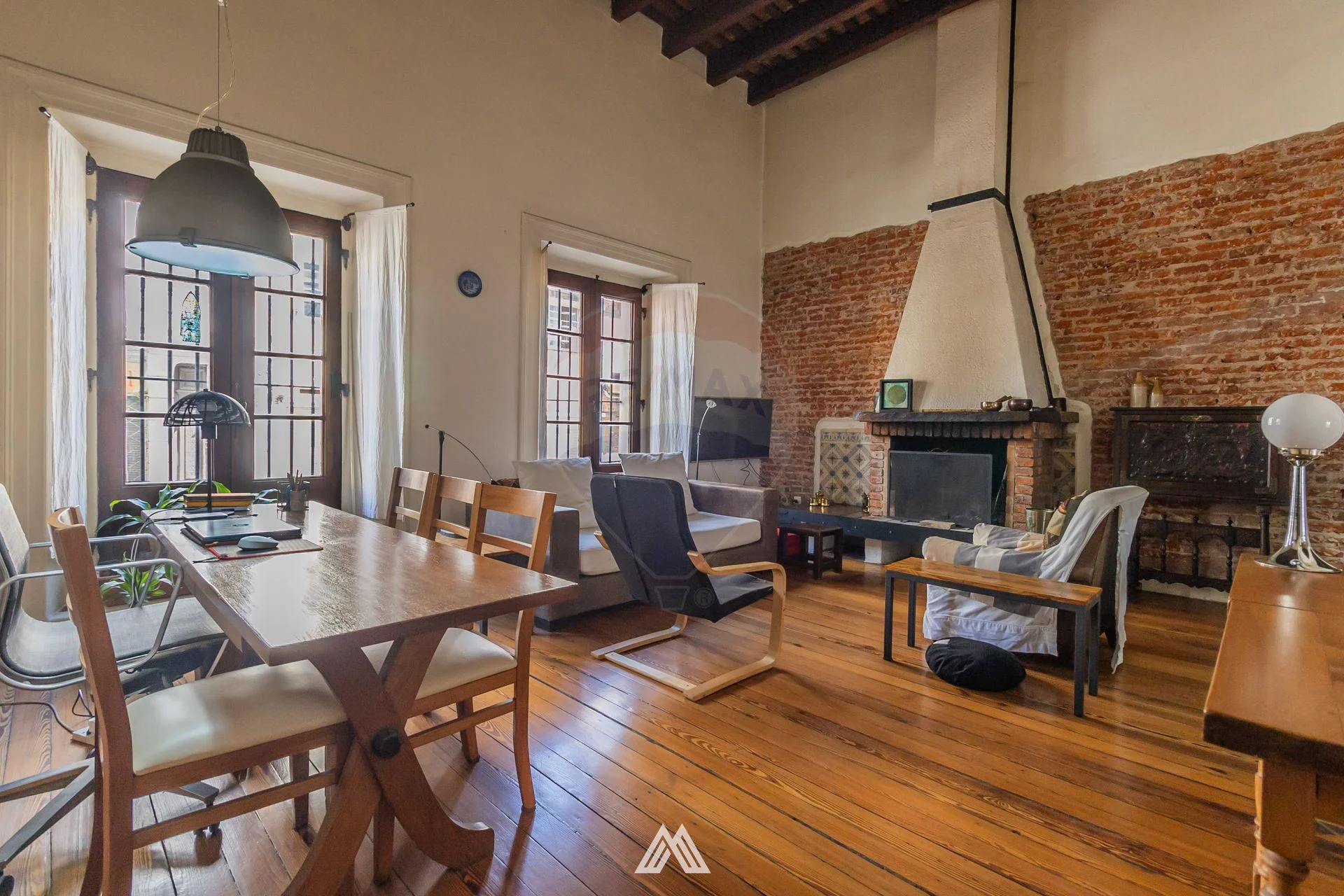 Se ingresa mediante puerta cancel de madera y vidrio a un muy amplio living comedor apaisado, con gran altura. Cuenta con ventanas de madera y vidrio, con rejas originales al frente, pisos de pinotea en excelente estado. Estufa a leña de gran tamaño. Cocina semi integrada con barra de madera y ventana.