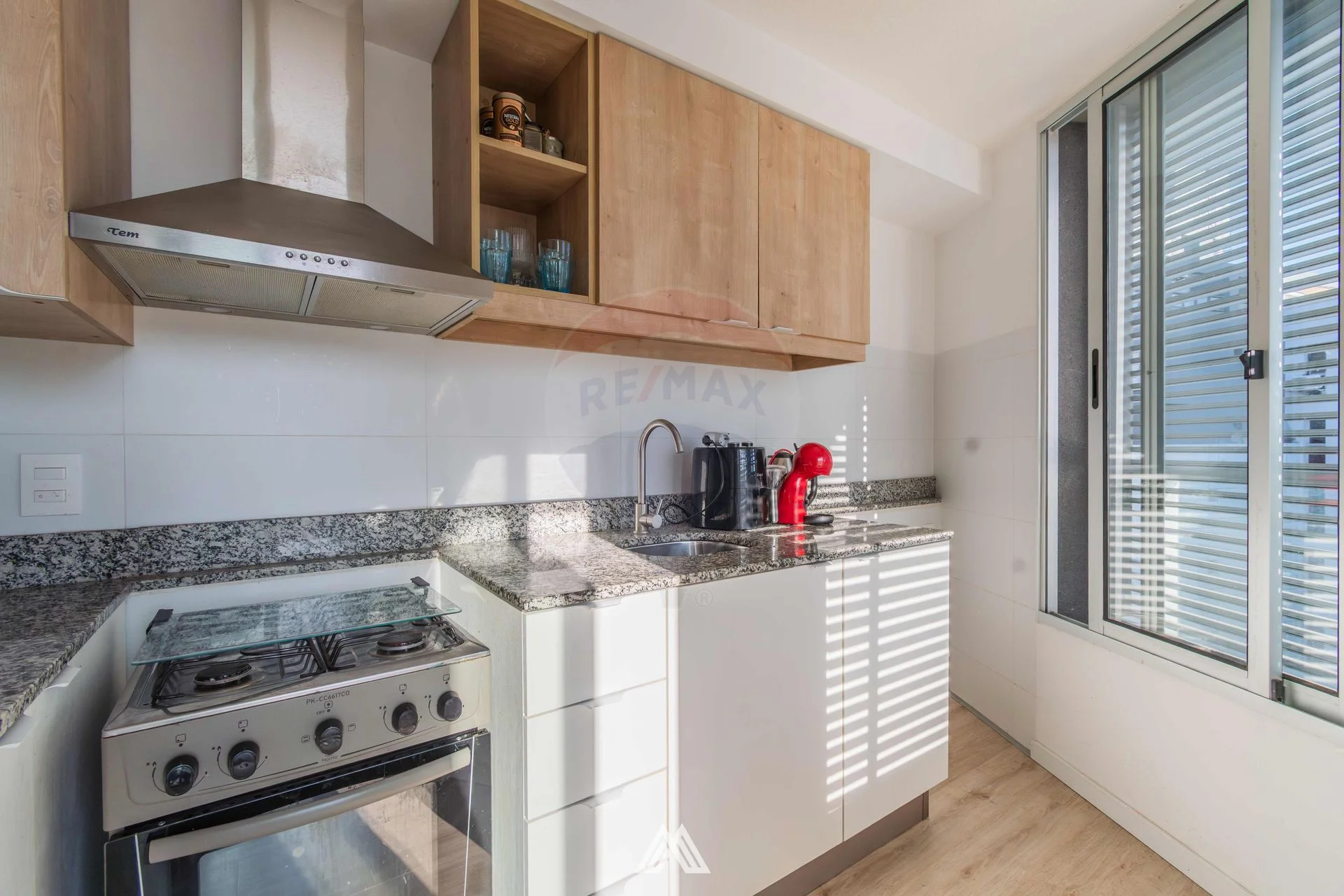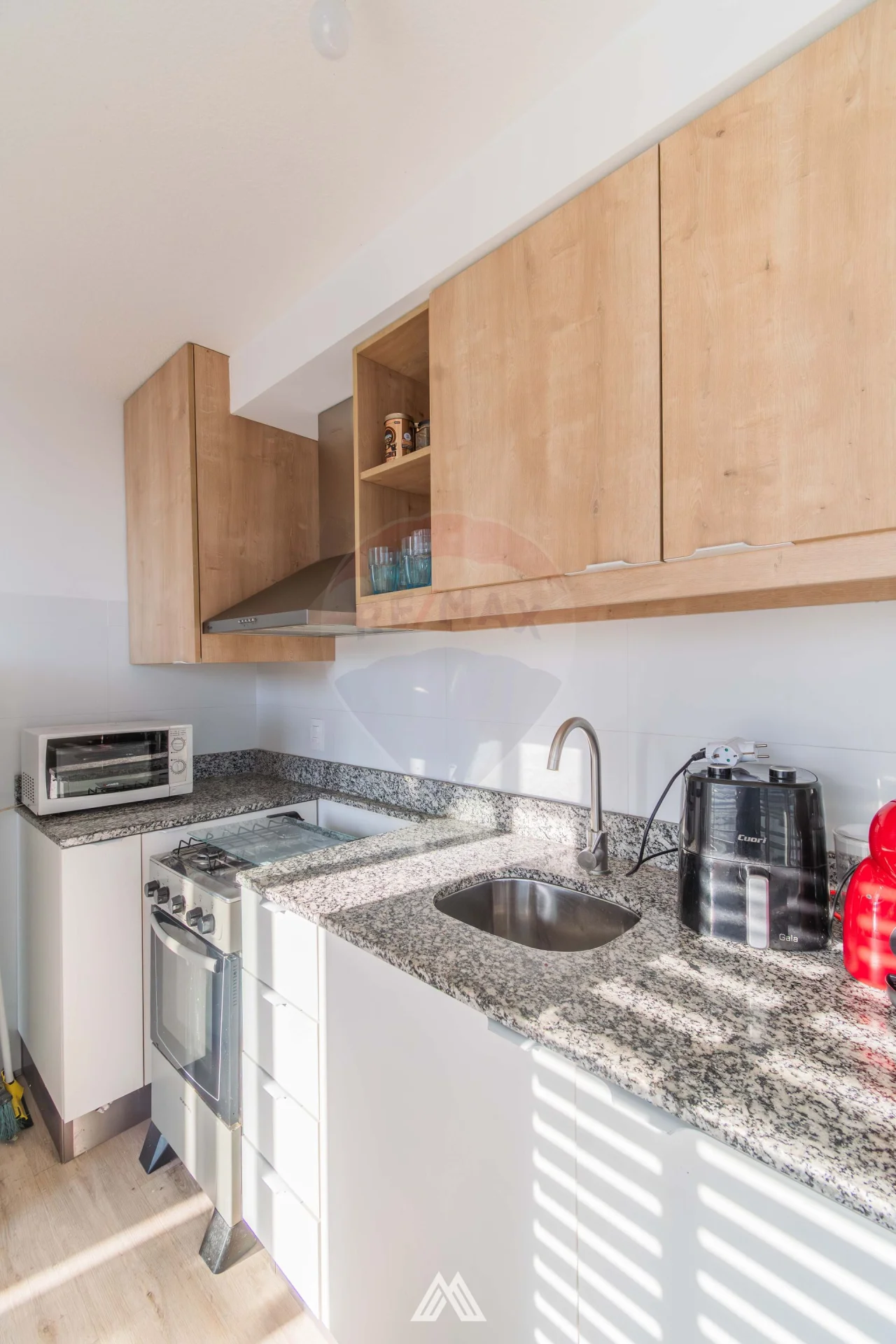Cocina semi integrada con placares aéreos y bajo mesada con campana.