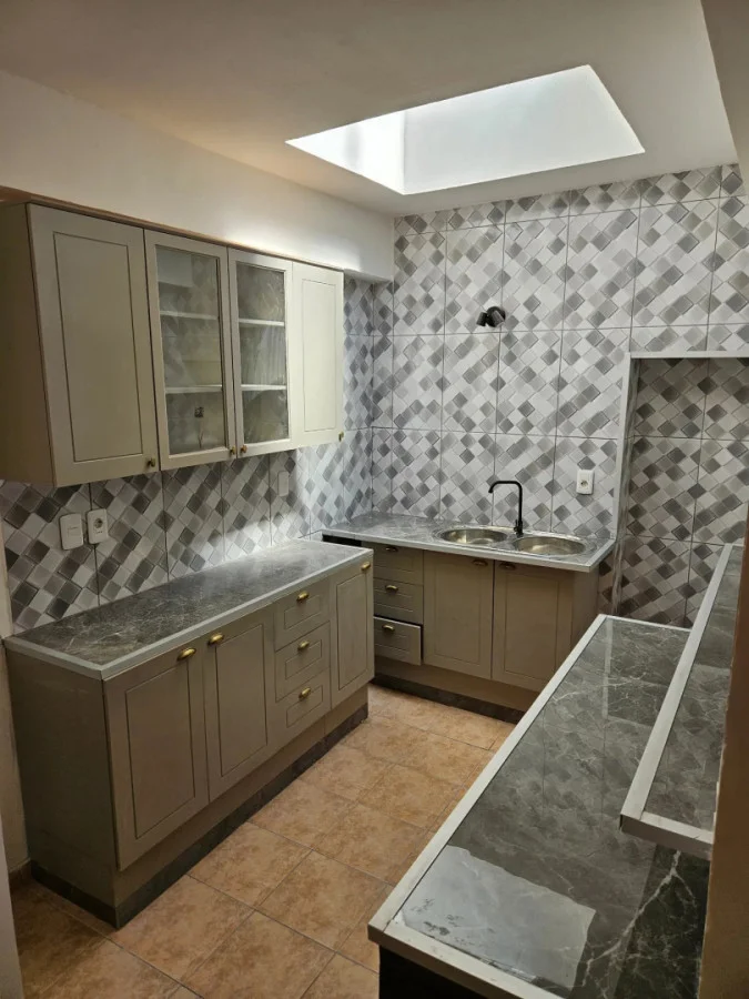 . Cocina definida reciclada a nuevo, muebles aéreos y bajo mesada modernos, doble pileta y extractor.