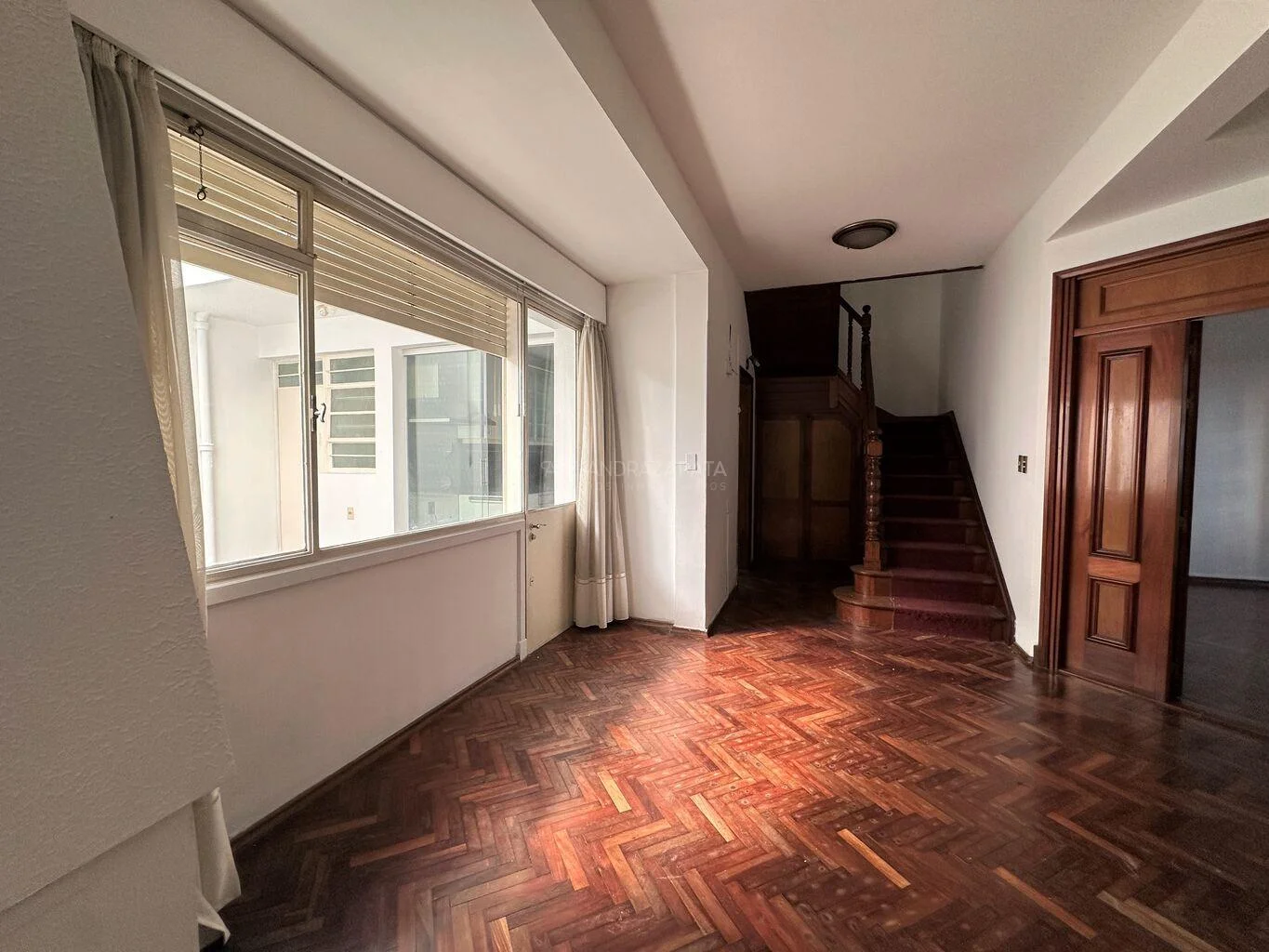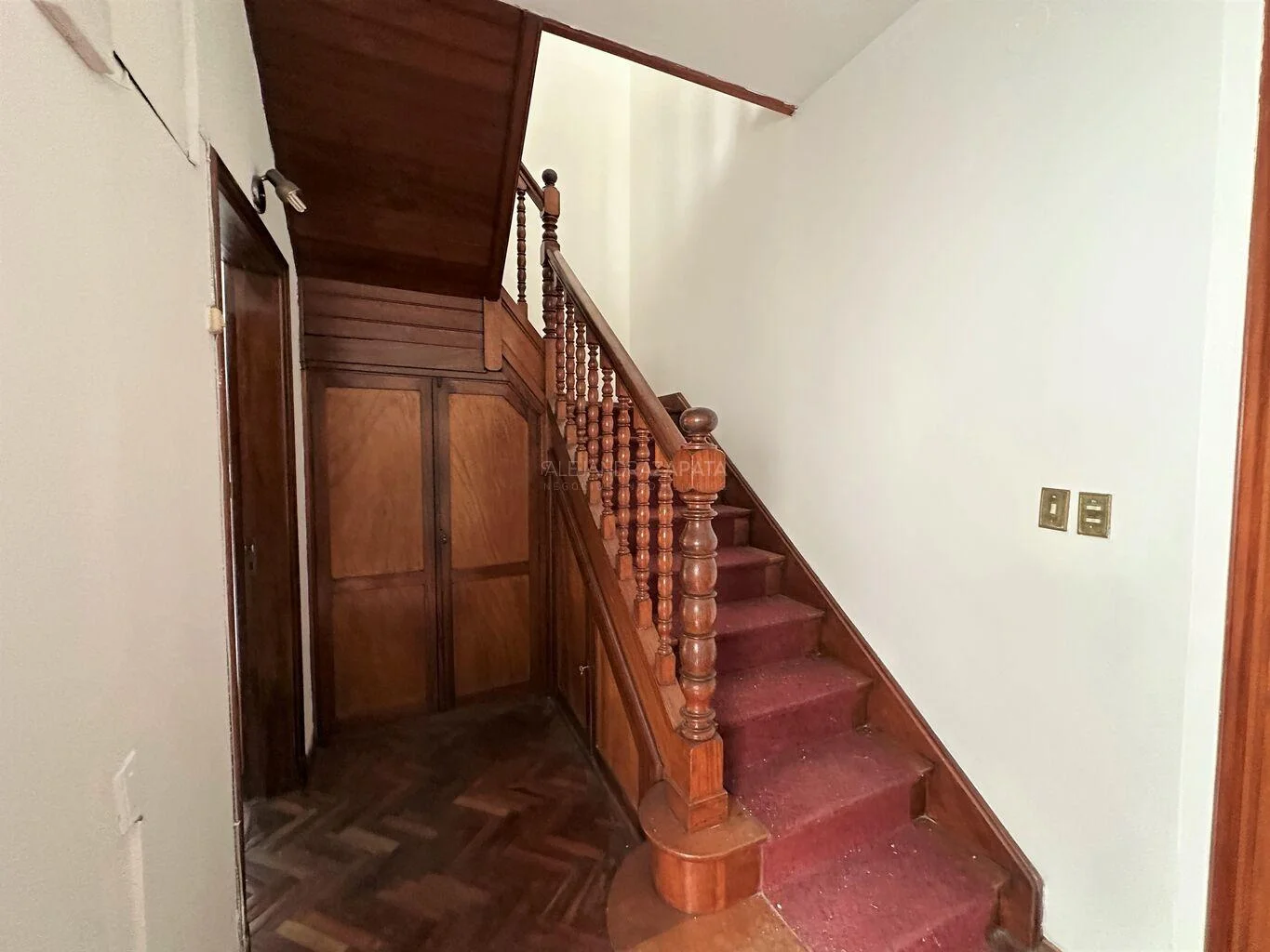 Escalera de acceso a la planta alta que mantiene la madera original, donde nos recibe un hall de distribución con salida a balcón trasero.