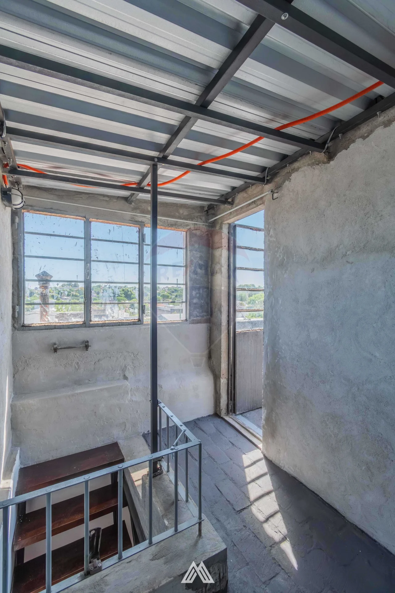 -Pasillo de distribución con escalera hacia la terraza transitable, equipada con techo liviano, juego de patio y segundo parrillero, perfecta para disfrutar de actividades al aire libre y vistas despejadas.
