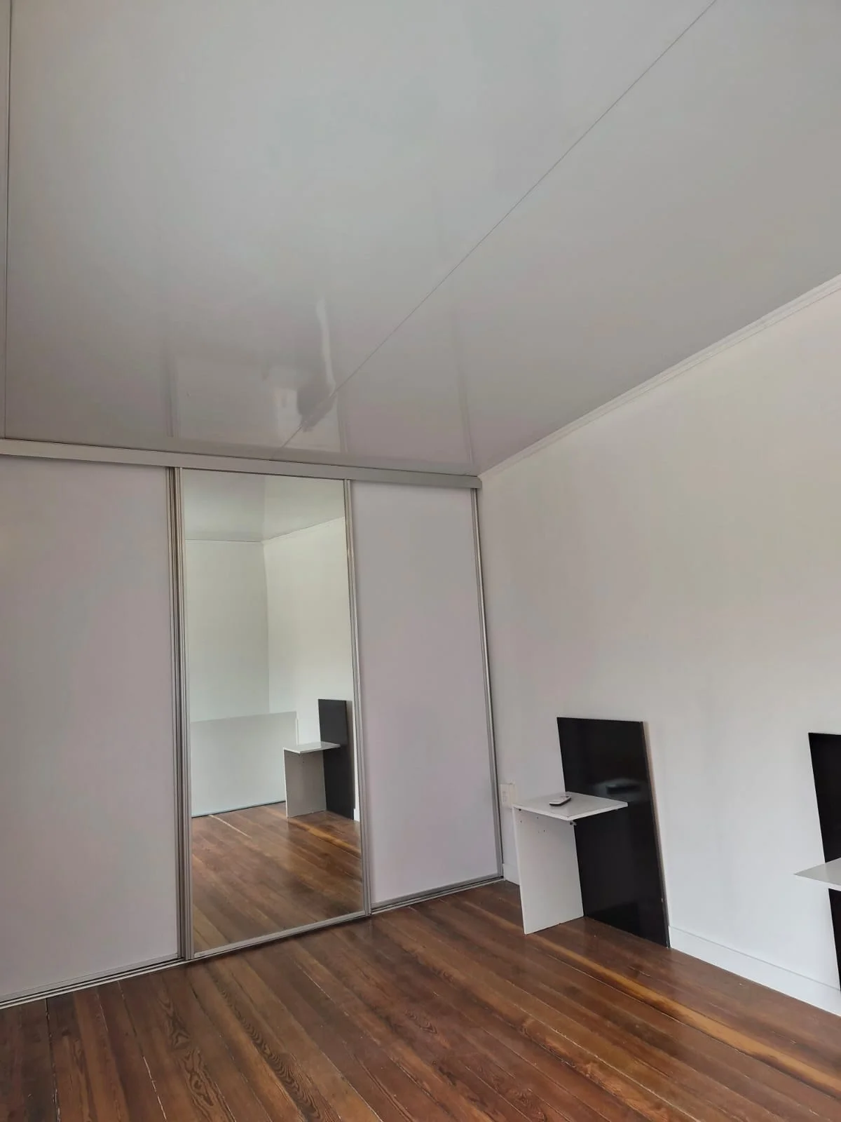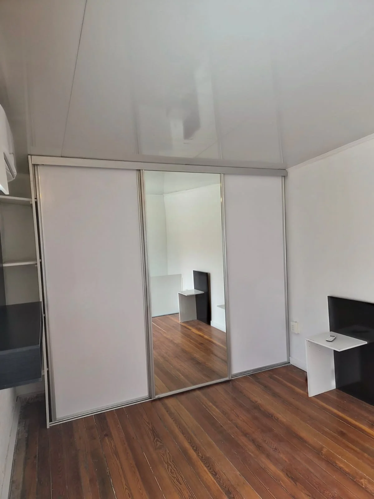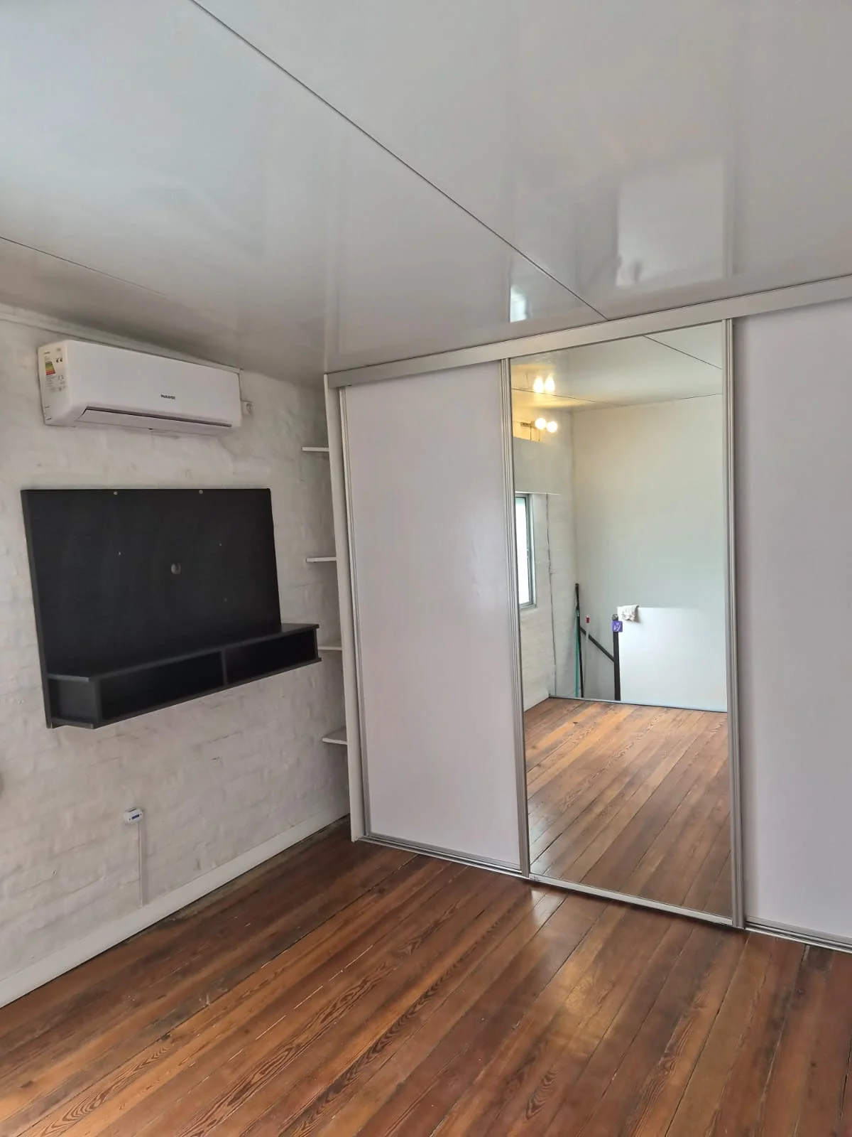 Dormitorio principal en planta alta con amplio placard empotrado con puertas corredizas y espejo de piso a techo, rack instalado para TV y aire acondicionado inverter