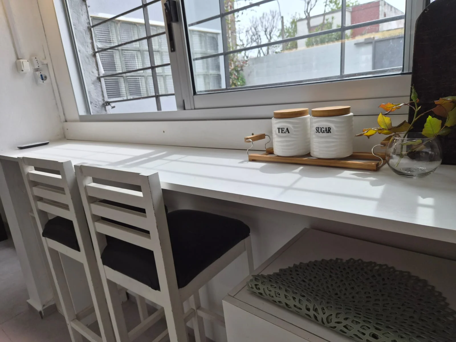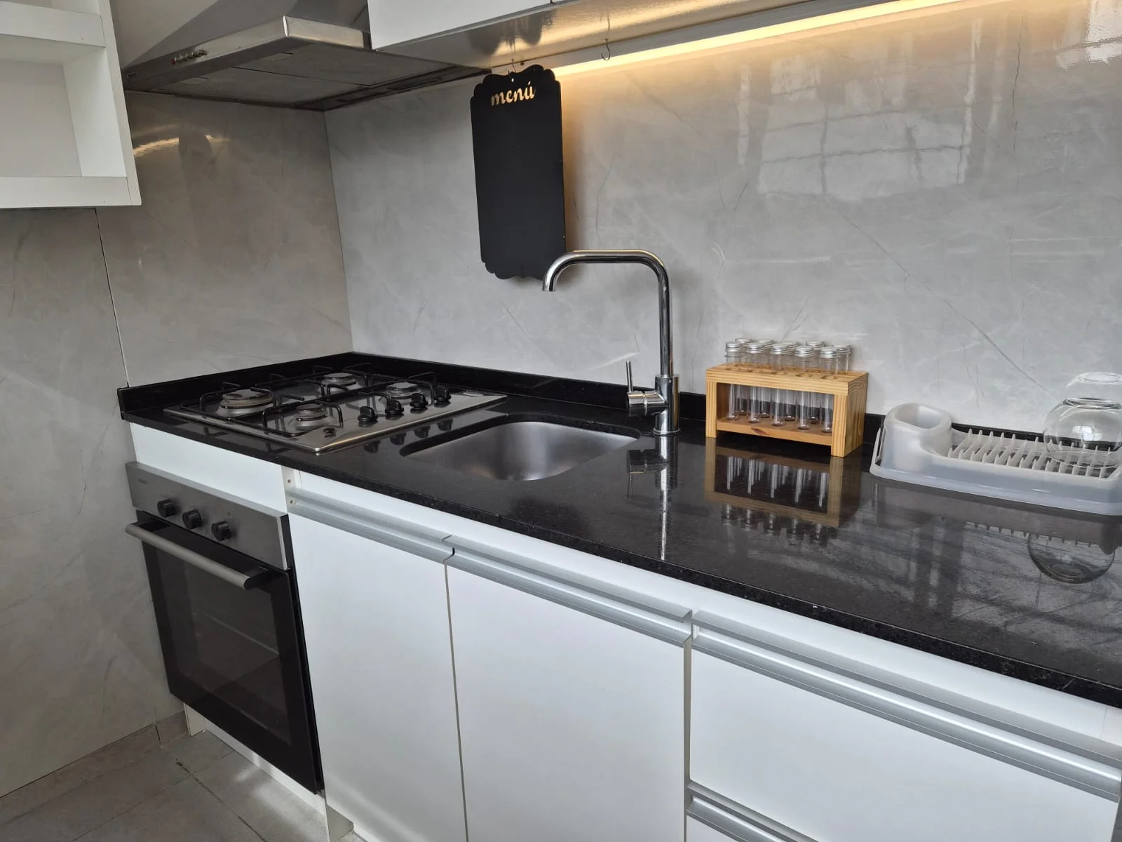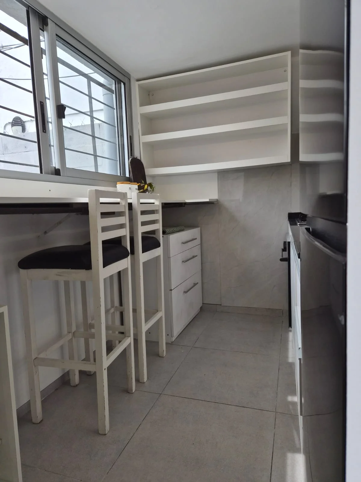 Living- comedor con aire acondicionado inverter , cocina sumamente completa con anafe a gas, horno empotrado eléctrico, campana extractora, heladera con freezer, aéreos y bajomesada, barra con 2 butacas.