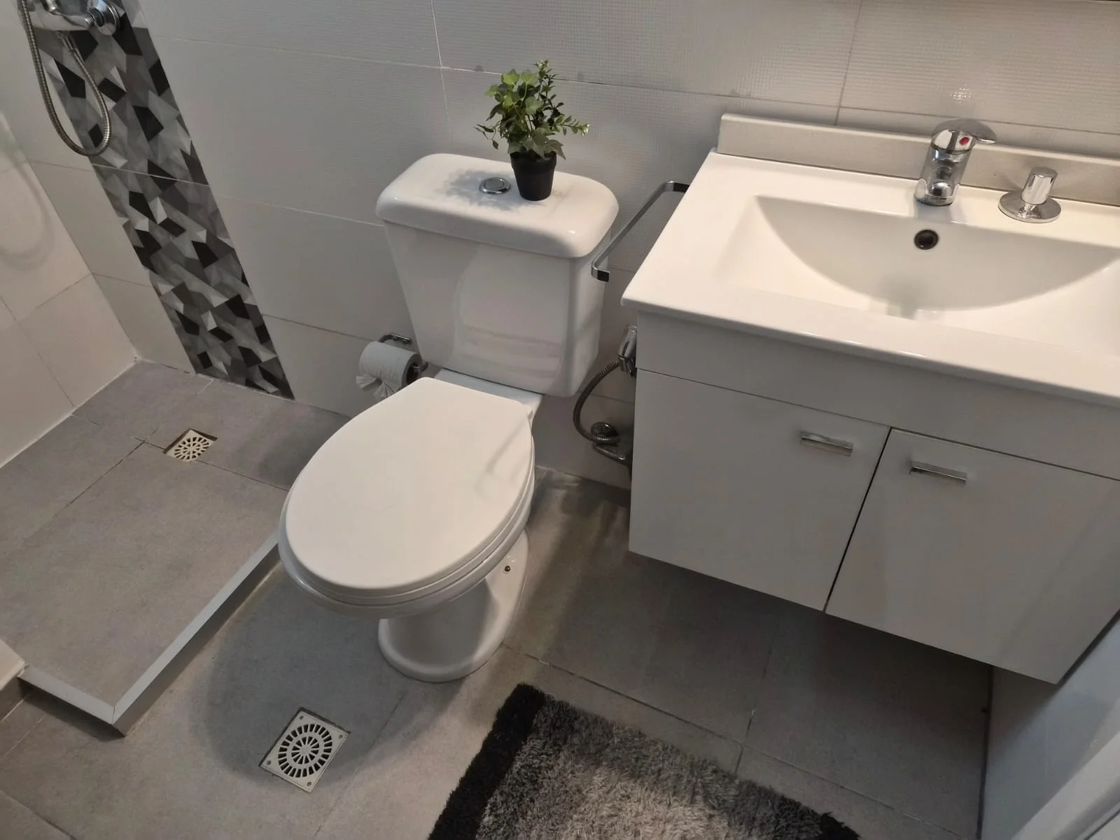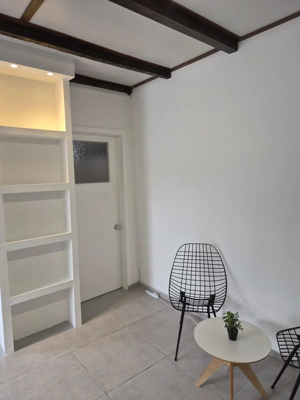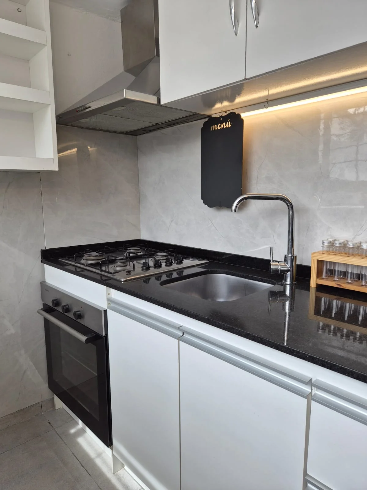Living- comedor con aire acondicionado inverter , cocina sumamente completa con anafe a gas, horno empotrado eléctrico, campana extractora, heladera con freezer, aéreos y bajomesada, barra con 2 butacas.