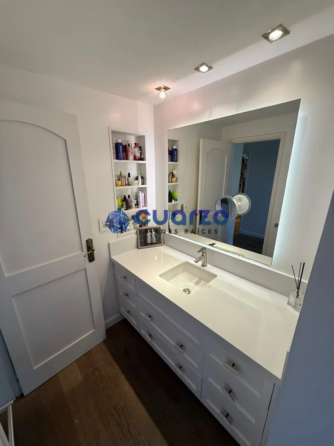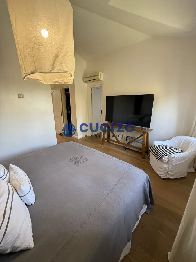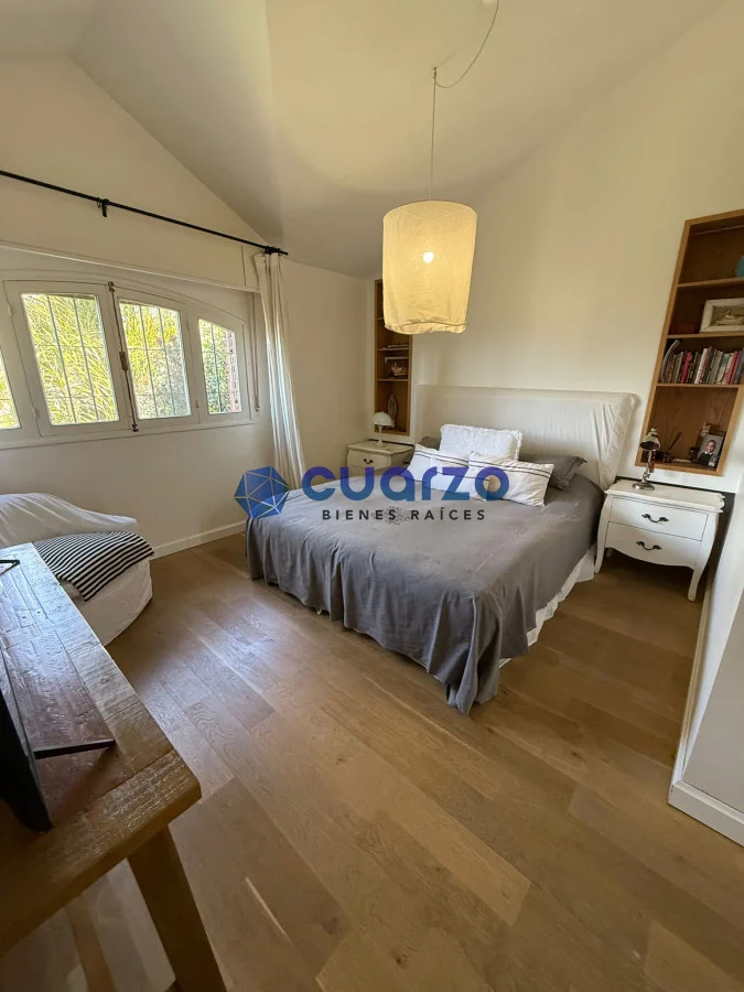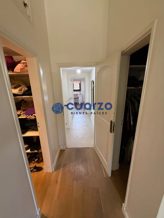 Dormitorio principal en suite con vestidor y piso de madera de ingeniería.