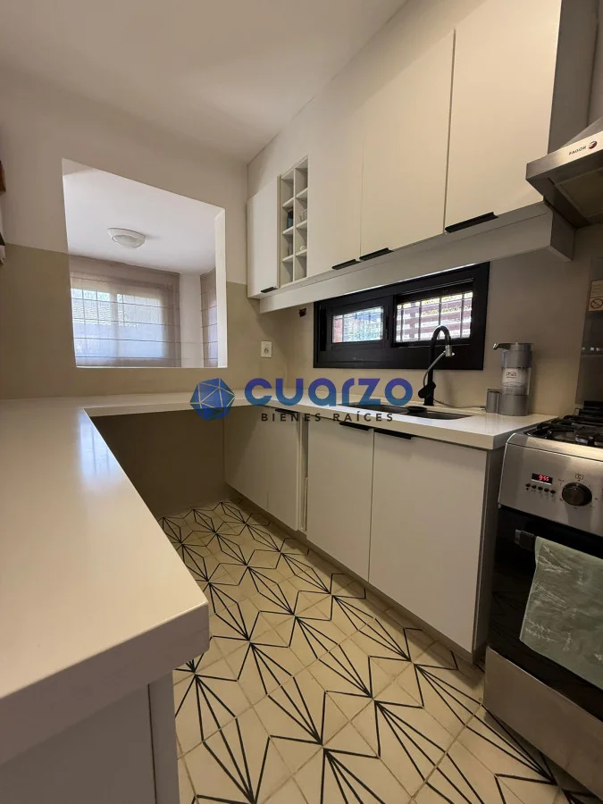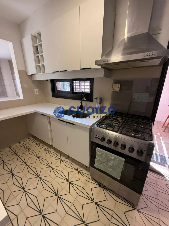 Cocina definida con campana extractora y muebles sobre y bajo mesada.