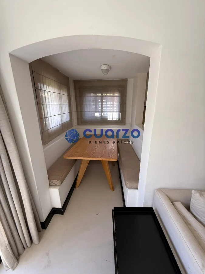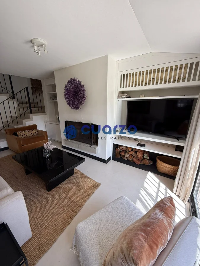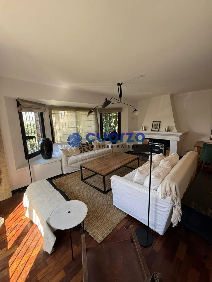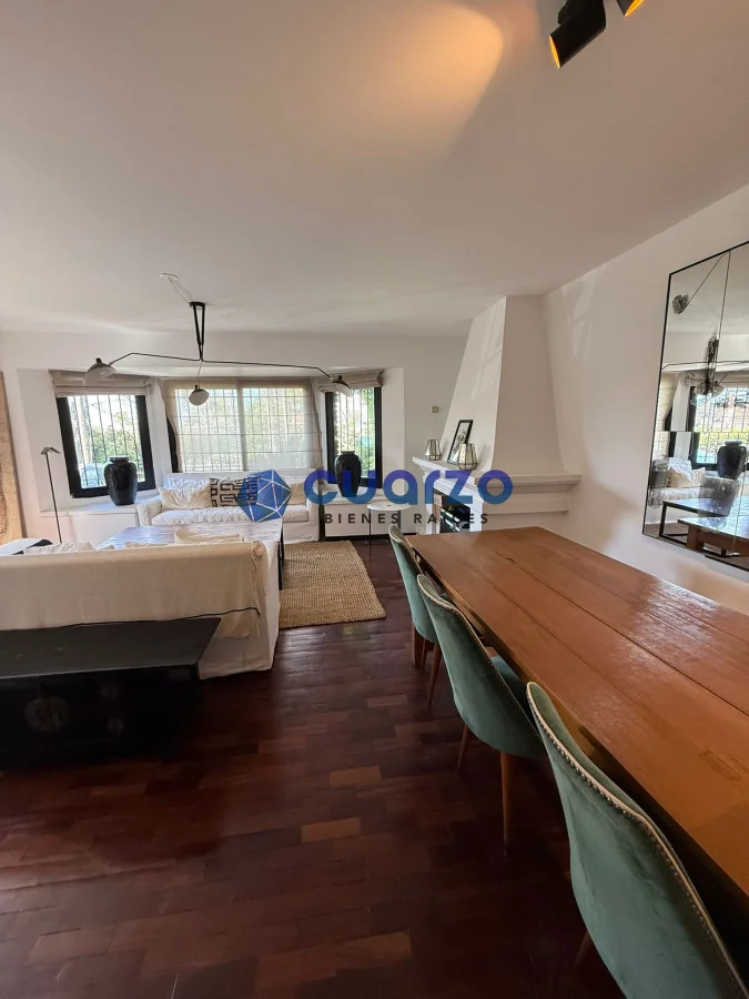 La unidad tiene un amplio living comedor con estufa a leña y pisos de parquet.