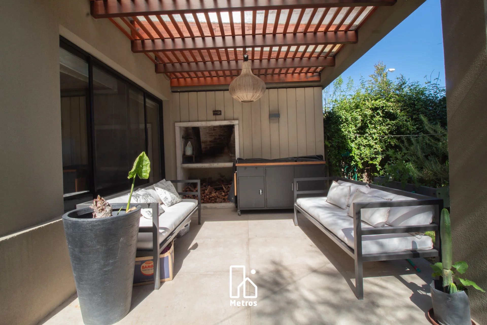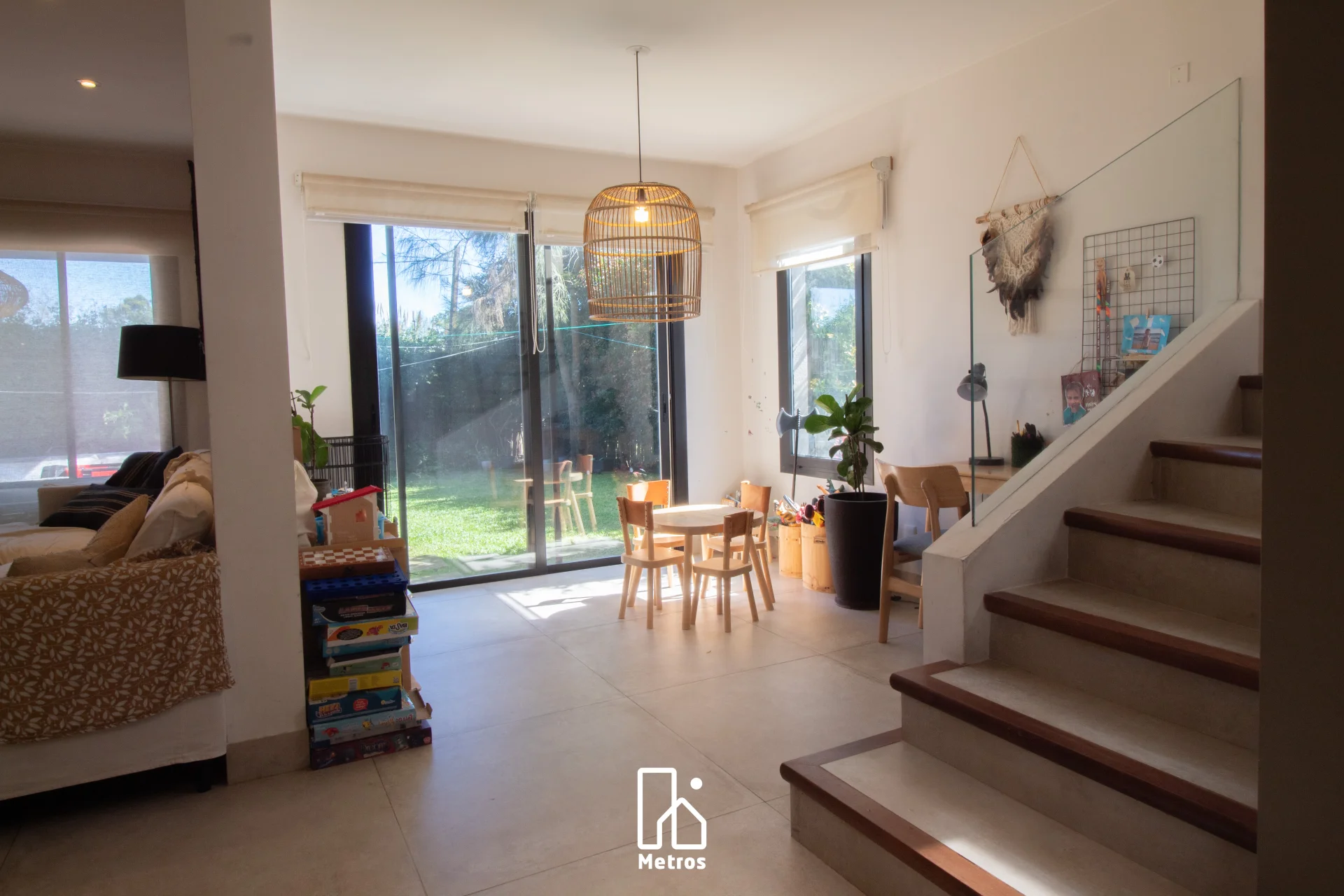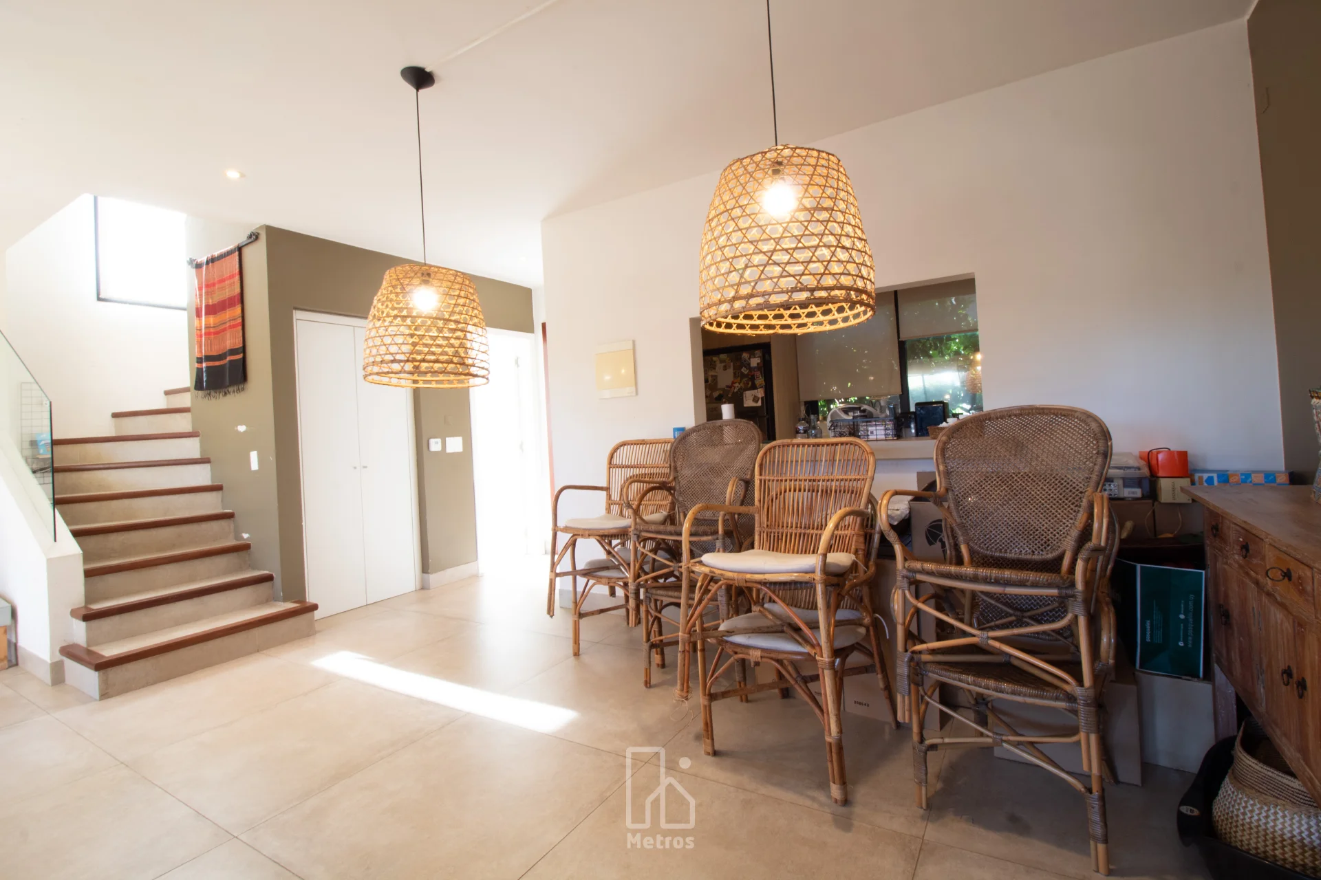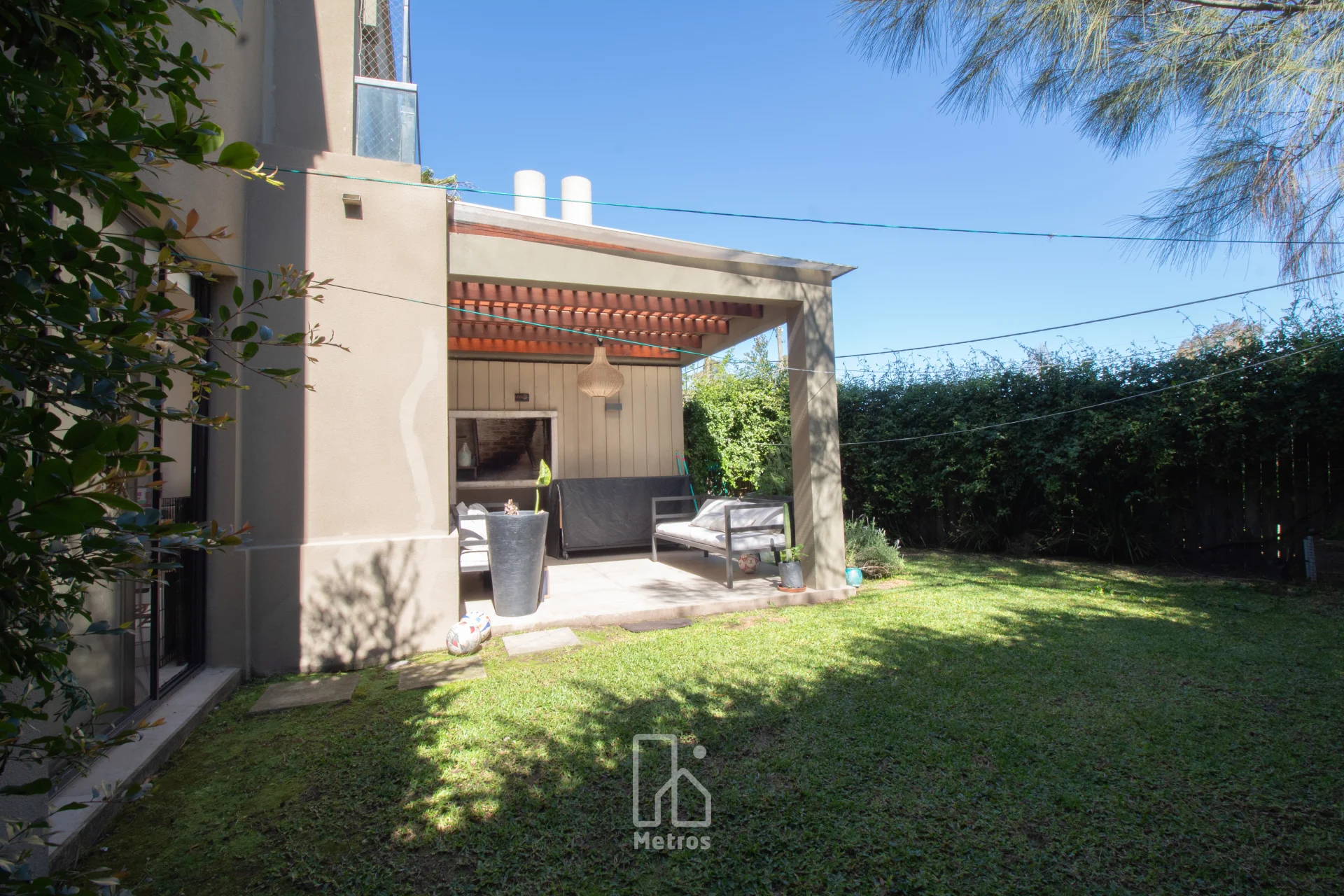 En planta baja se desarrolla un amplio y luminoso living comedor con estufa a leña y estar, cocina semi-integrada con pasaplatos y baño social. Desde el living se accede al exterior, donde se encuentra un parrillero bajo pérgola techada y un jardín orientado al Noroeste, perfecto para disfrutar del sol de la tarde.
