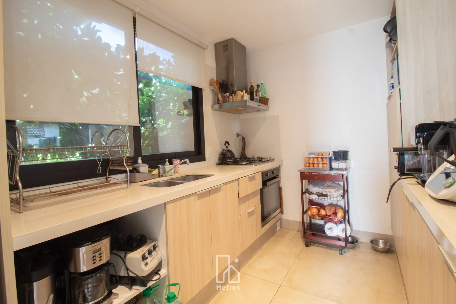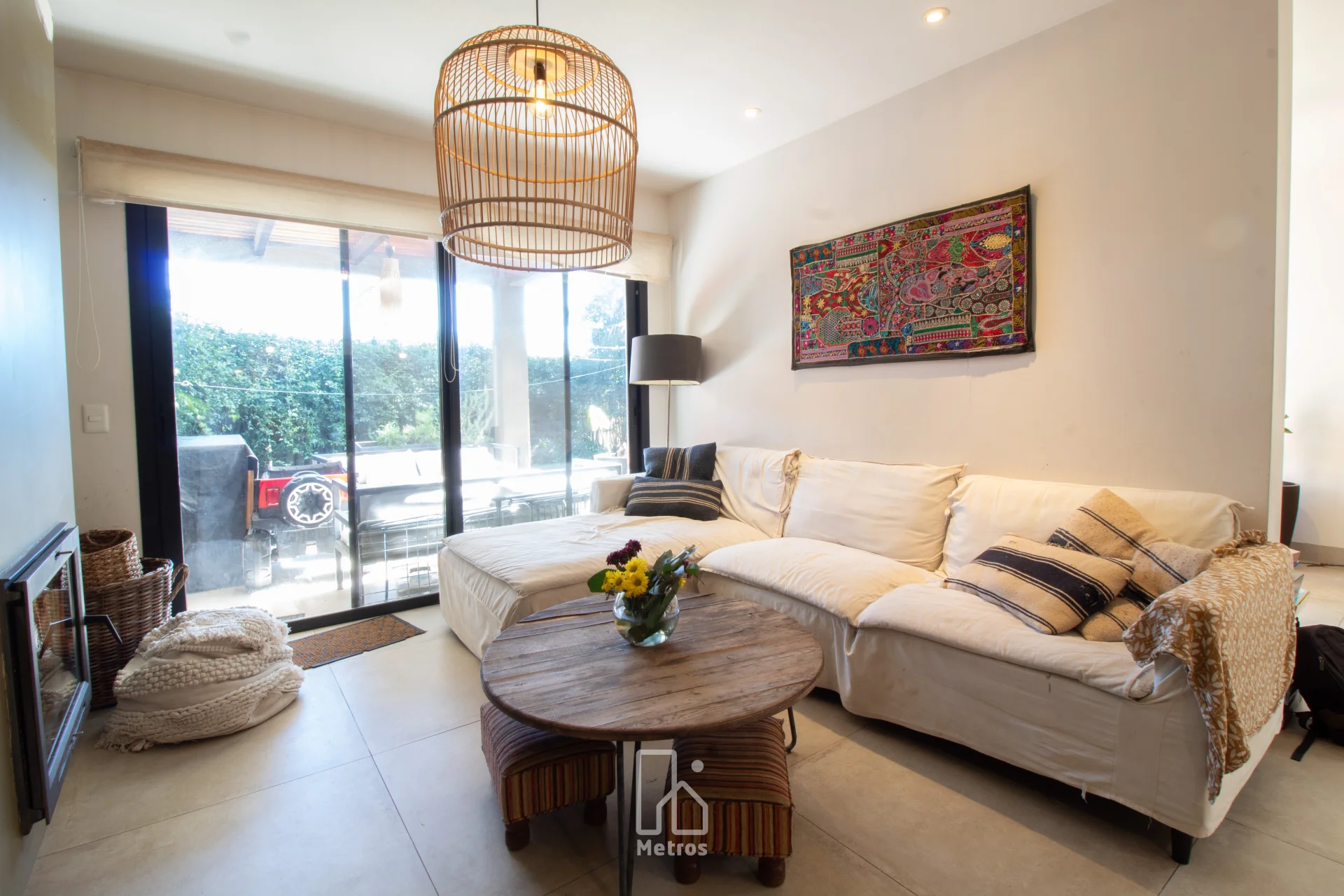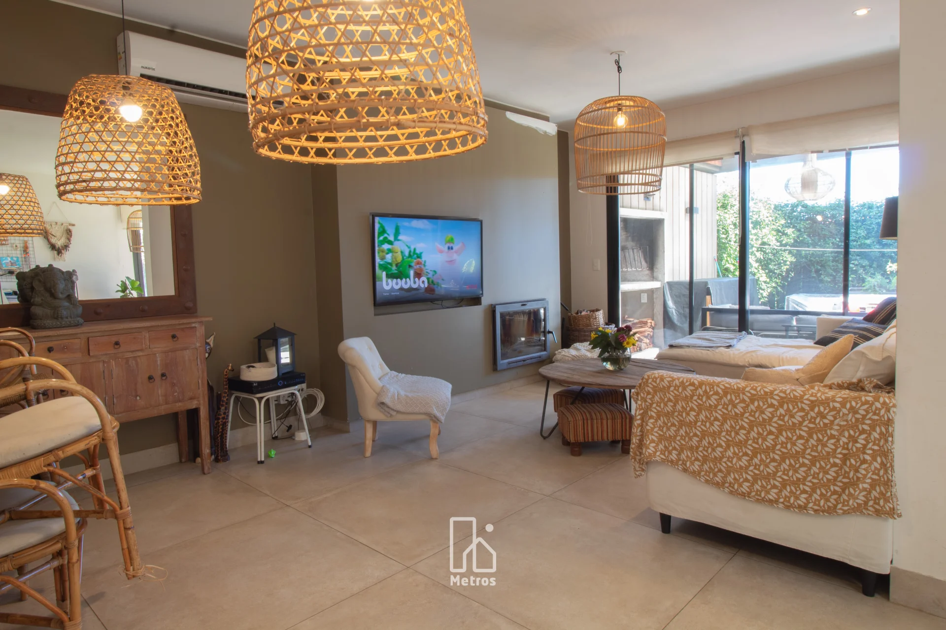 En planta baja se desarrolla un amplio y luminoso living comedor con estufa a leña y estar, cocina semi-integrada con pasaplatos y baño social. Desde el living se accede al exterior, donde se encuentra un parrillero bajo pérgola techada y un jardín orientado al Noroeste, perfecto para disfrutar del sol de la tarde.