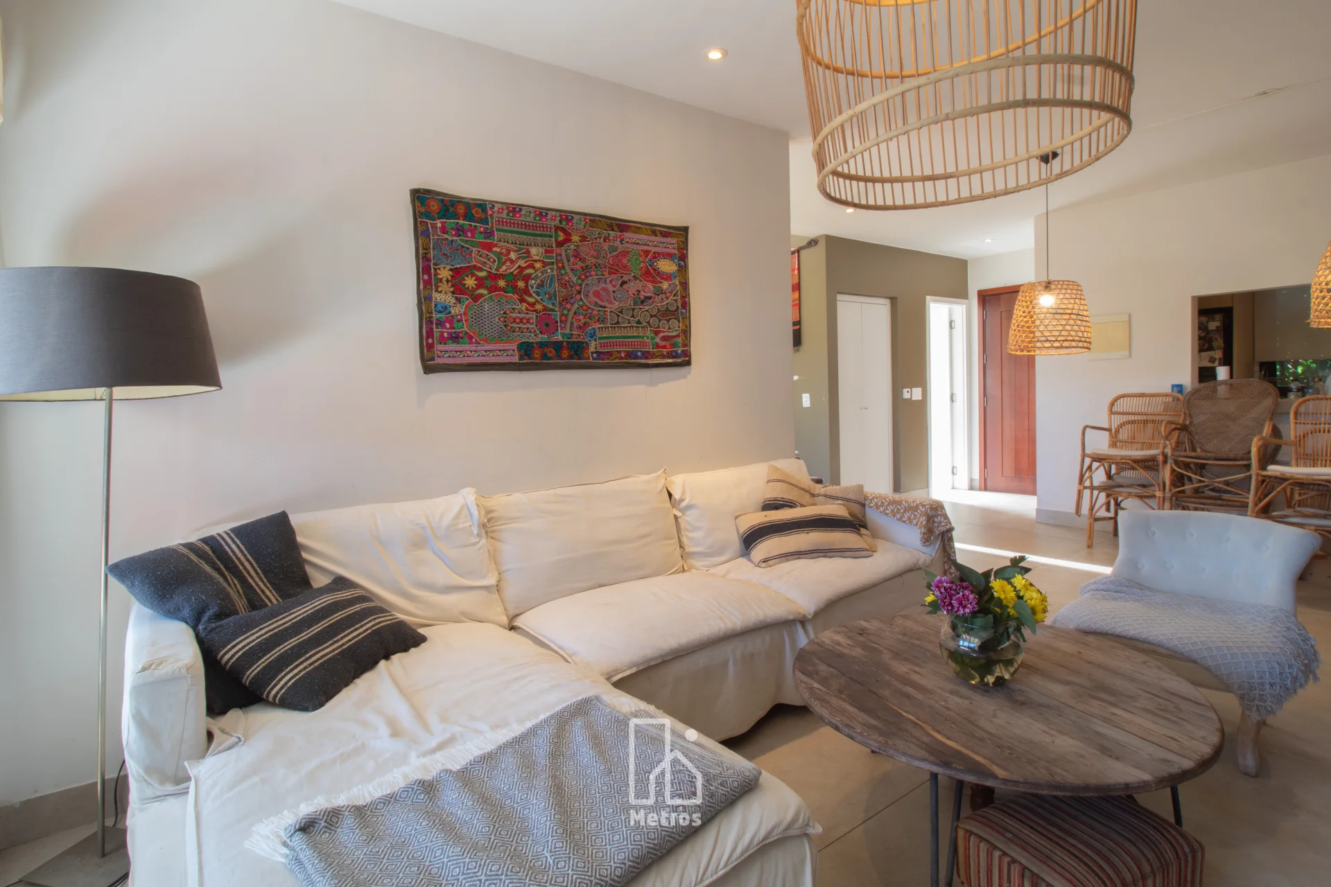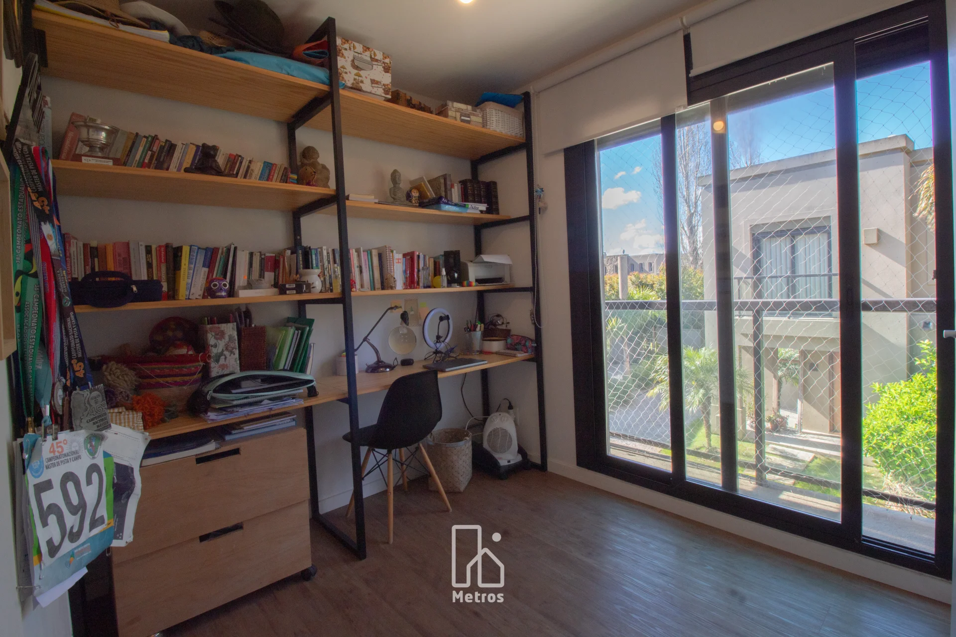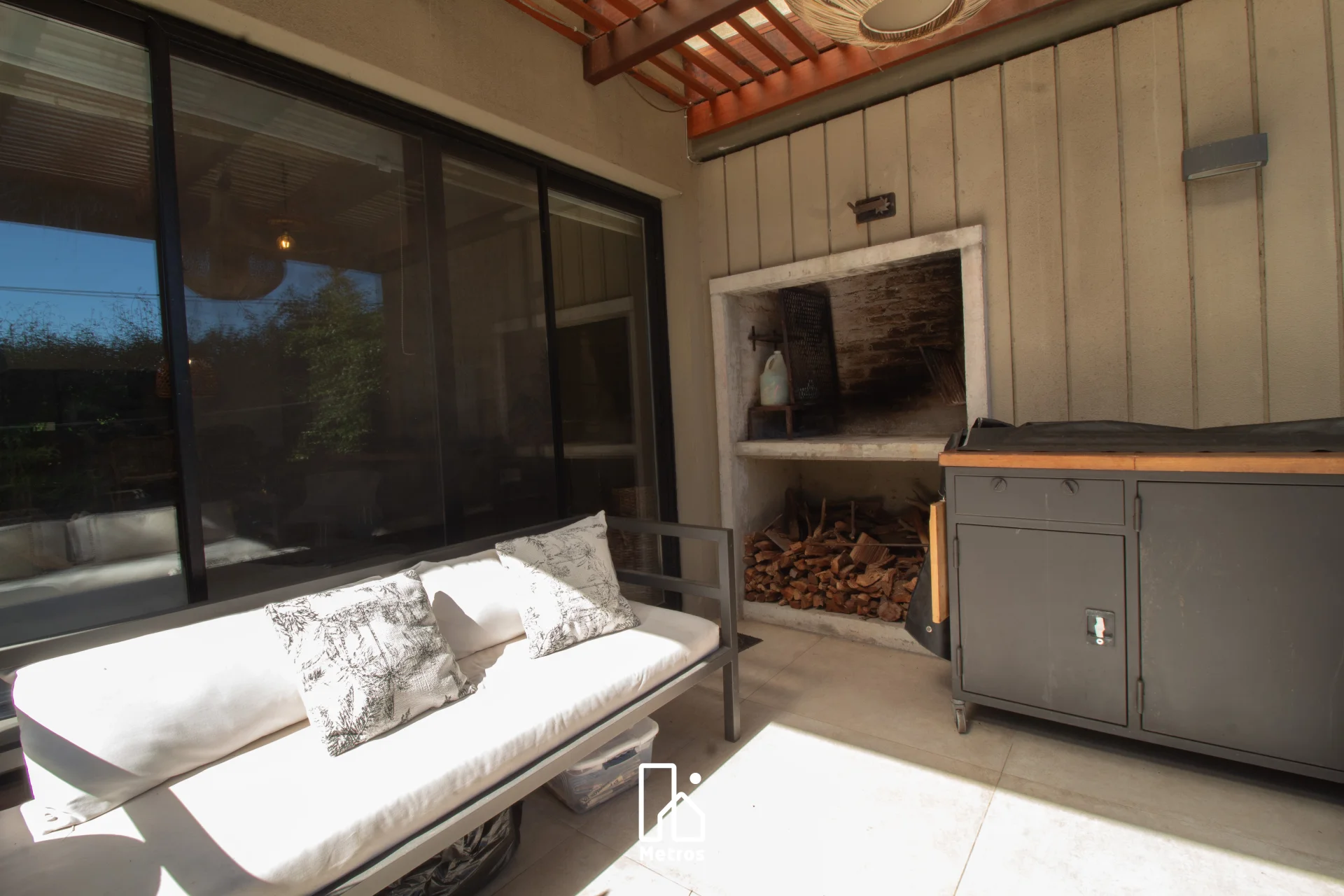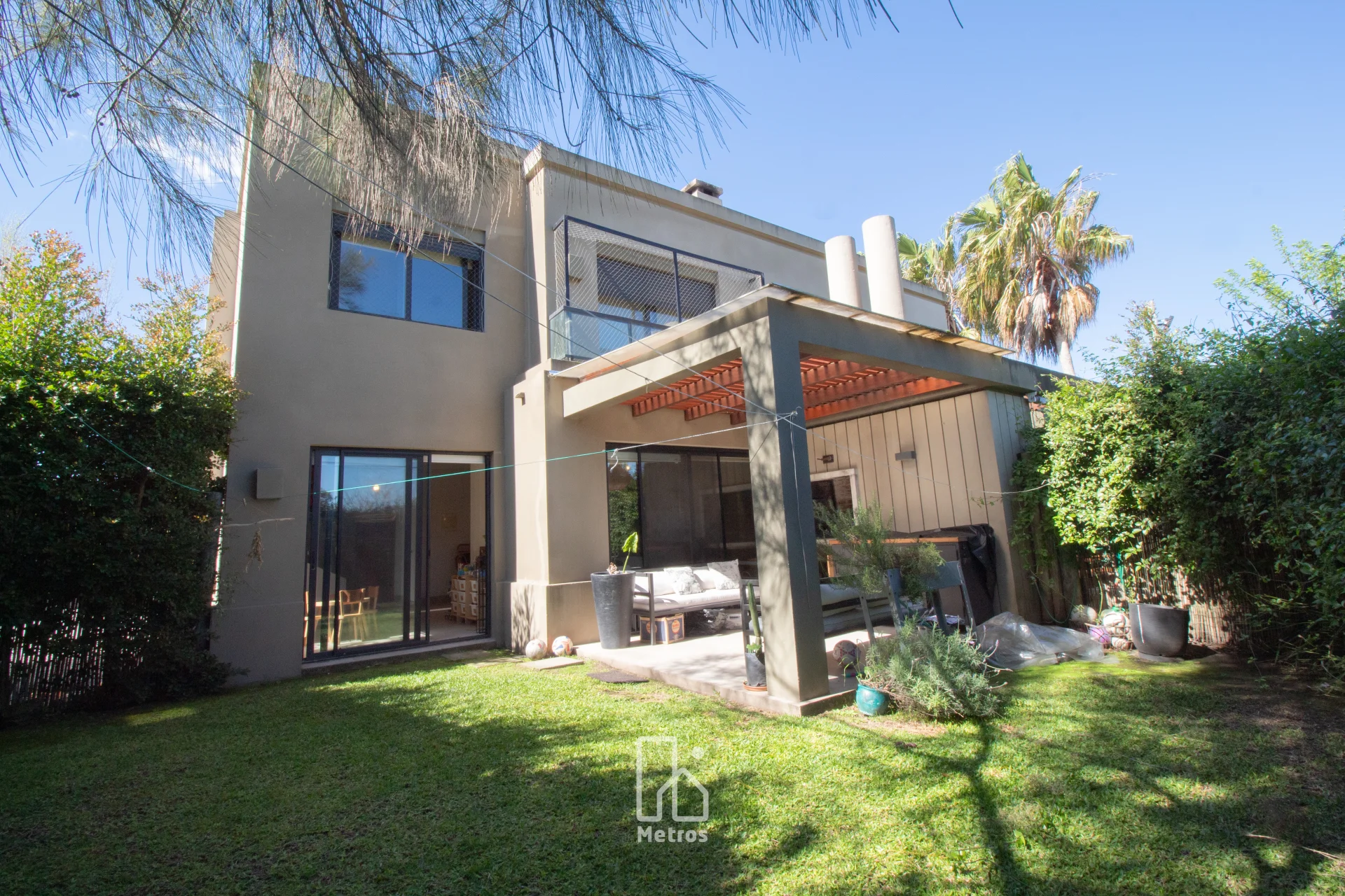 En planta baja se desarrolla un amplio y luminoso living comedor con estufa a leña y estar, cocina semi-integrada con pasaplatos y baño social. Desde el living se accede al exterior, donde se encuentra un parrillero bajo pérgola techada y un jardín orientado al Noroeste, perfecto para disfrutar del sol de la tarde.