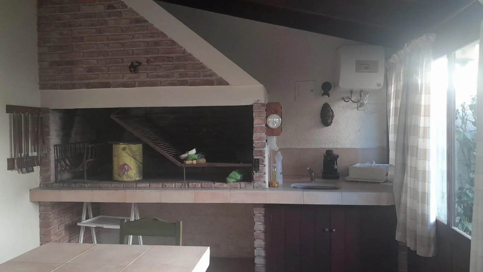 Hermoso fondo verde con barbacoa cerrada equipada, parrillero.