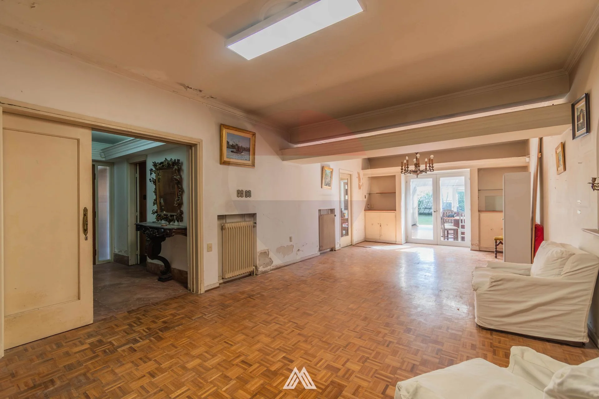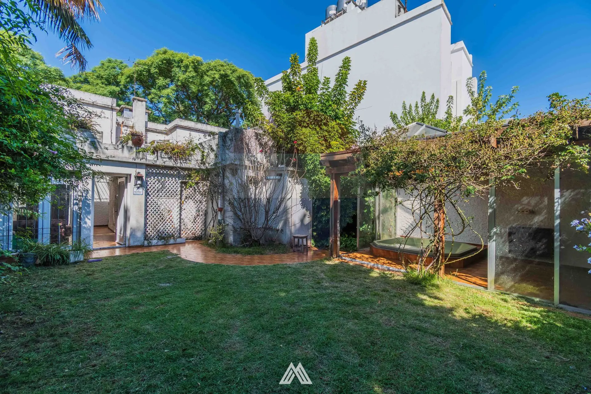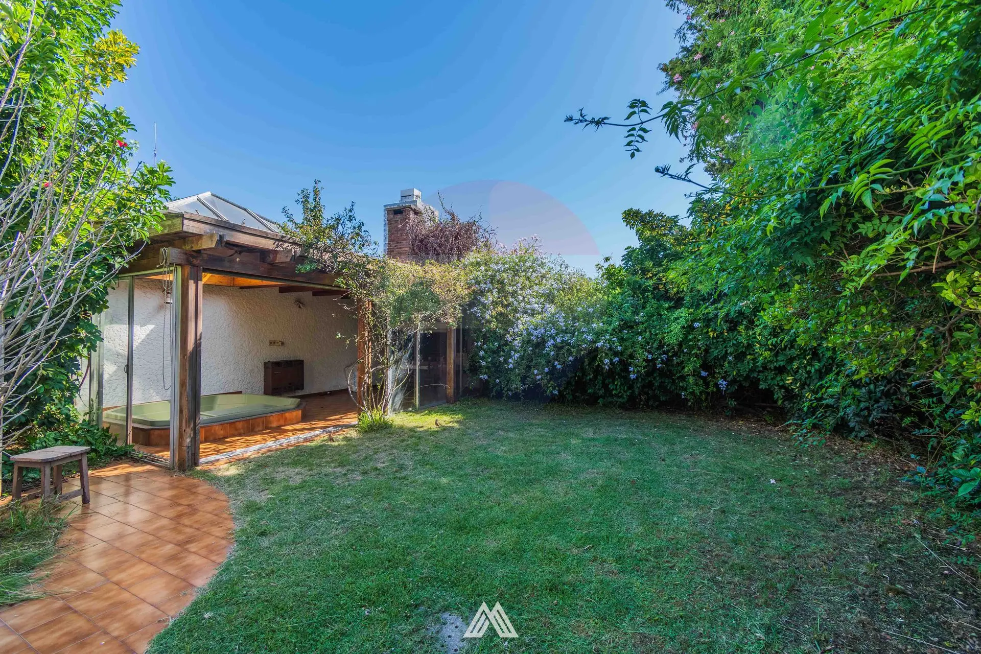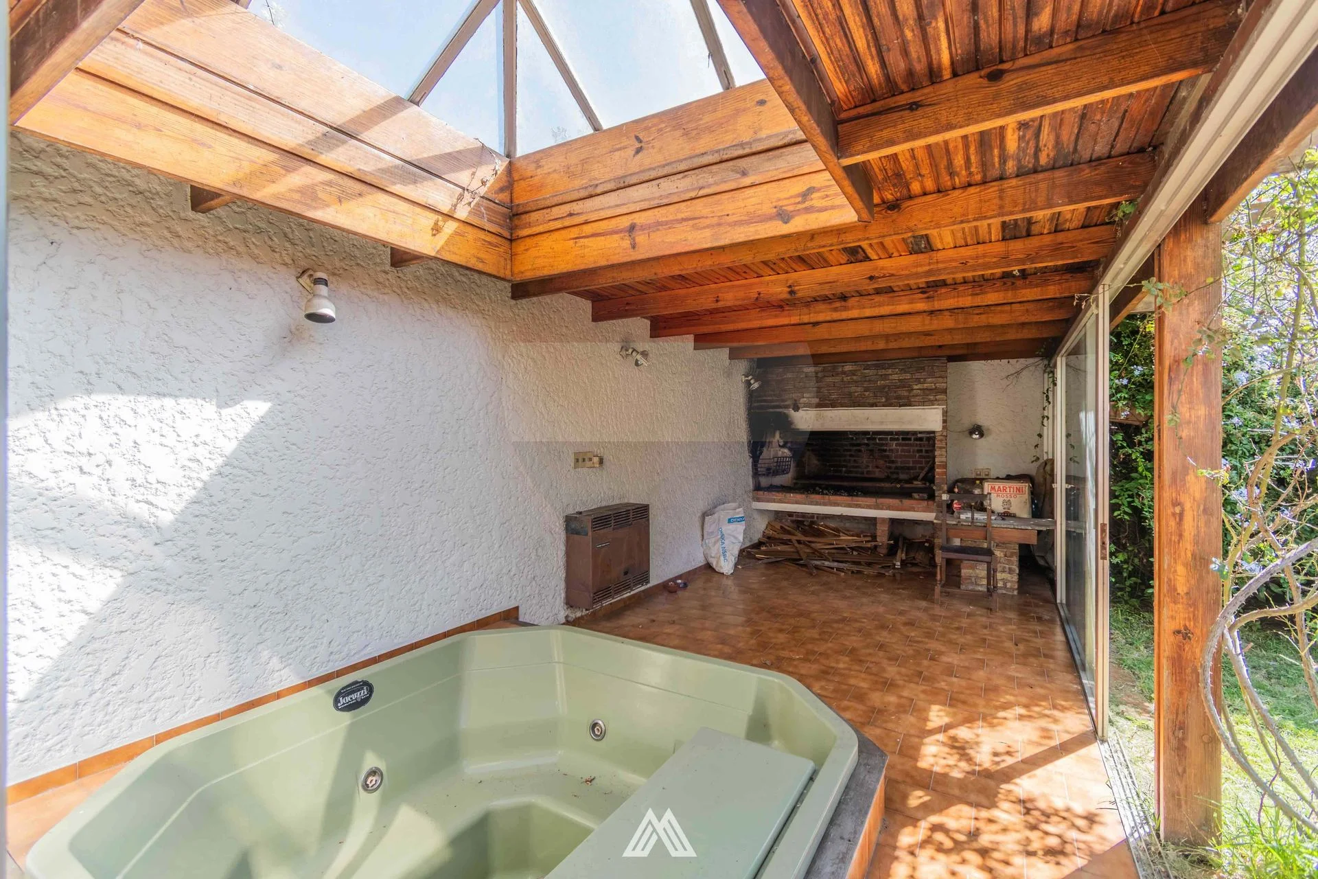 En el siguiente ambiente se encuentra el living, de gran tamaño con lucernario. Salida al jardín con parrillero, el mismo cuenta con un espacio de lavadero, y bajo techo liviano un jacuzzi.