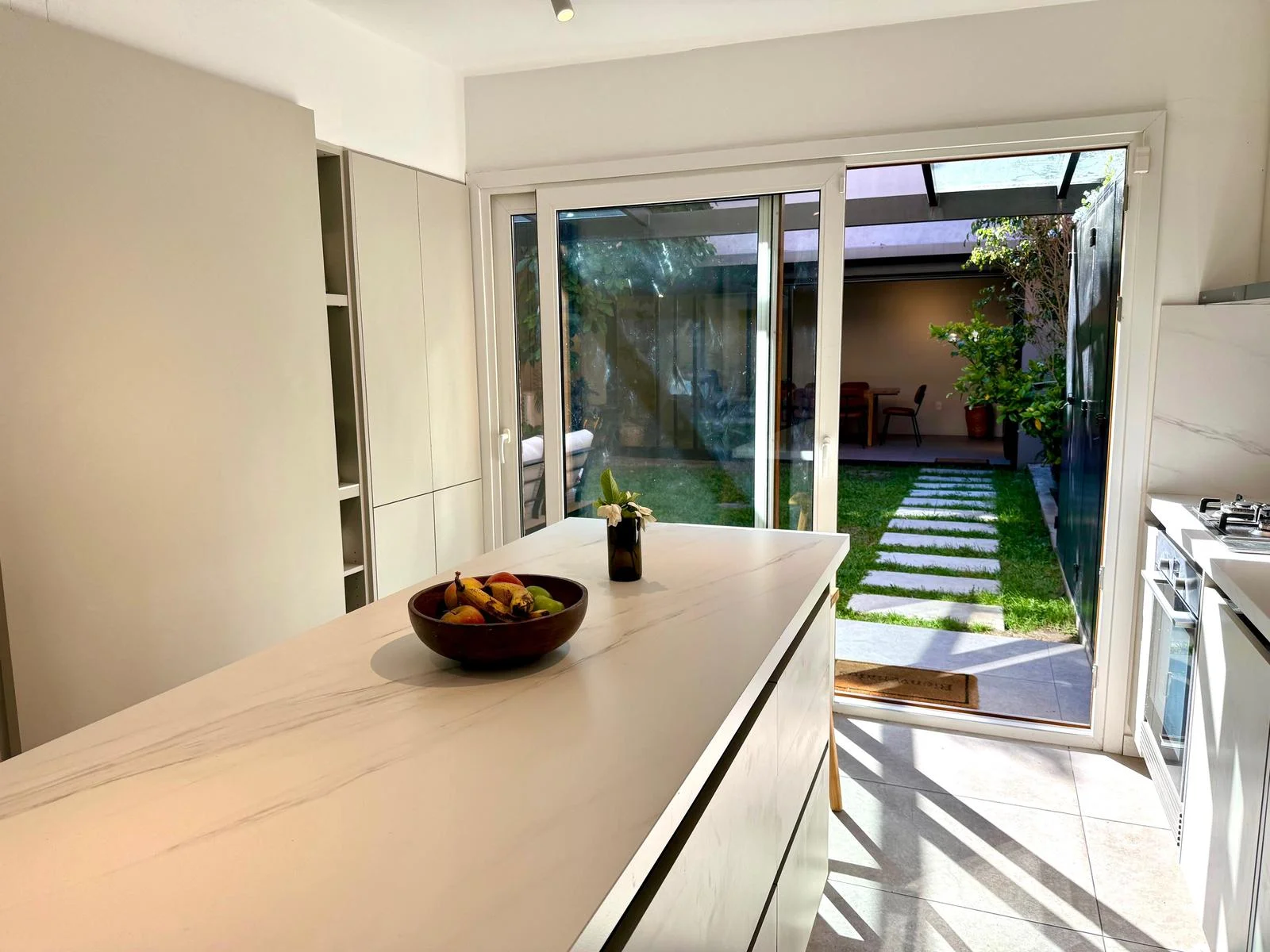 Cocina con isla con mucho lugar de guardado con salida al jardín y área de lavaderos