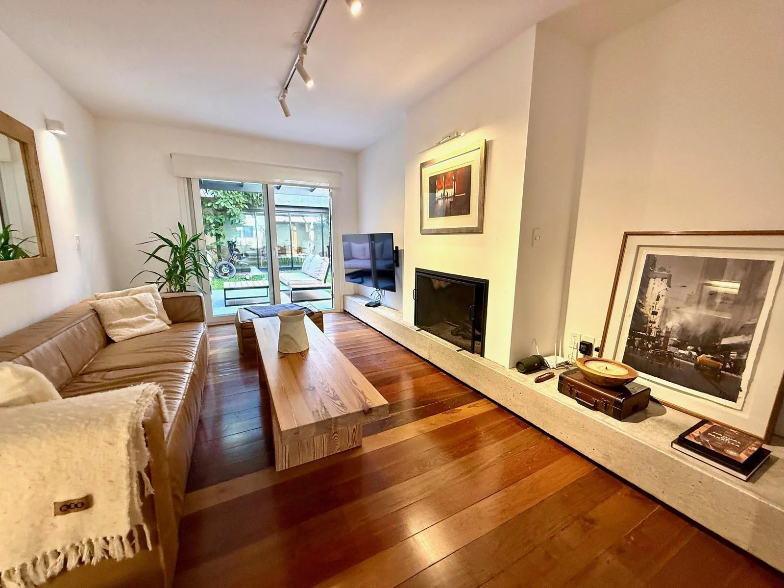 Entrada a hall distribuidor con armario de guardado muy cómodo, living comedor amplio con espectaculares pisos de madera y estufa a leña y ventanales al jardin .