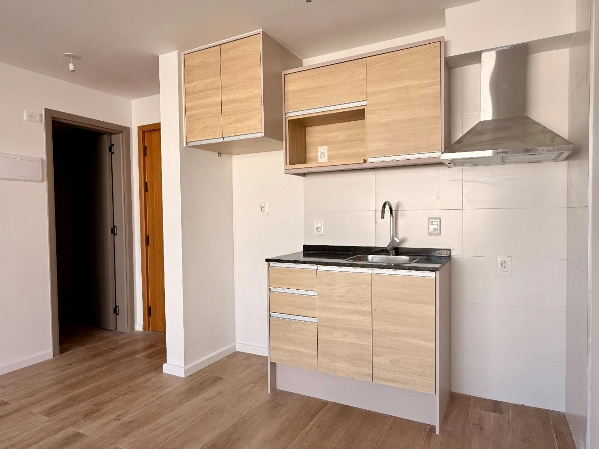 La cocina semi integrada presenta un diseño moderno, con muebles aéreos y bajo mesada, campana extractora y buen espacio de guardado, integrándose de forma funcional al área social.