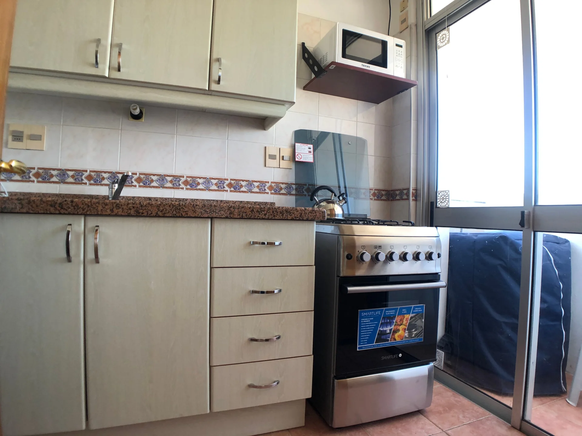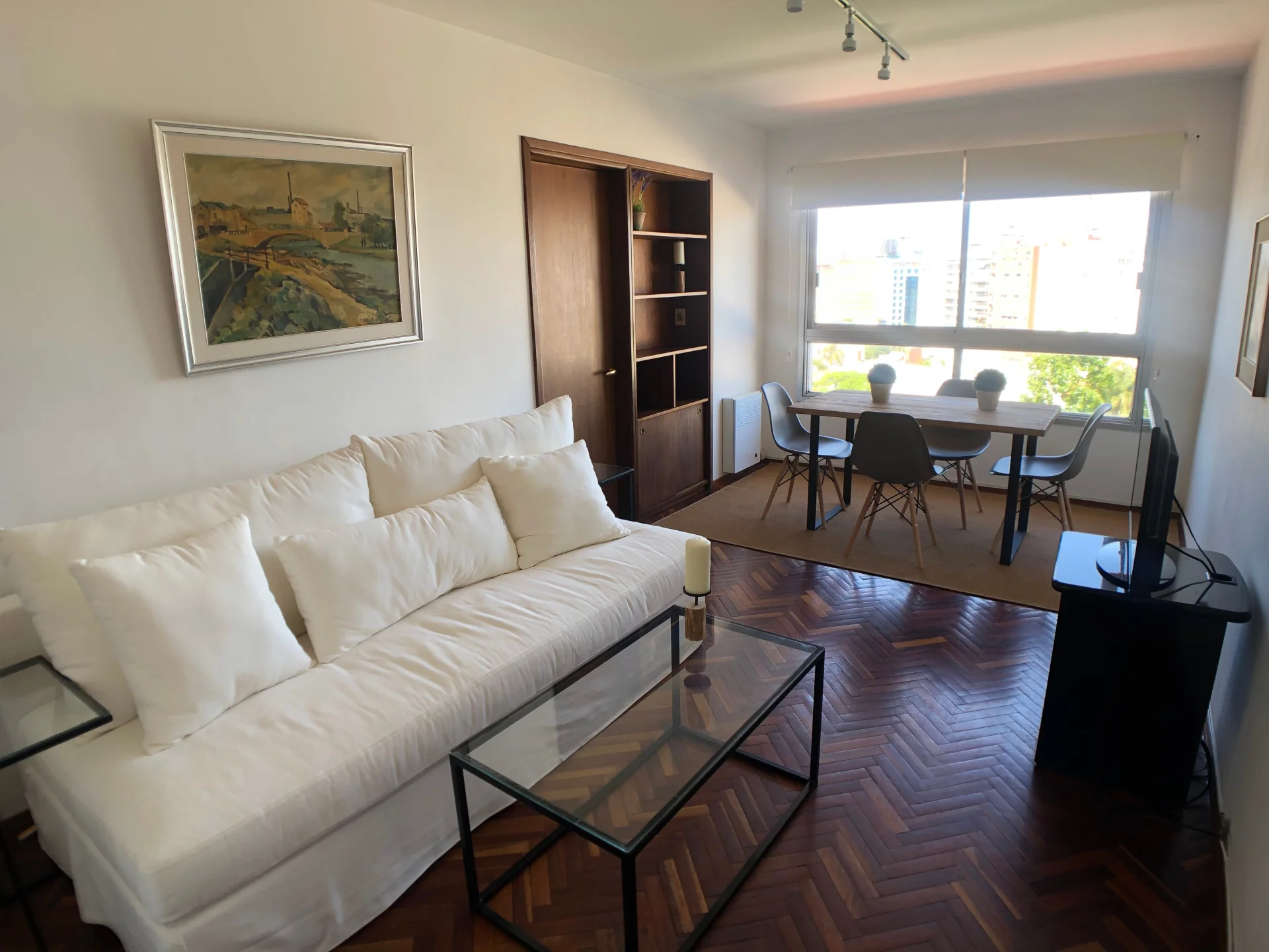 El apartamento se encuentra en un séptimo piso, lo que le otorga una vista privilegiada y una gran luminosidad durante todo el día. Cuenta con un cómodo living comedor, cocina definida con terraza lavadero, un dormitorio amplio con placard y espacio para escritorio, y un baño completo. Se alquila completamente amoblado e incluye garaje fijo.
