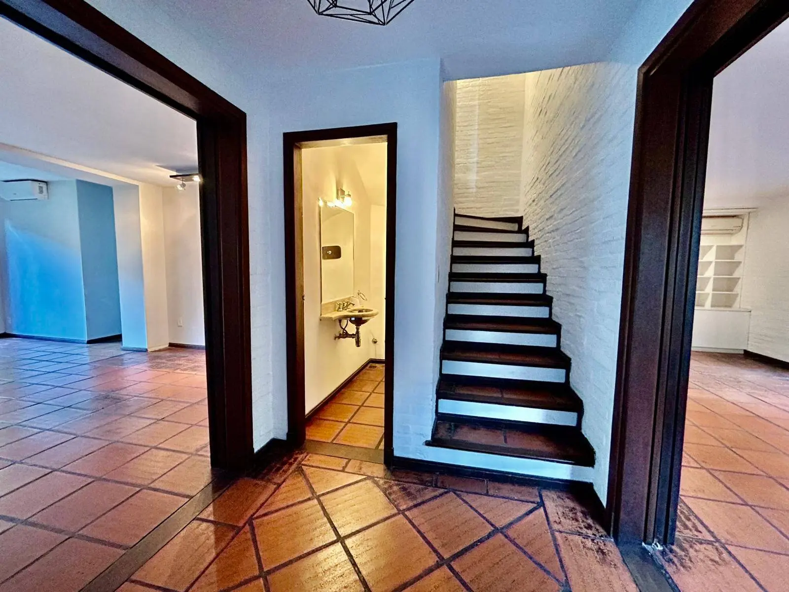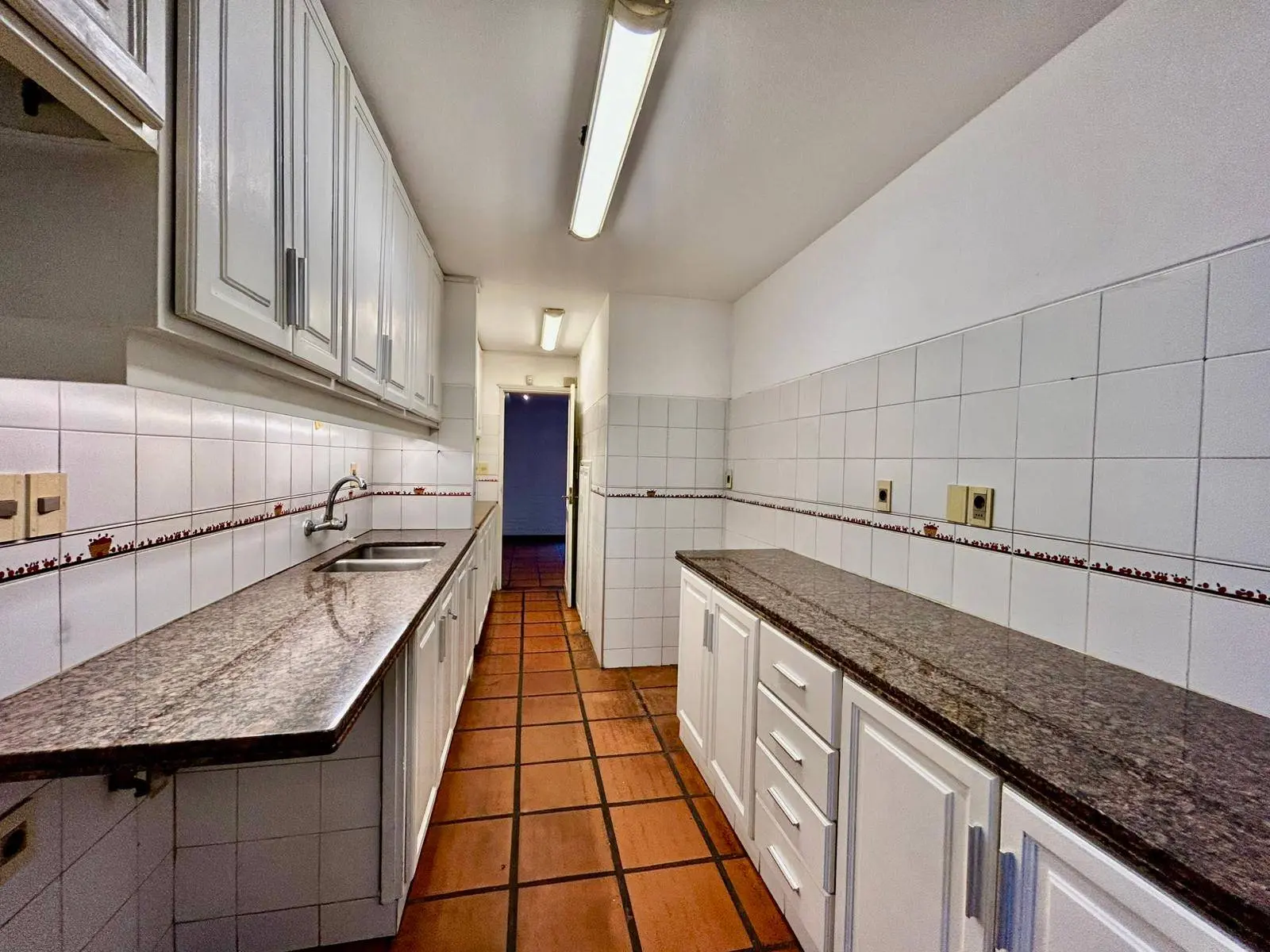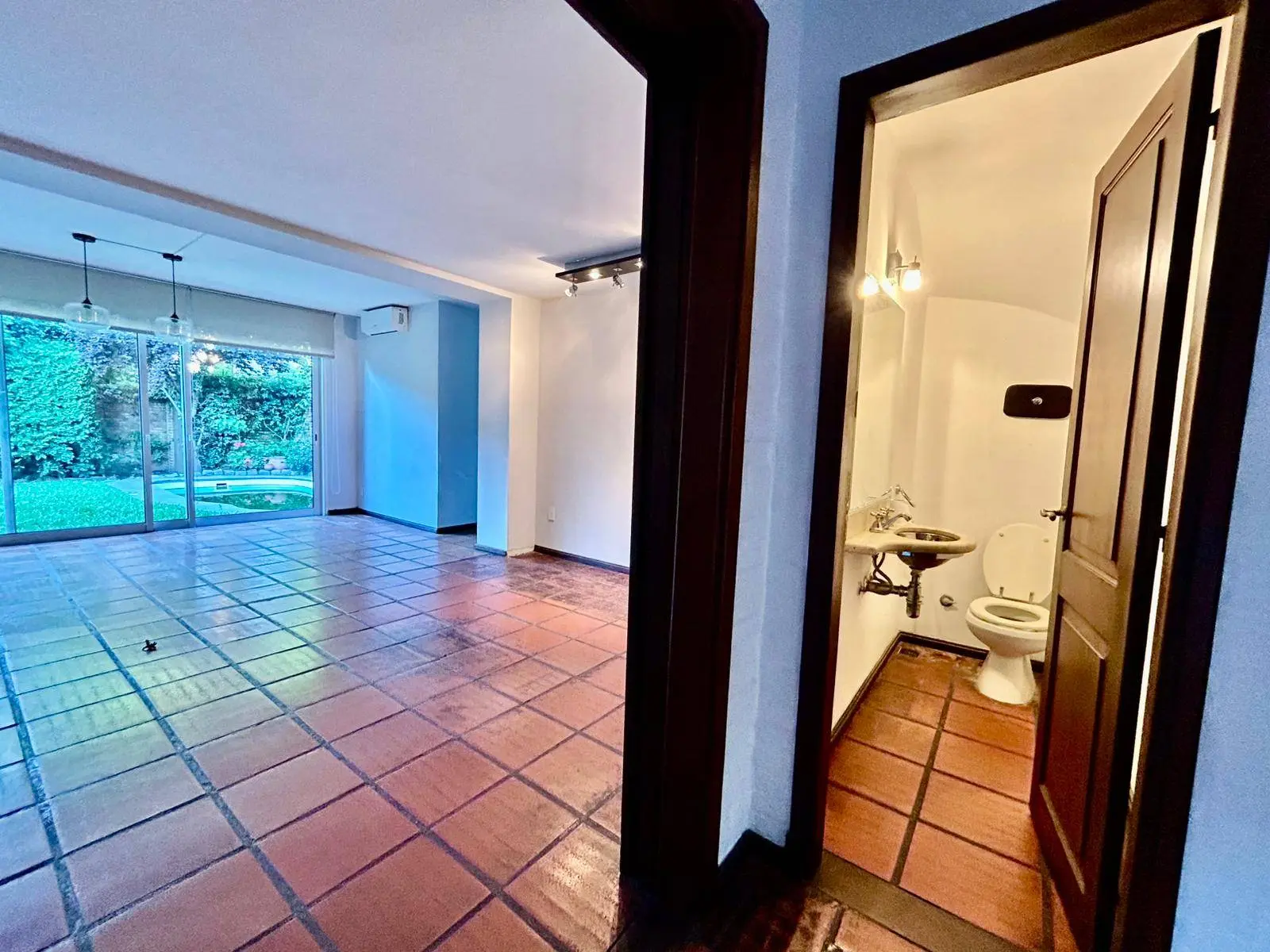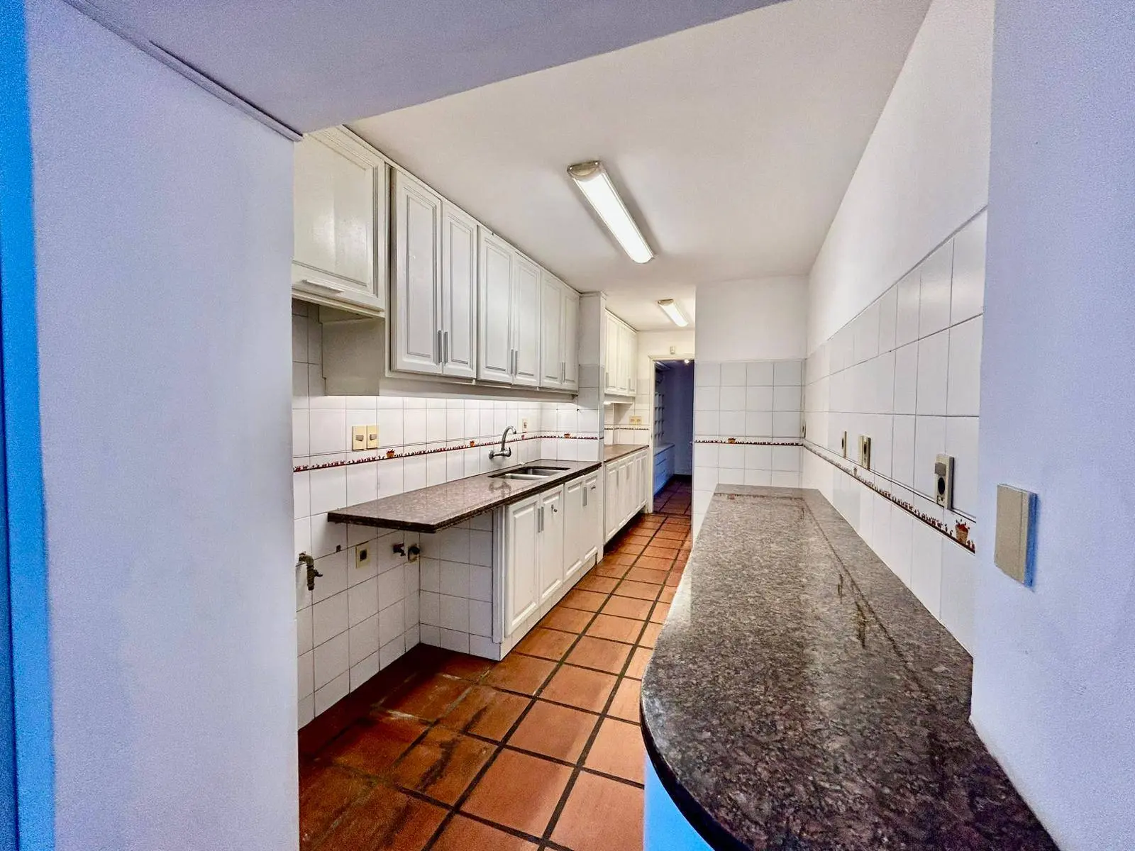 baño social y gran cocina a lo largo que conecta ambos ambientes.
