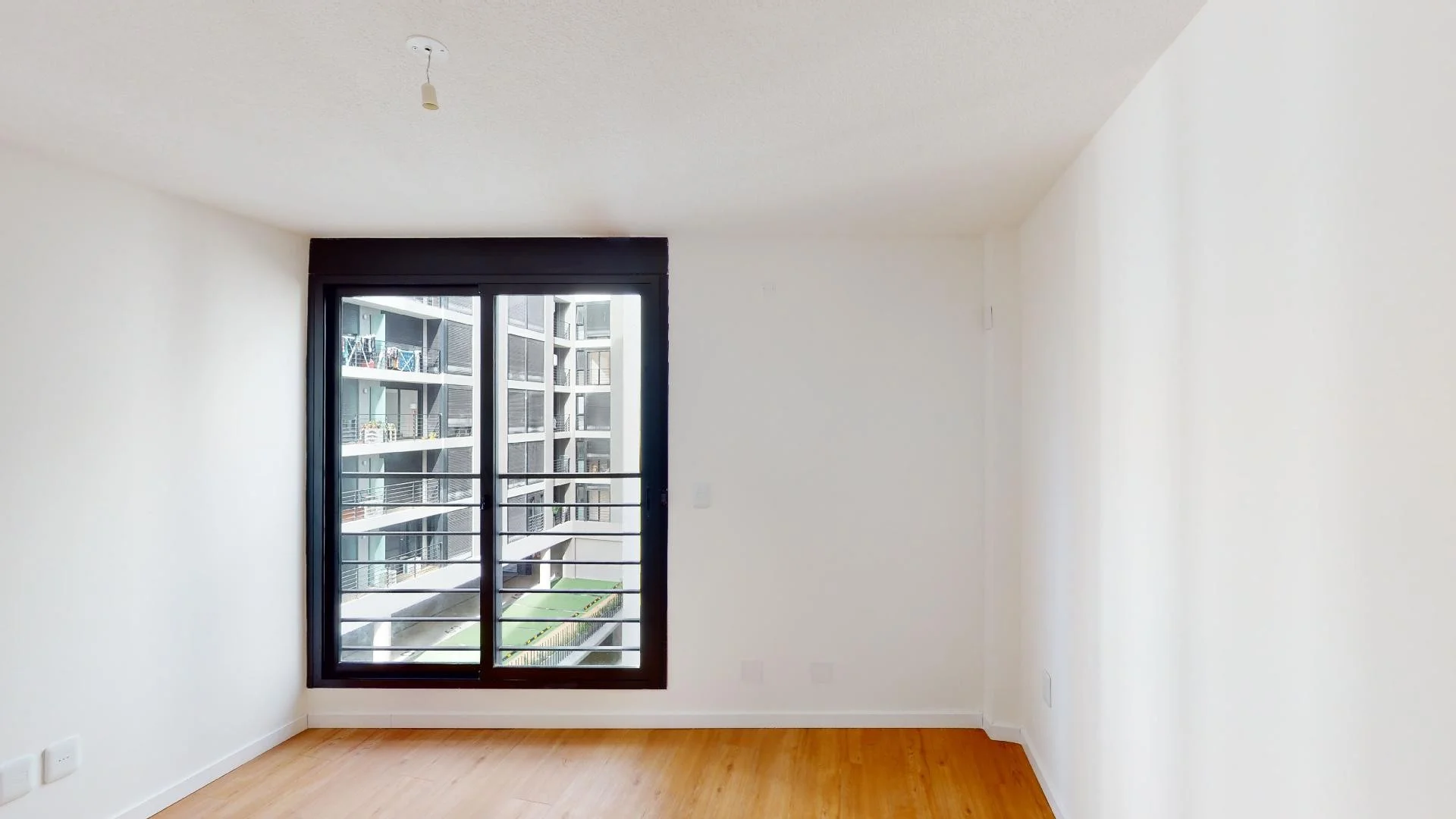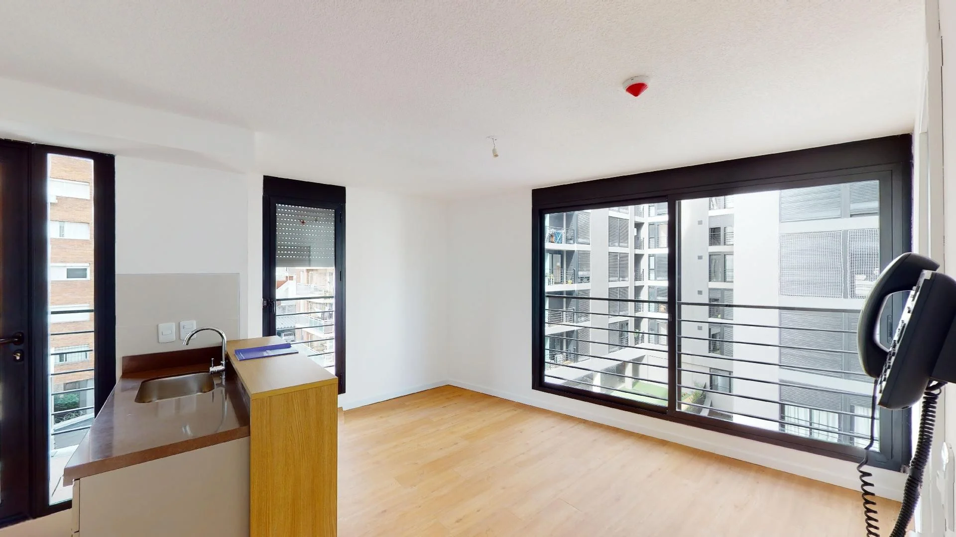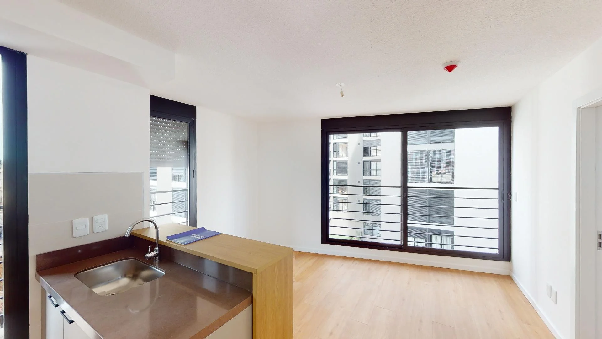 El apartamento dispone de living amplio, cocina integrada con muebles bajo mesada, 1 dormitorio con ventanales y baño completo.