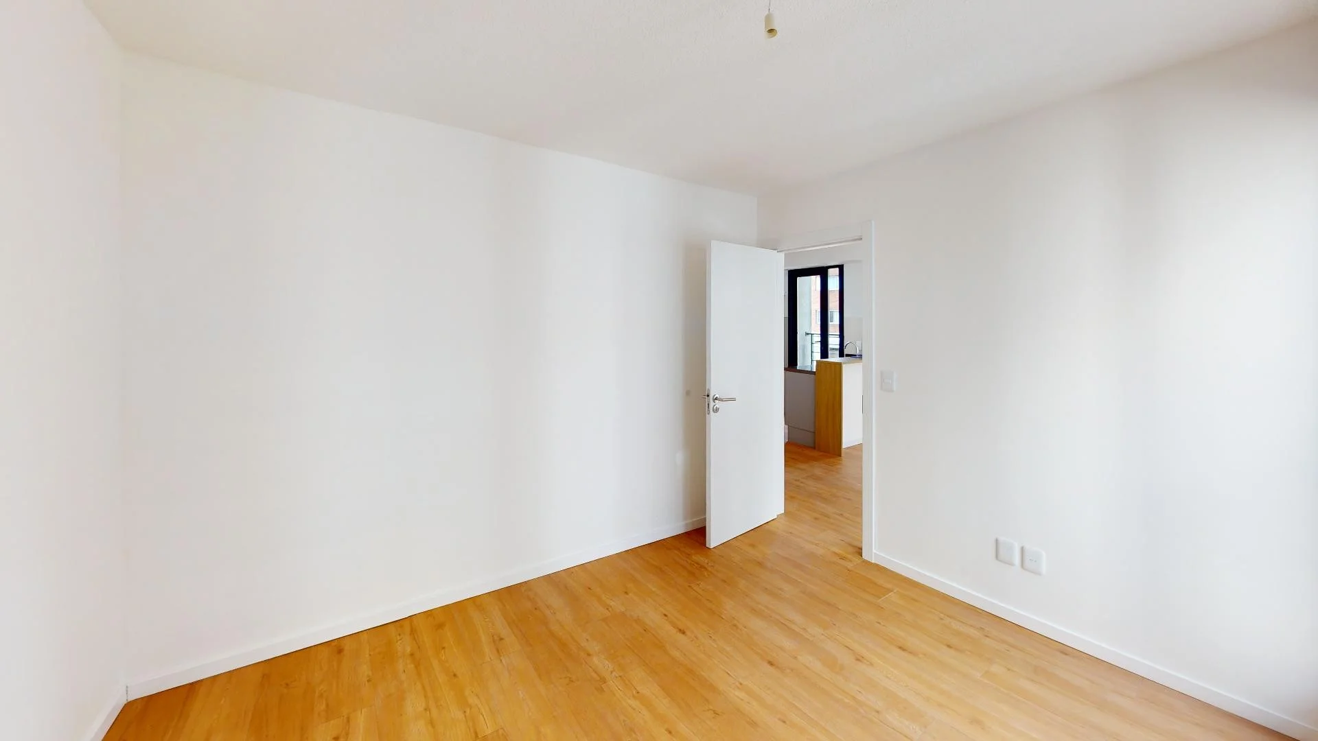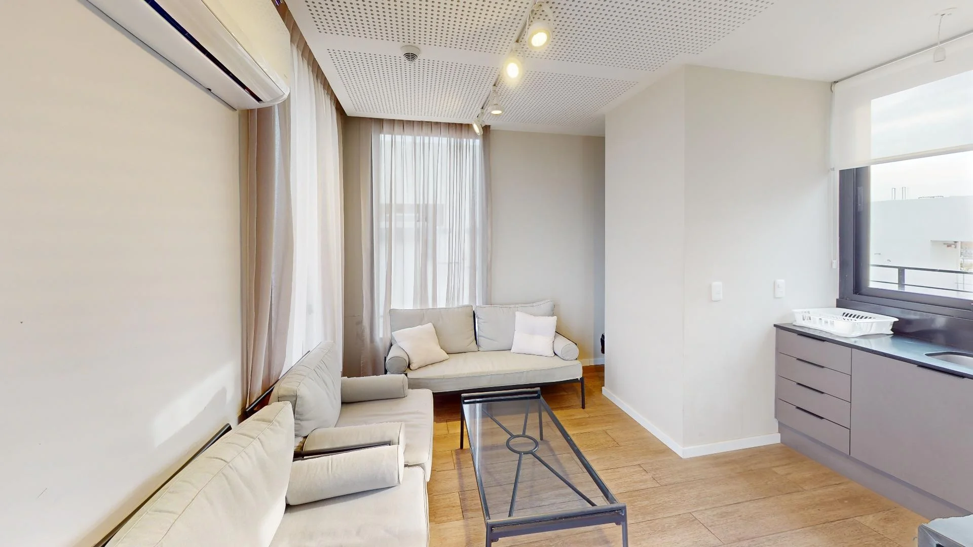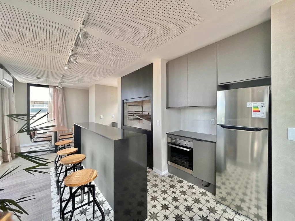 El apartamento dispone de living amplio, cocina integrada con muebles bajo mesada, 1 dormitorio con ventanales y baño completo.
